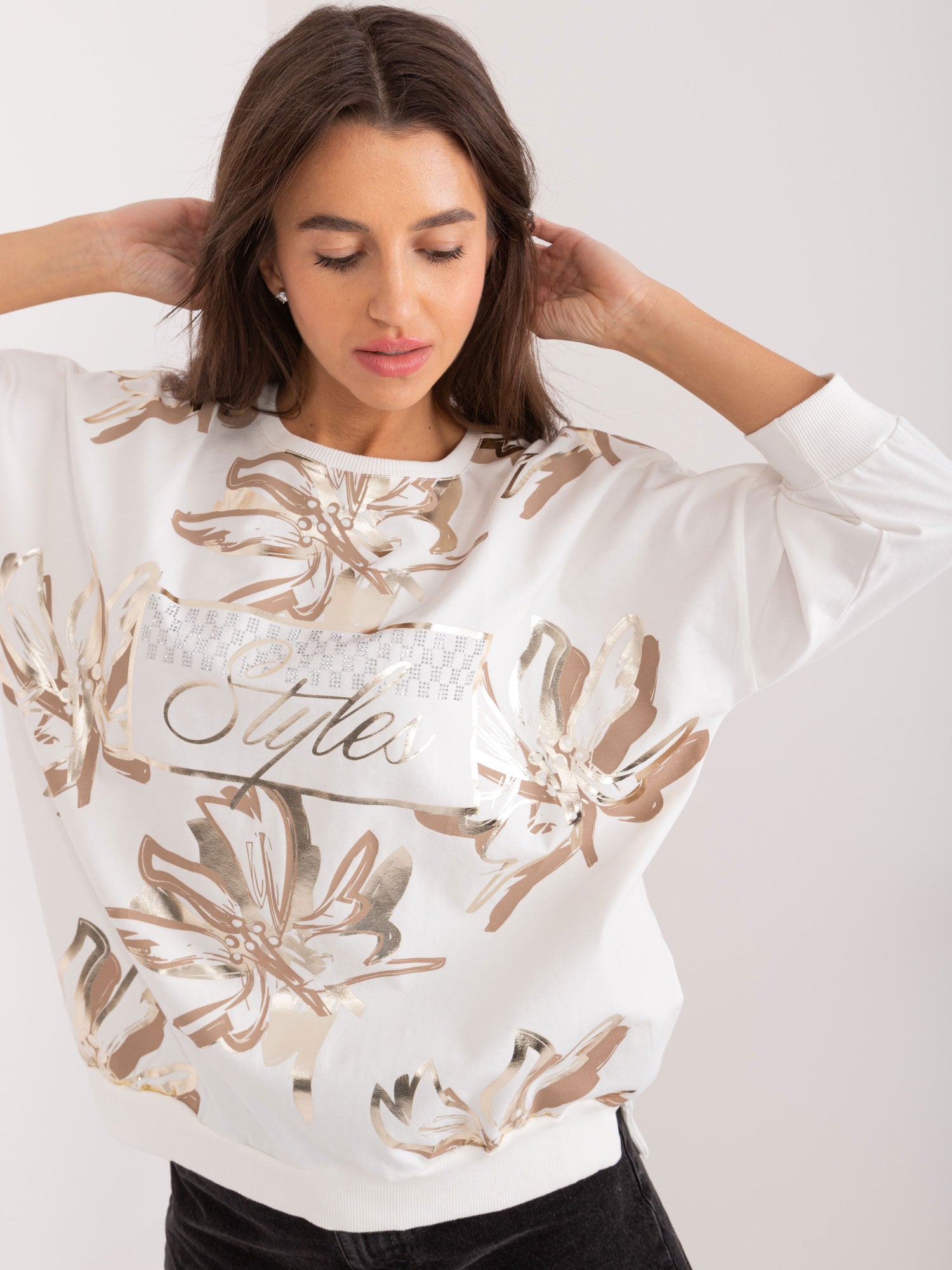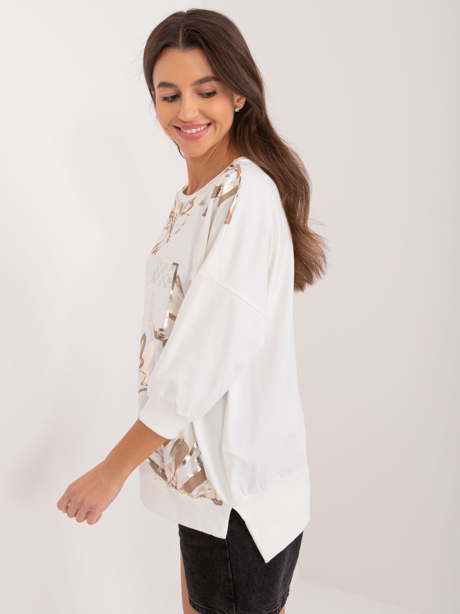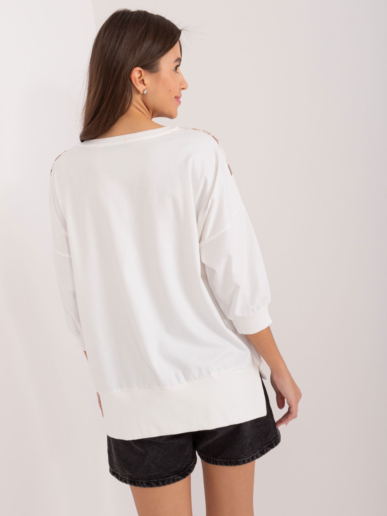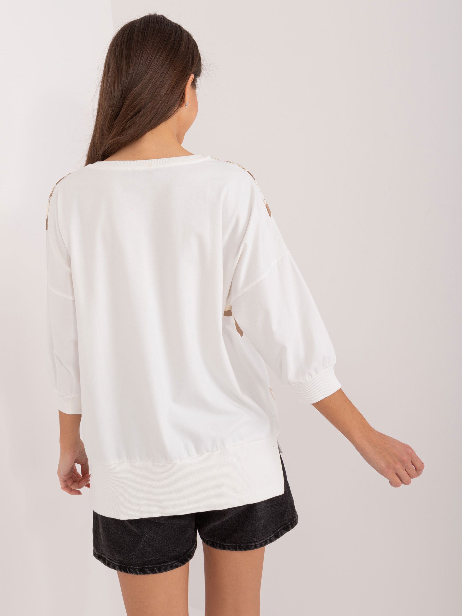 Wymiary bluzki w rozmiarze one size mierzone na płasko: szerokość pod pachami - 64 cm, długość całkowita (przód) - 61 cm, długość całkowita (tył) - 60 cm długość rękawa - 41 cm.