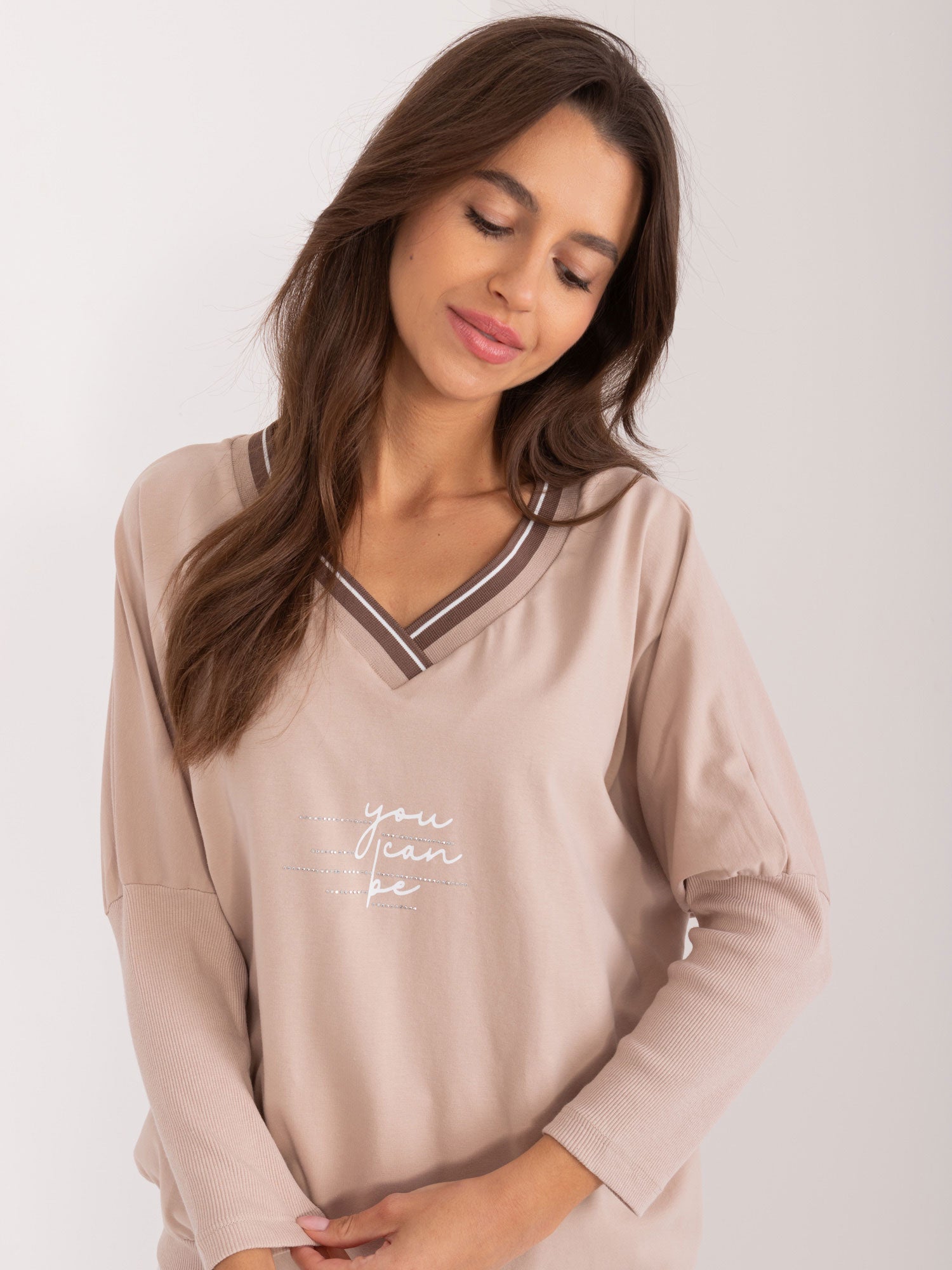 Wymiary bluzki w rozmiarze one size mierzone na płasko: szerokość pod pachami - 69 cm, długość rękawa - 44 cm, długość całkowita - 61 cm.