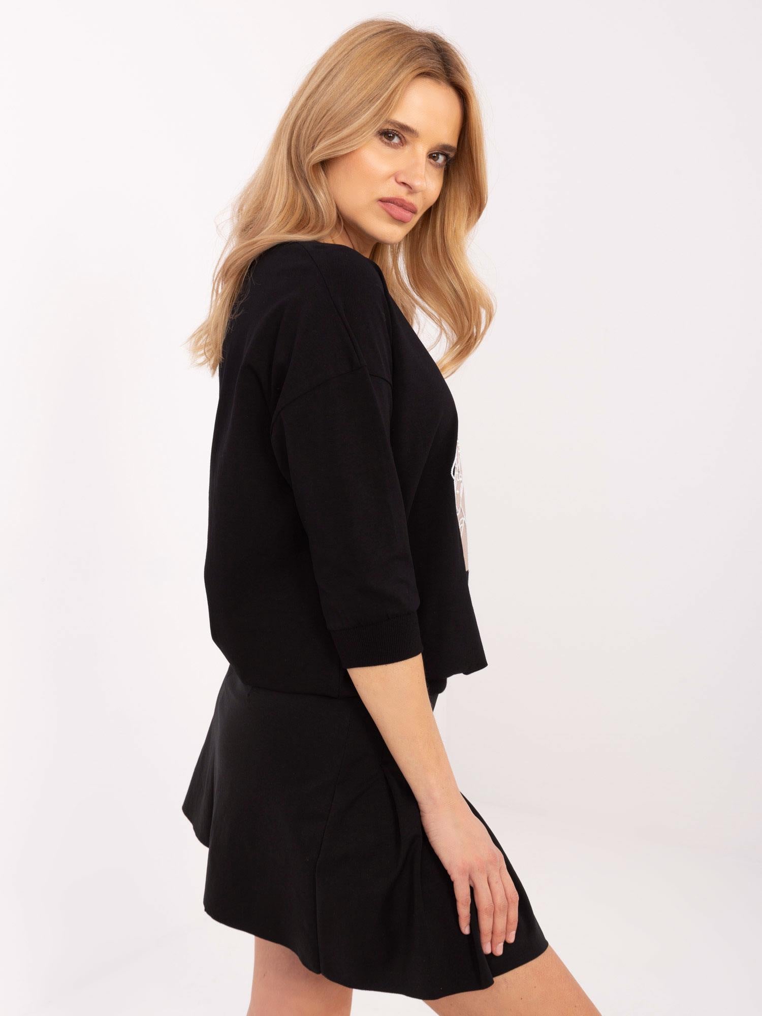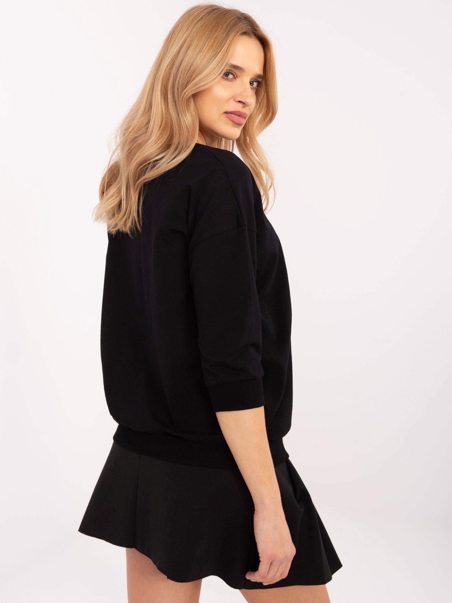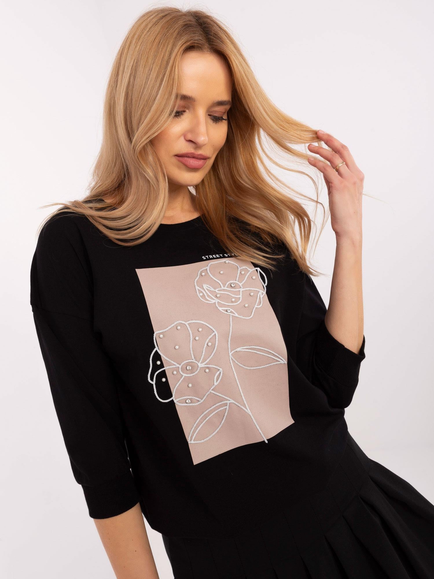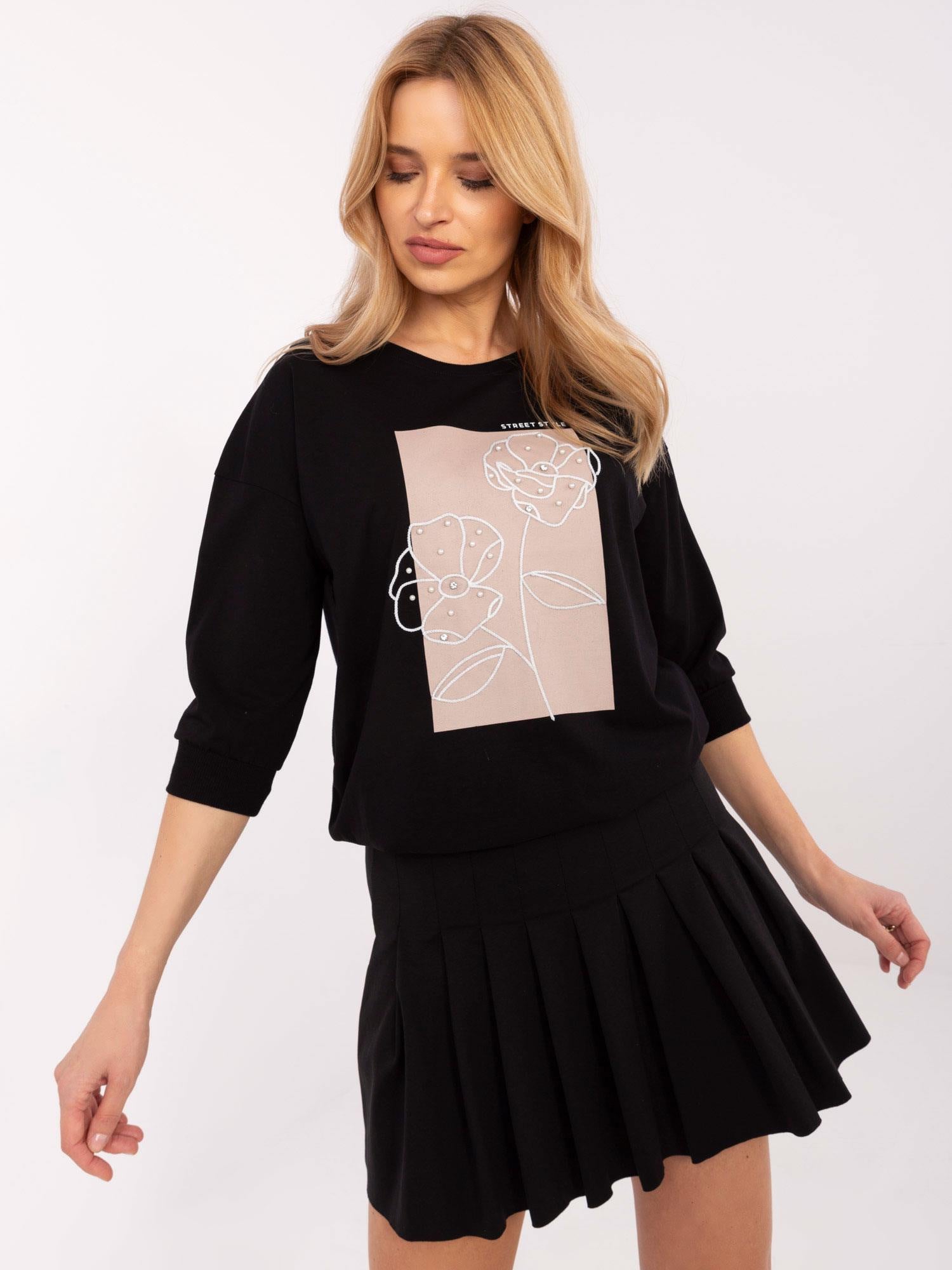 Wymiary bluzki w rozmiarze one size mierzone na płasko: szerokość pod pachami - 62 cm, długość rękawa - 26 cm (od szwu), długość całkowita - 59 cm, szerokość w biodrach - 46 cm (na płasko).