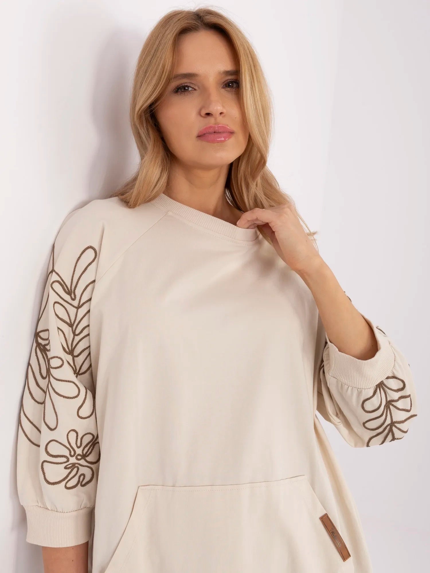Wymiary bluzy w rozmiarze one size mierzone na płasko: szerokość bluzy pod pachami - 64 cm długość rękawa - 29 cm (od pachy), szerokość w biodrach - 48 cm, długość bluzy - 67 cm.