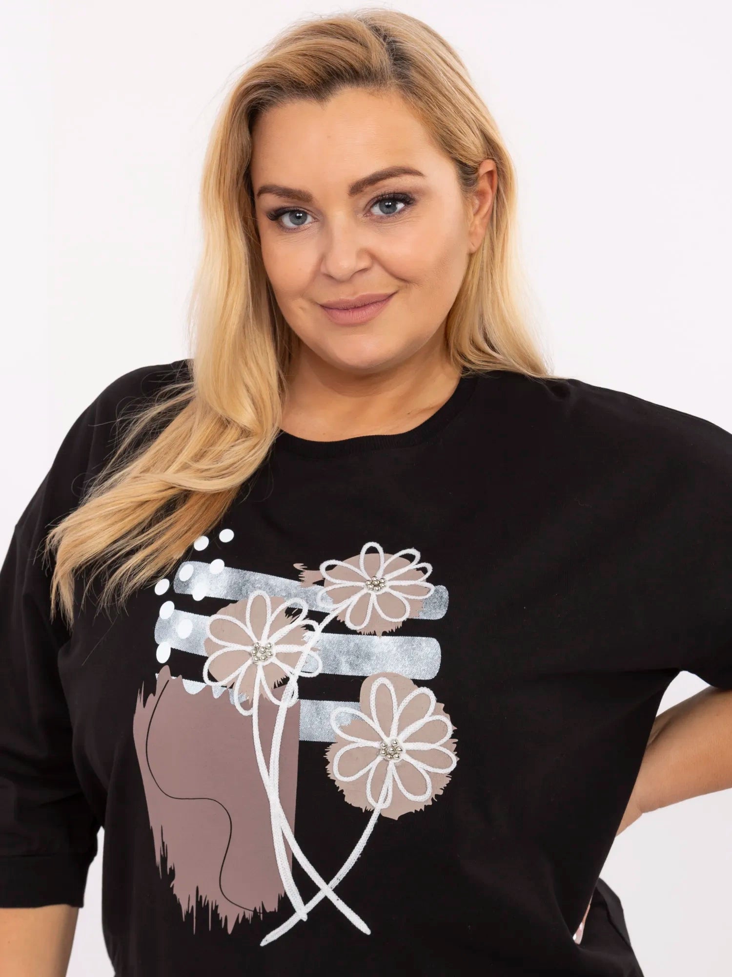 Wymiary bluzki w rozmiarze one size mierzone na płasko: szerokość pod pachami - 67 cm, długość rękawa - 33 cm (od szwu), szerokość w biodrach - 51 cm, długość całkowita - 64 cm .