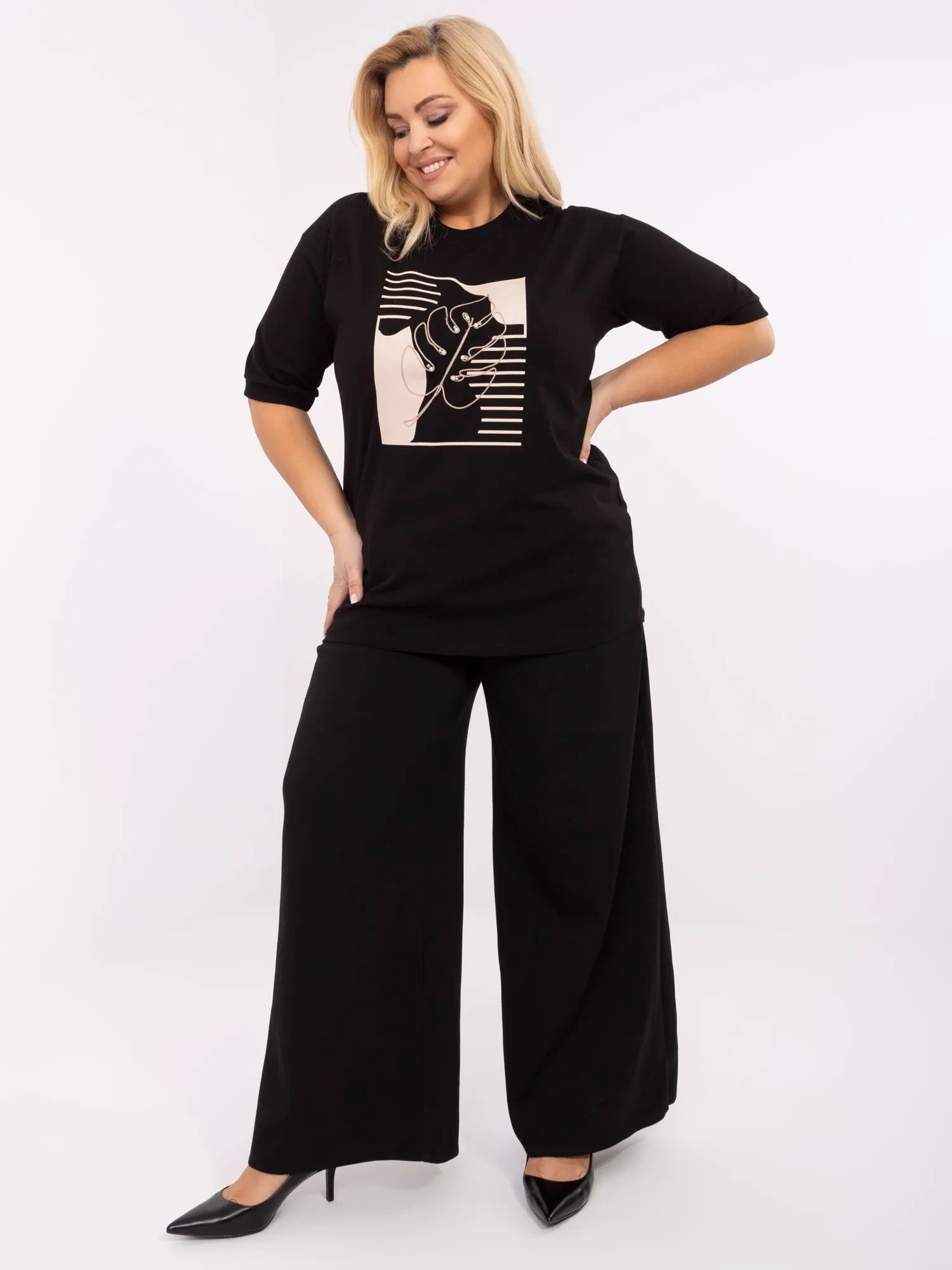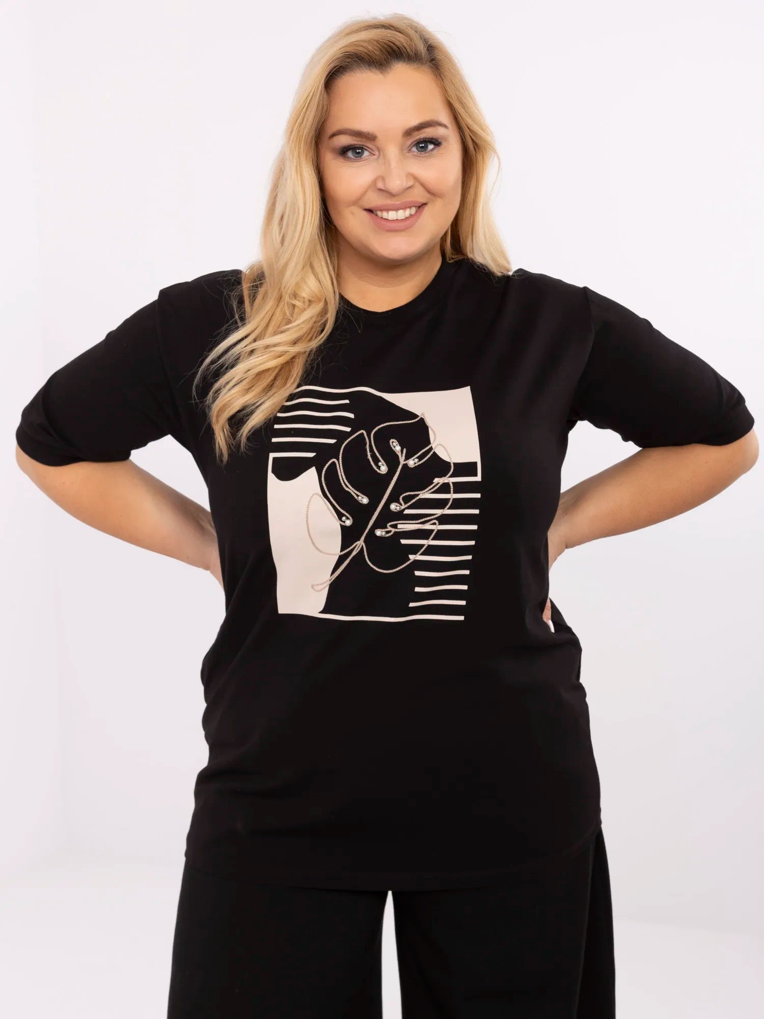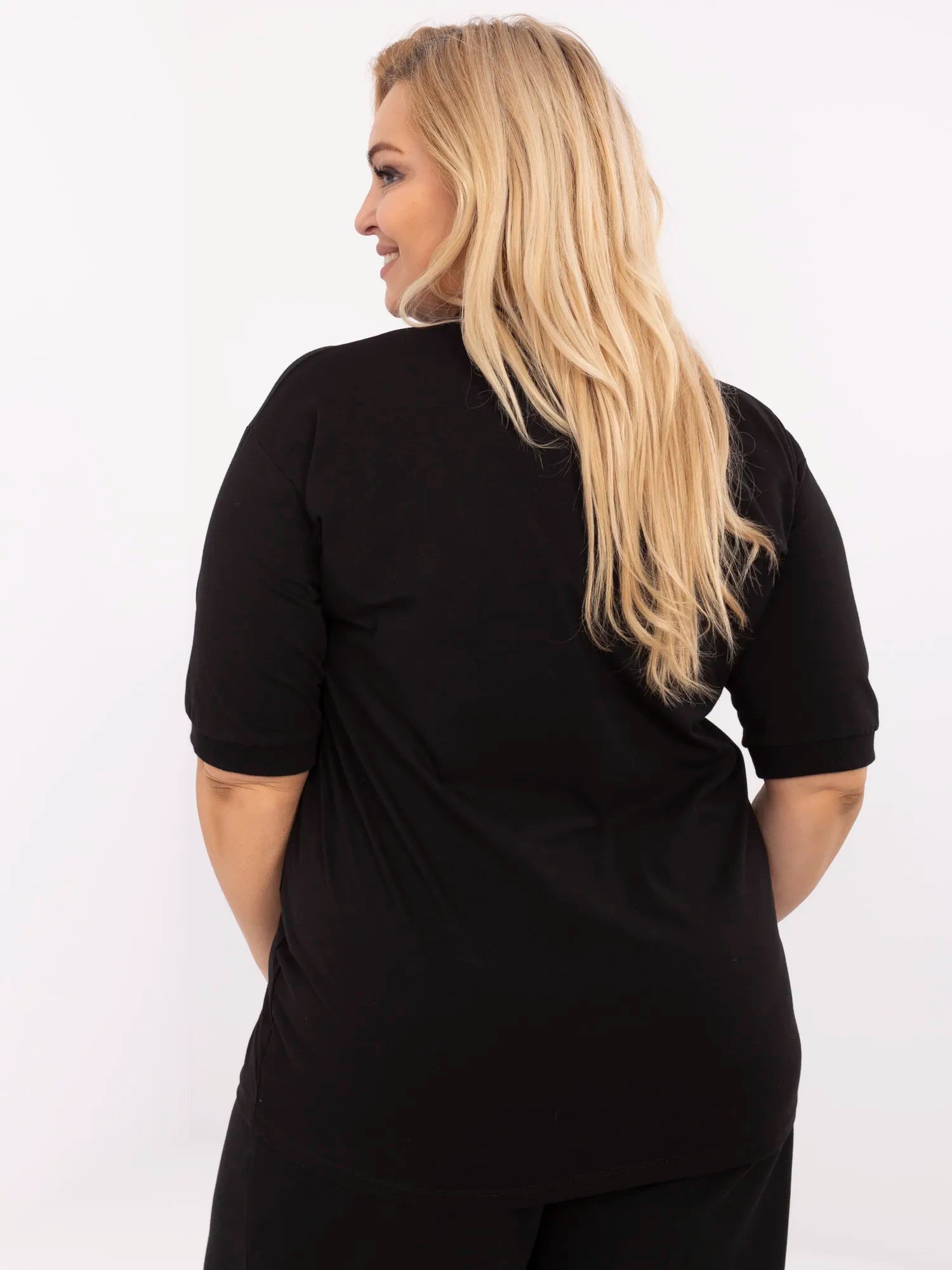 Wymiary bluzki w rozmiarze one size mierzone na płasko: szerokość pod pachami - 61 cm, długość rękawa - 25 cm (od szwu), szerokość w biodrach - 61 cm, długość całkowita - 74 cm.