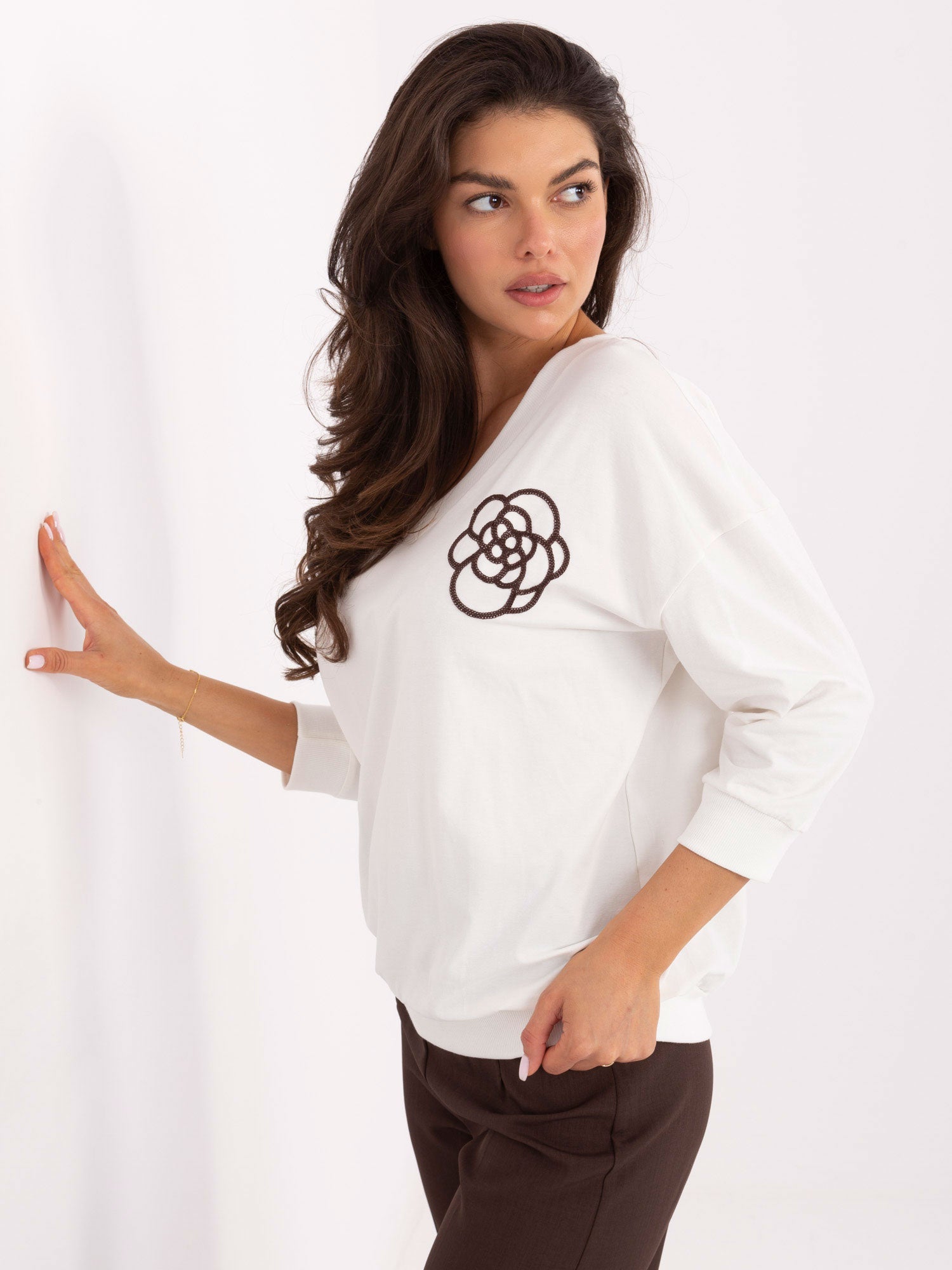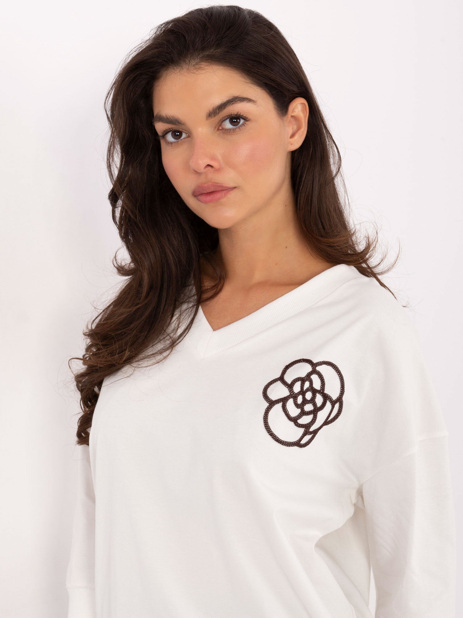 Wymiary bluzki w rozmiarze one size mierzone na płasko: szerokość pod pachami - 61 cm, długość rękawa - 33 cm (od szwu), szerokość w biodrach - 43 cm, długość całkowita - 64 cm.