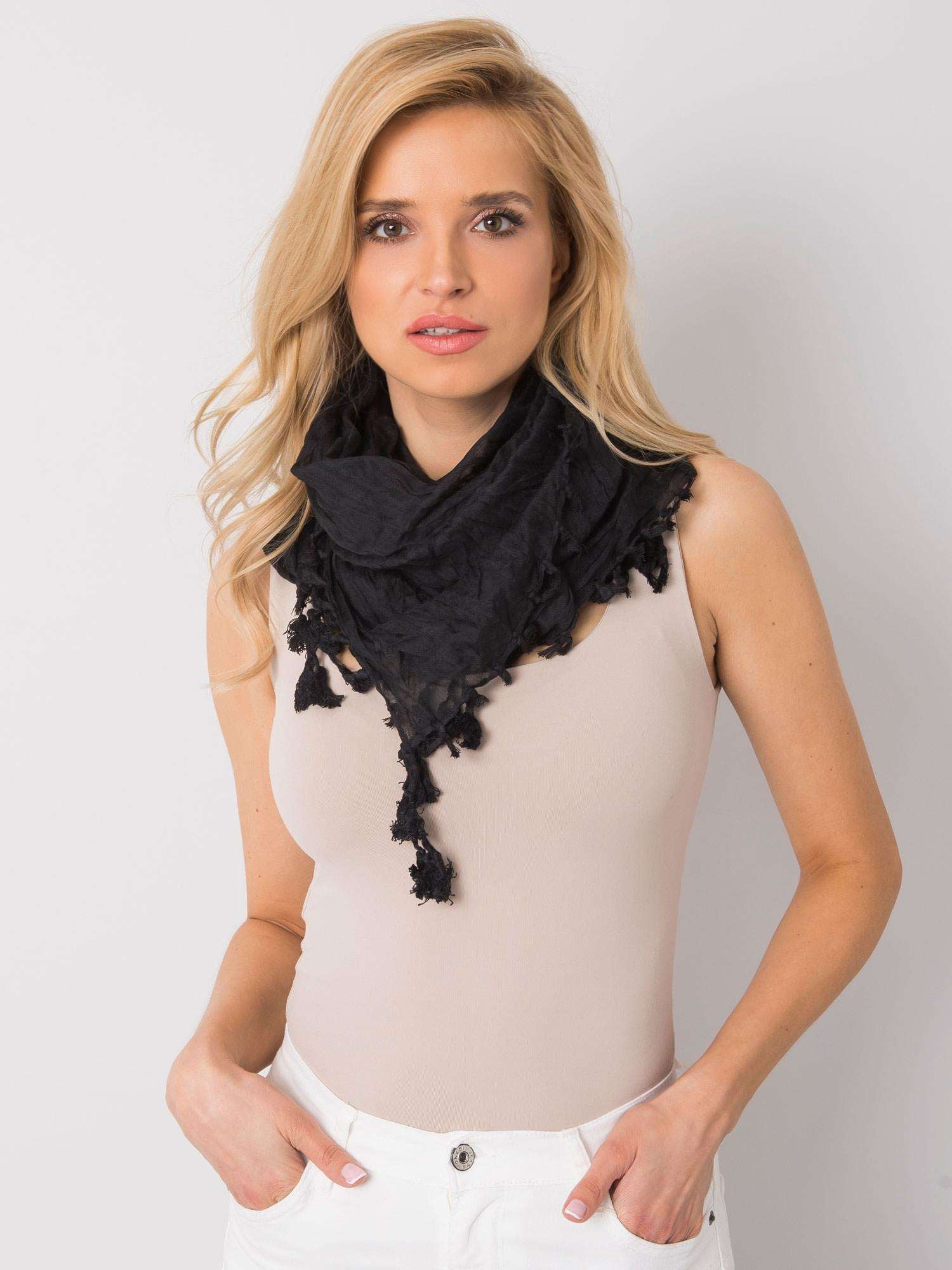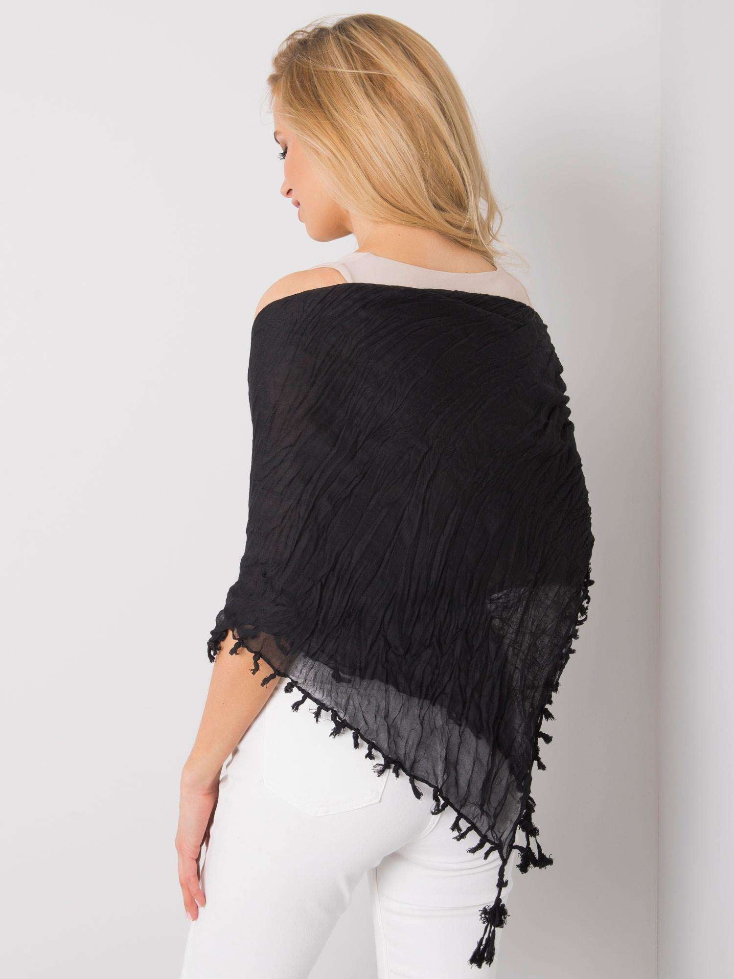 Czarna damska chusta z frędzlami.