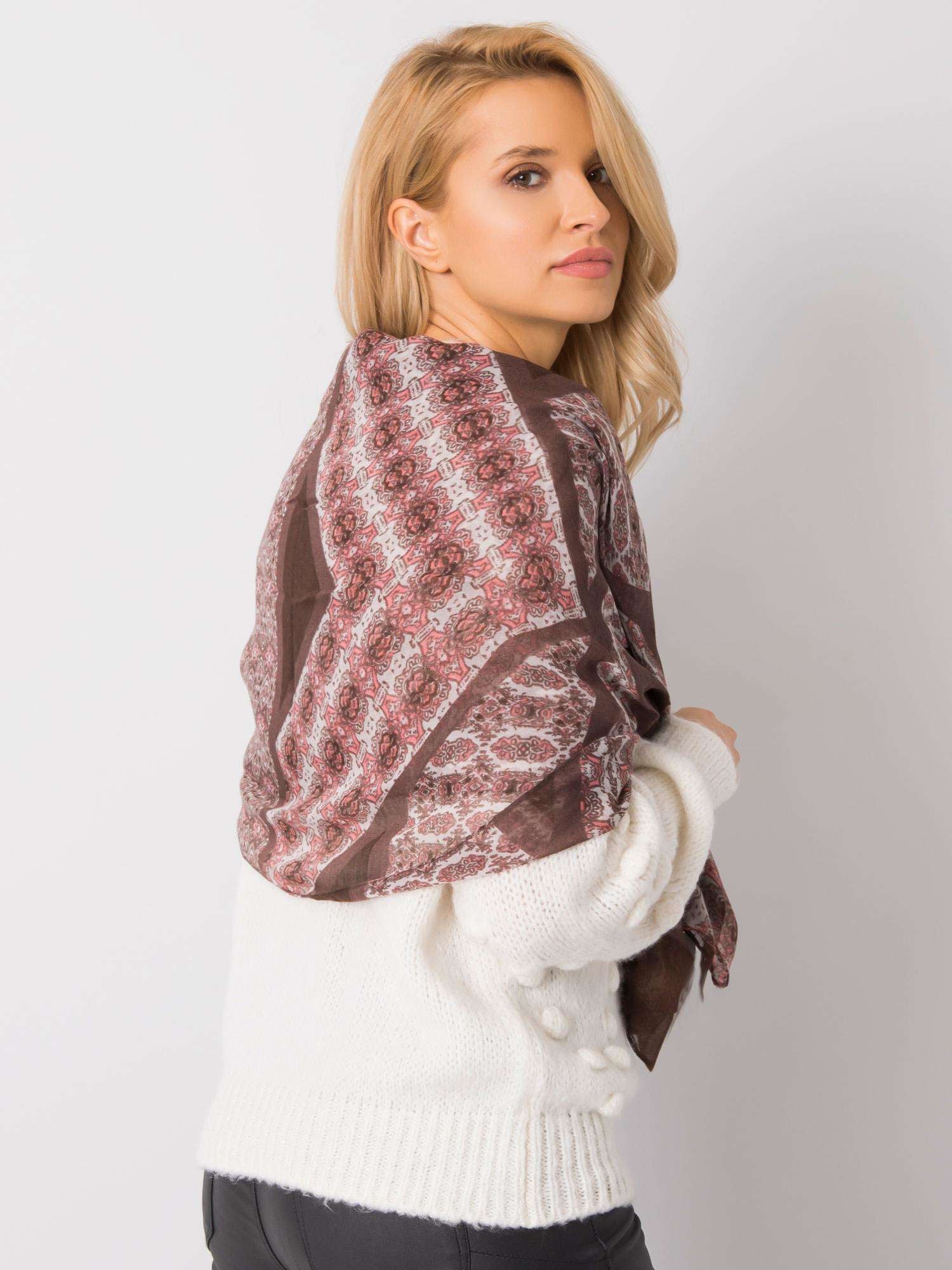 Brązowo-brzoskwiniowa chusta z printem.