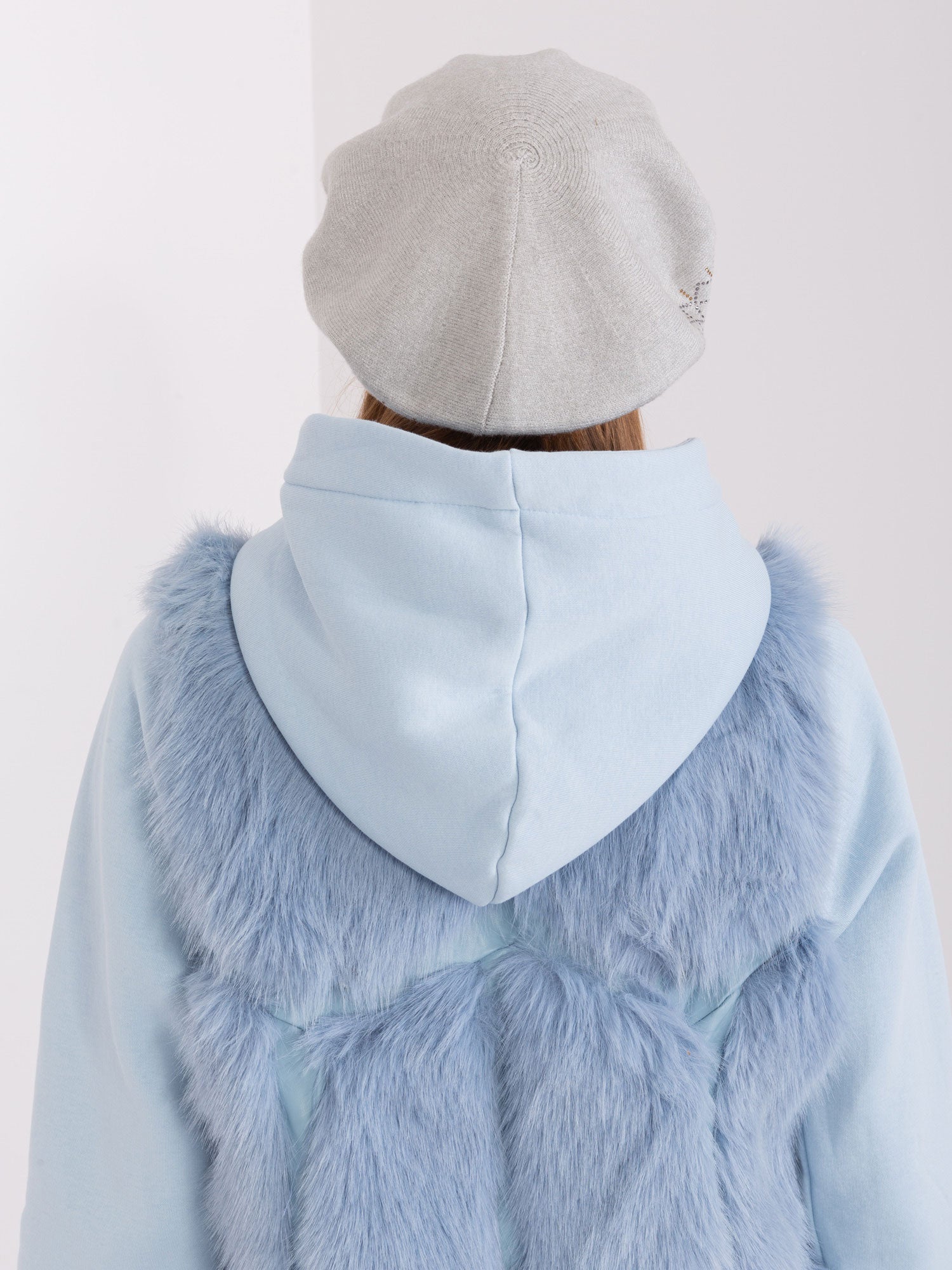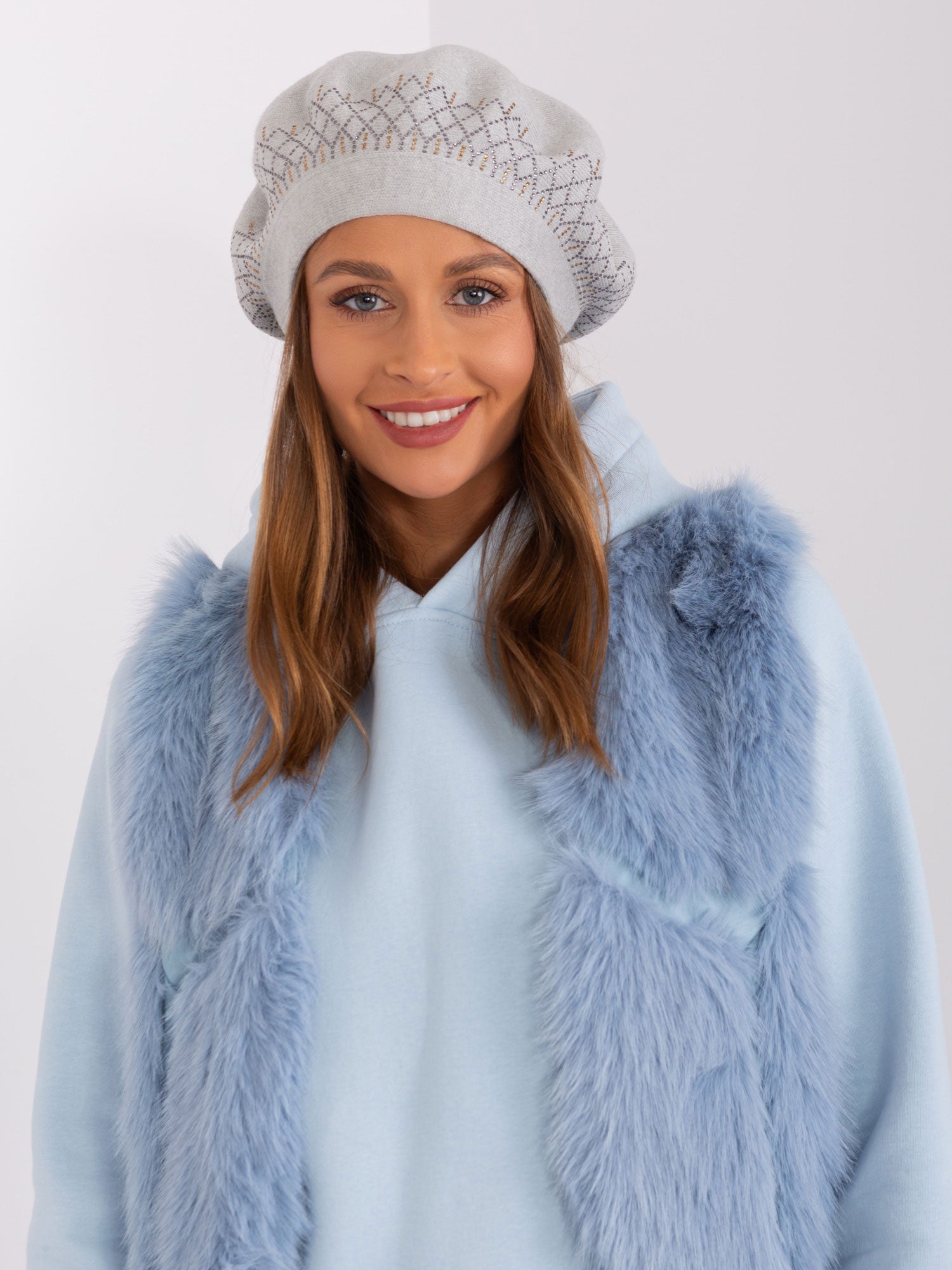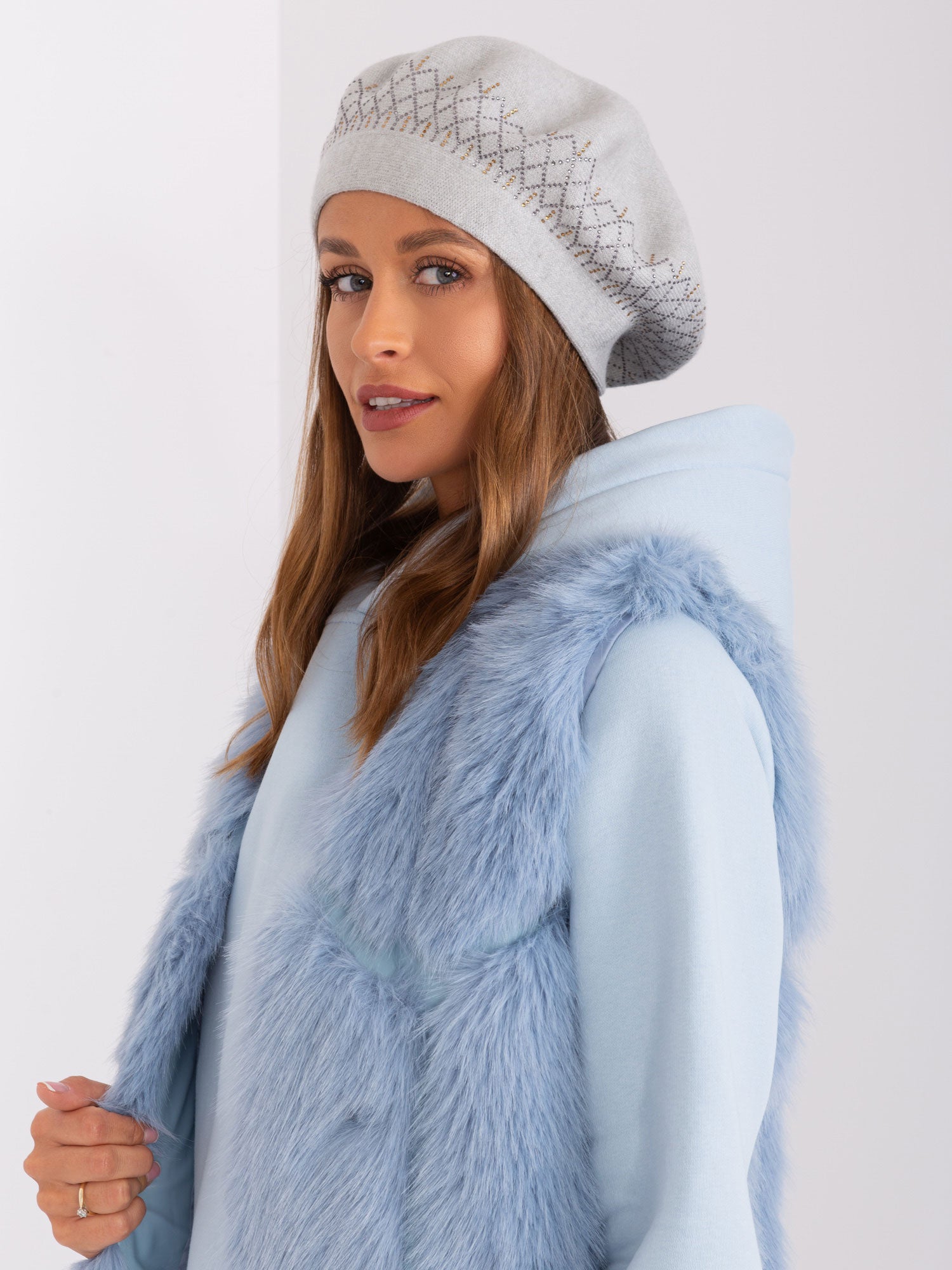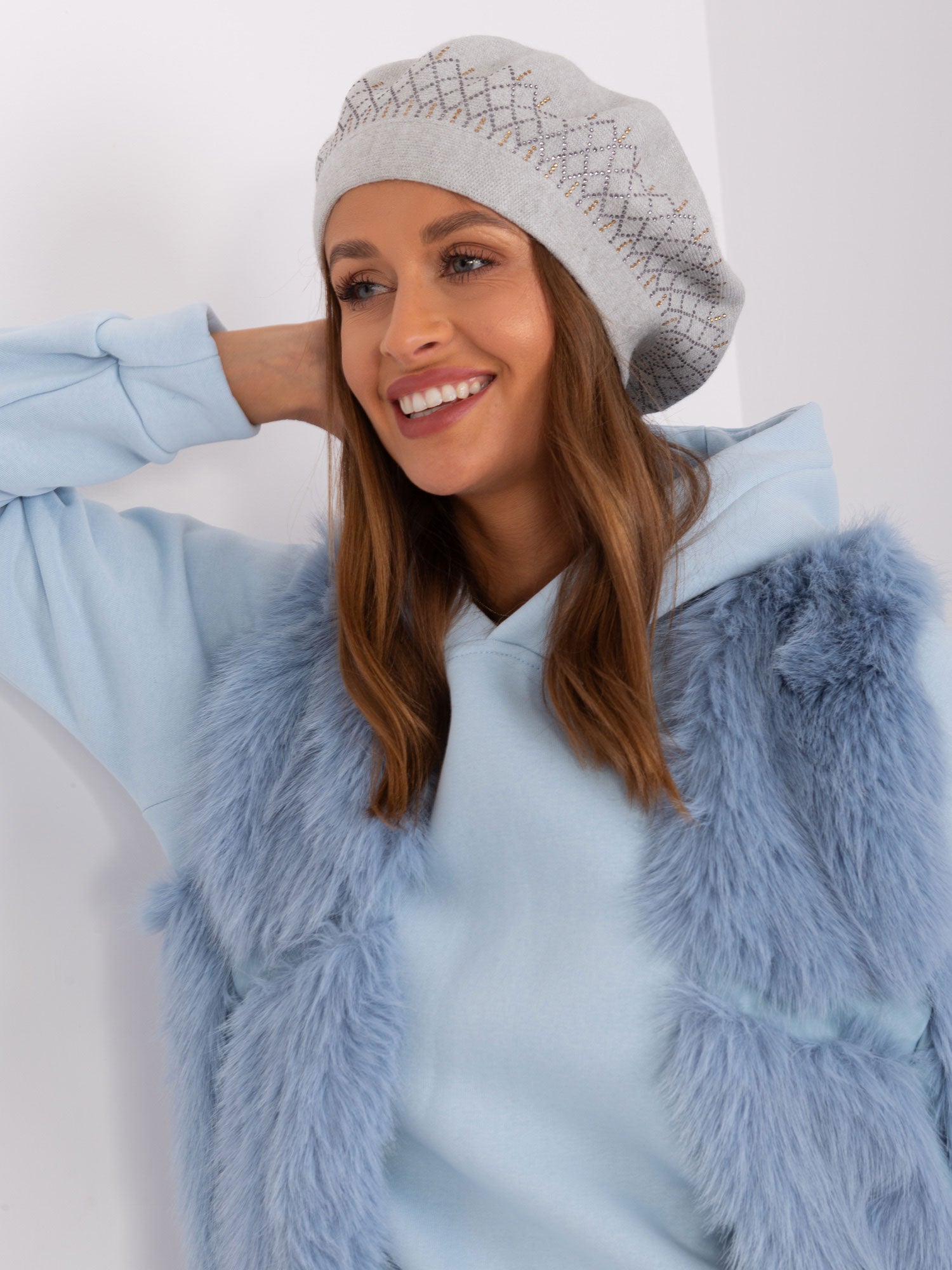 Jasnoszary beret z dzianiny.