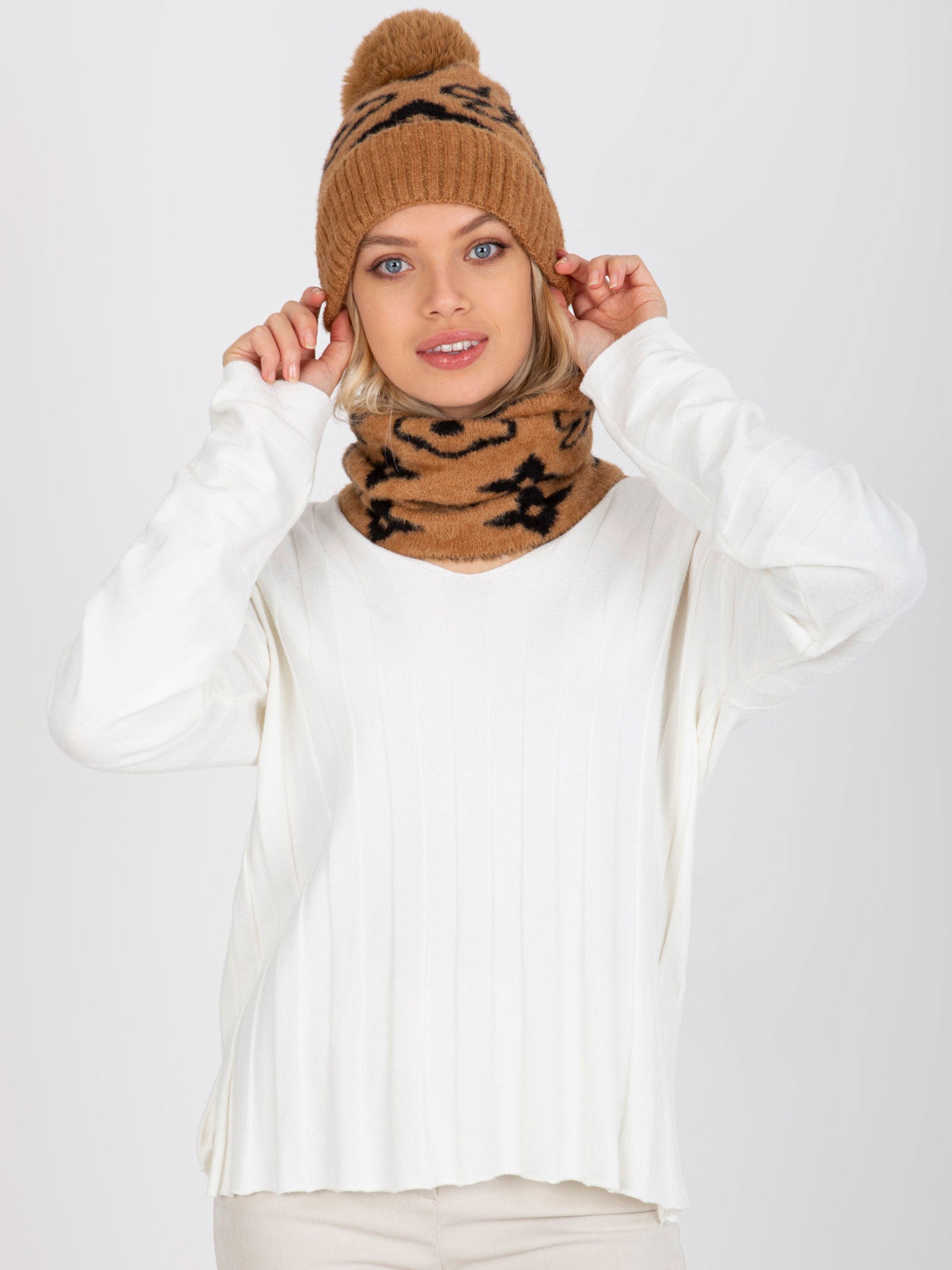 Camelowo-czarna damska czapka zimowa we wzory .