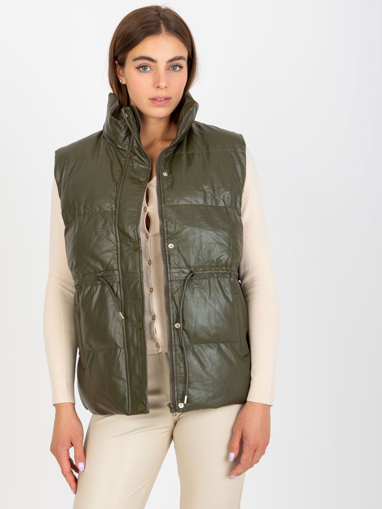 Khaki puchowa kamizelka z eko skóry z kieszeniami .