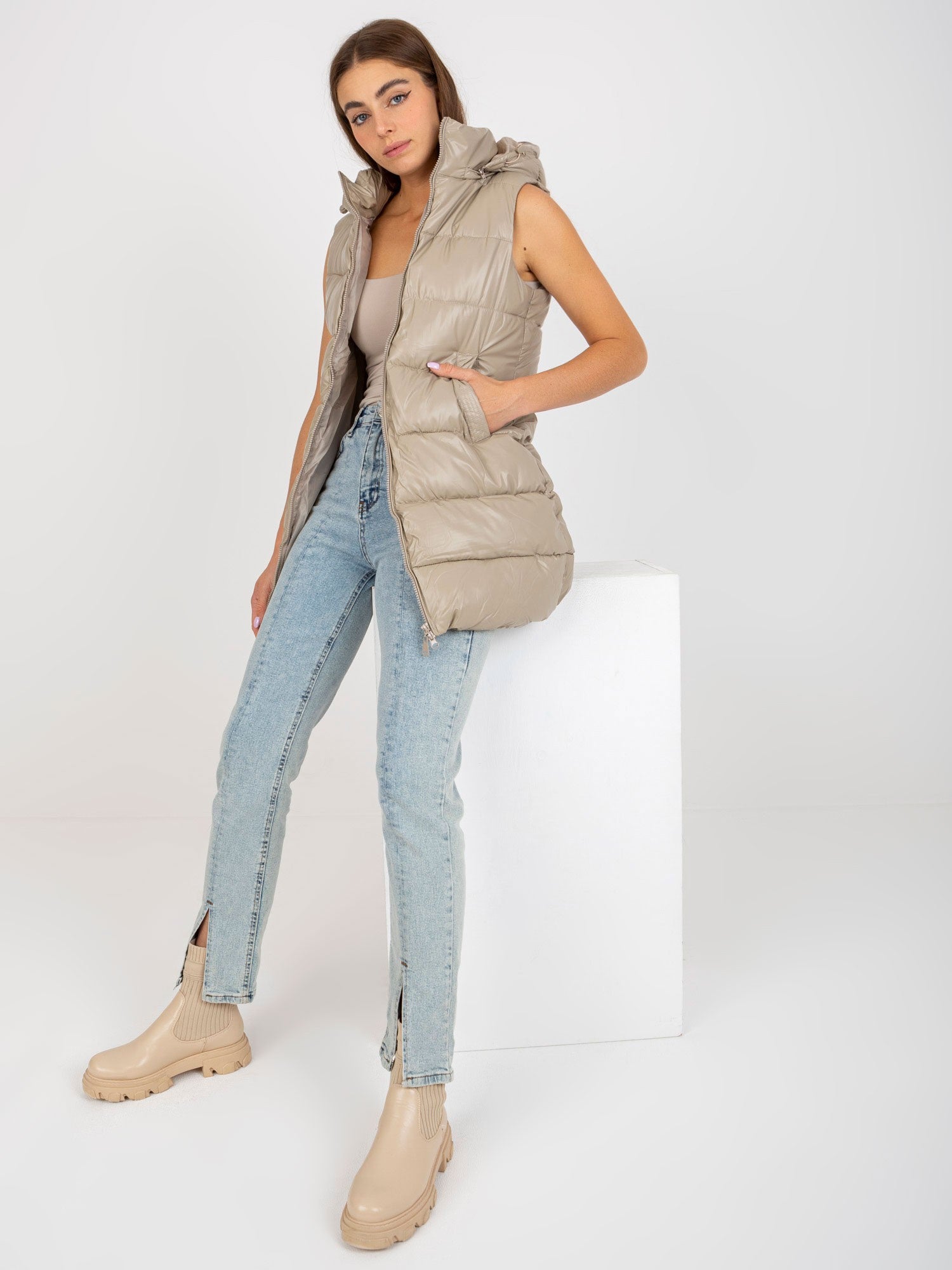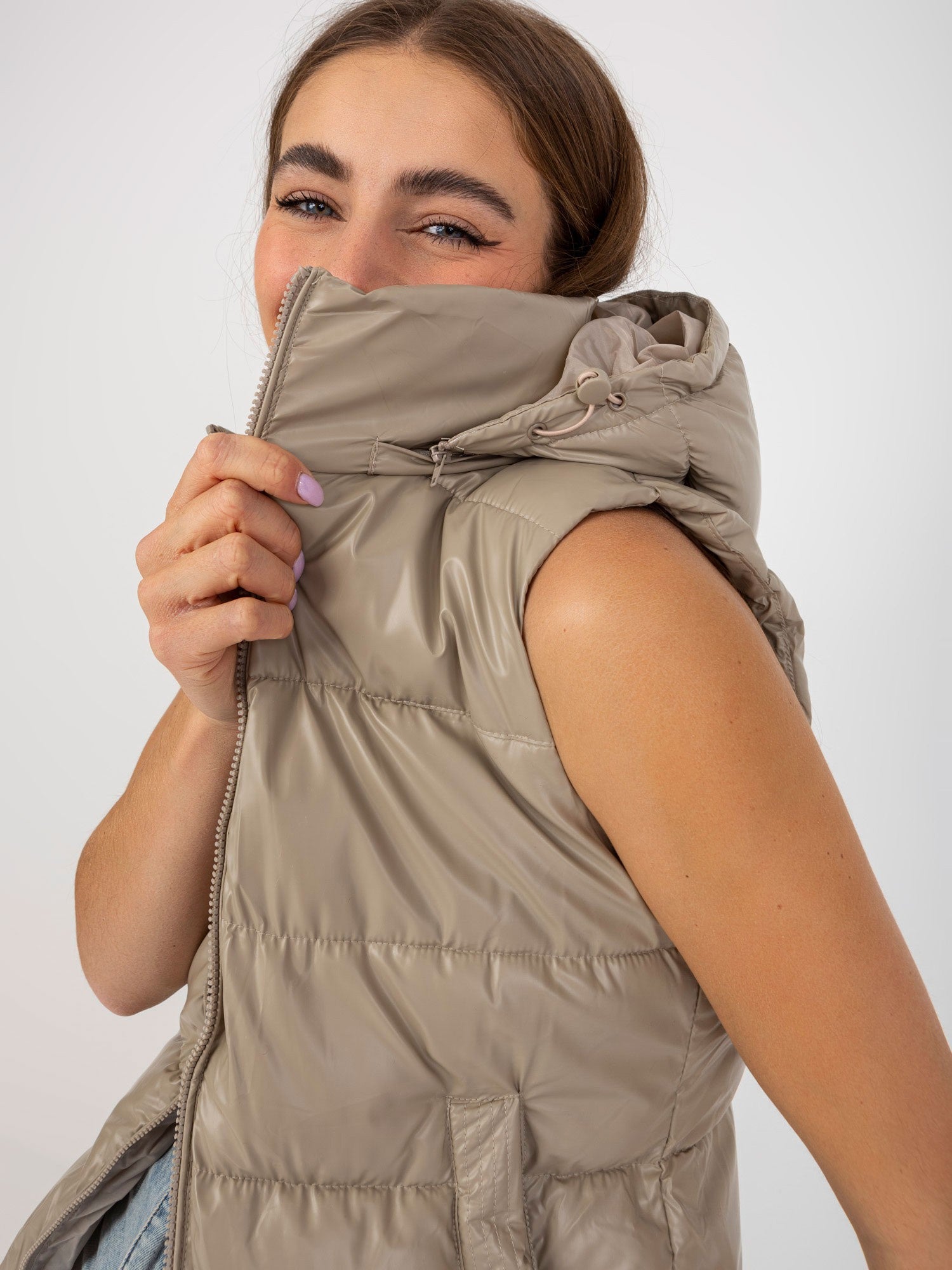 Ciemnobeżowa lakierowana kamizelka puchowa z pikowaniem .