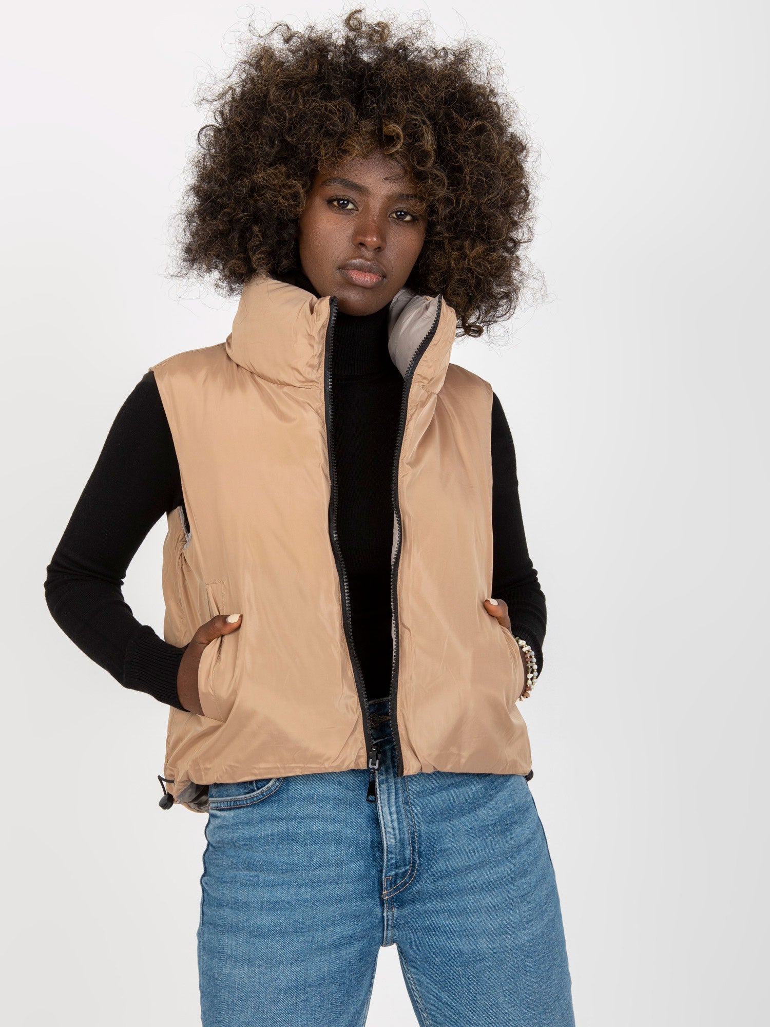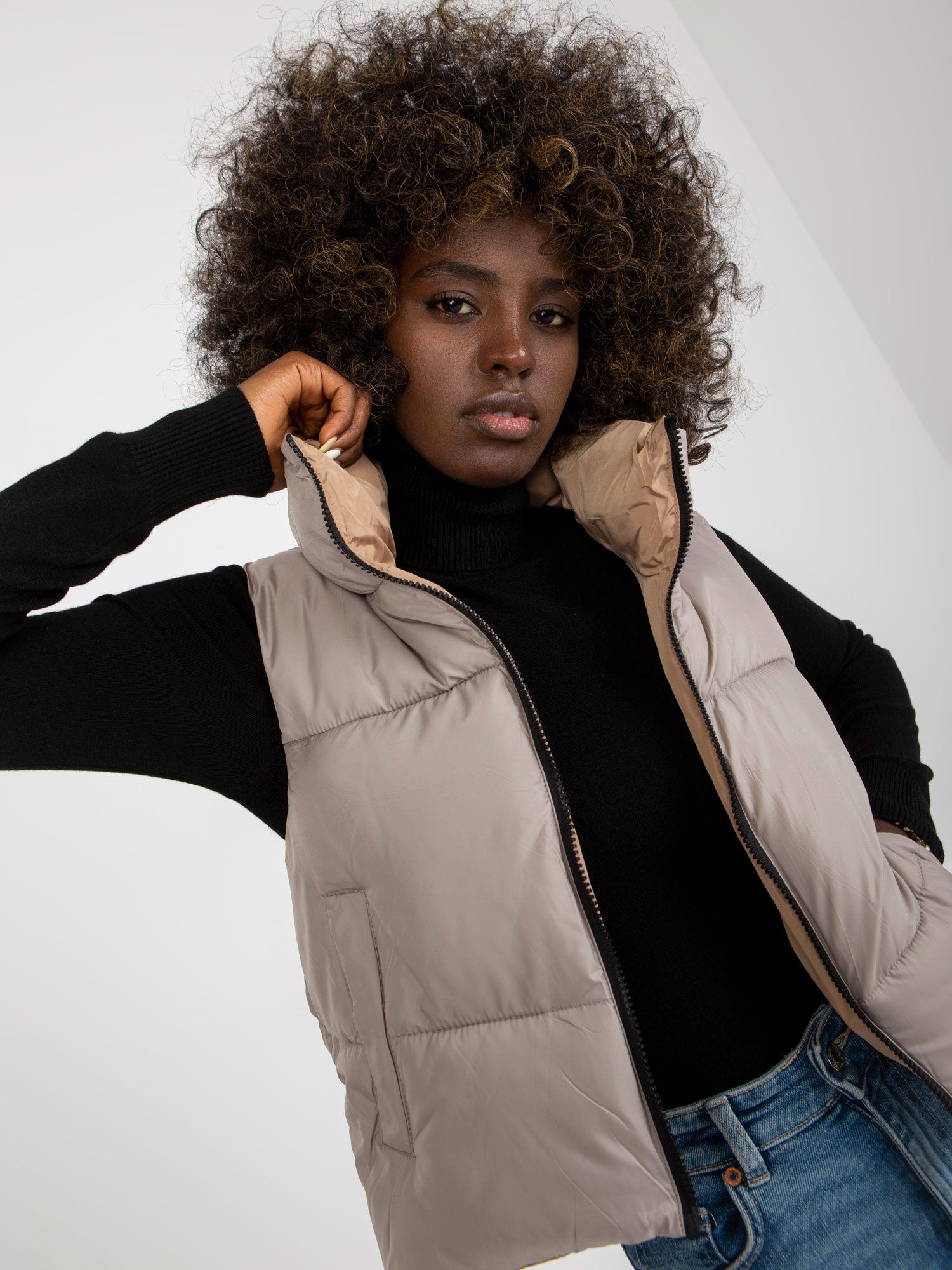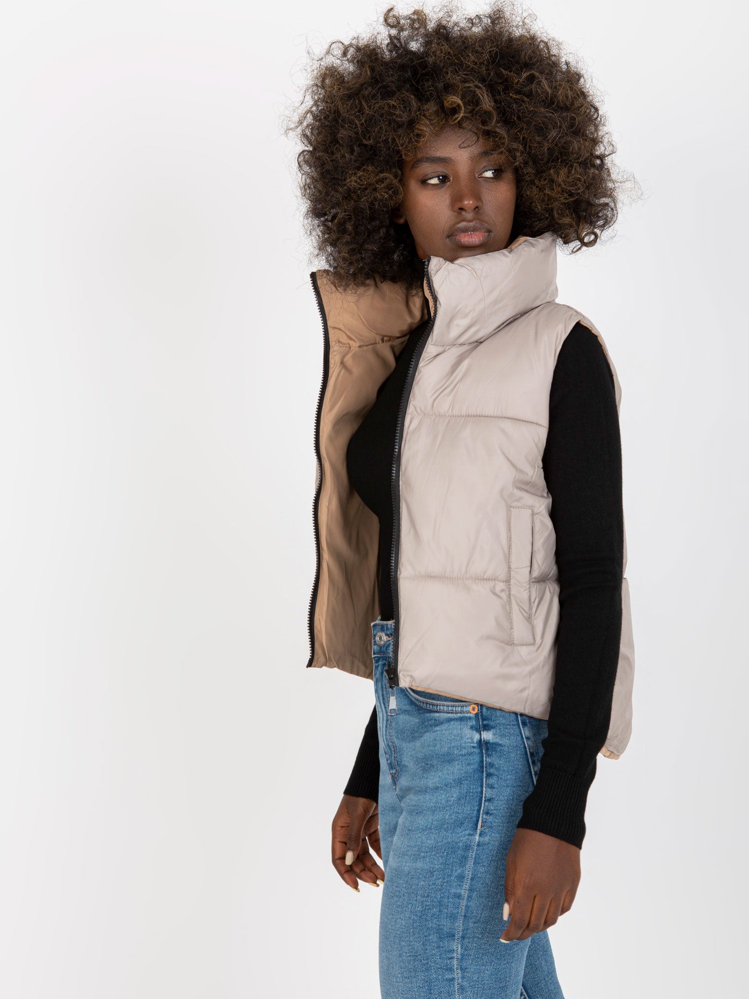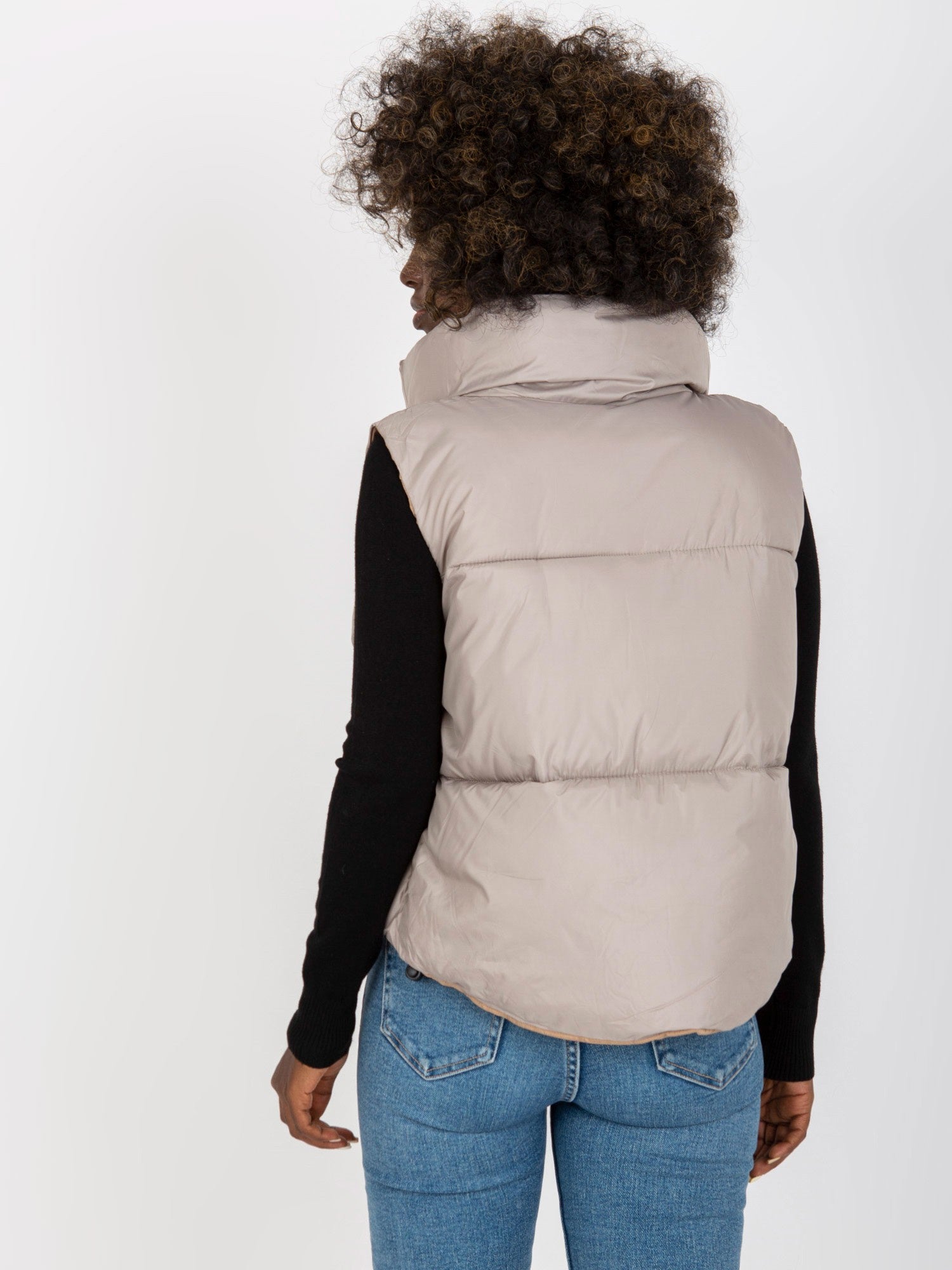 Jasnoszara dwustronna kamizelka puchowa z kieszeniami .