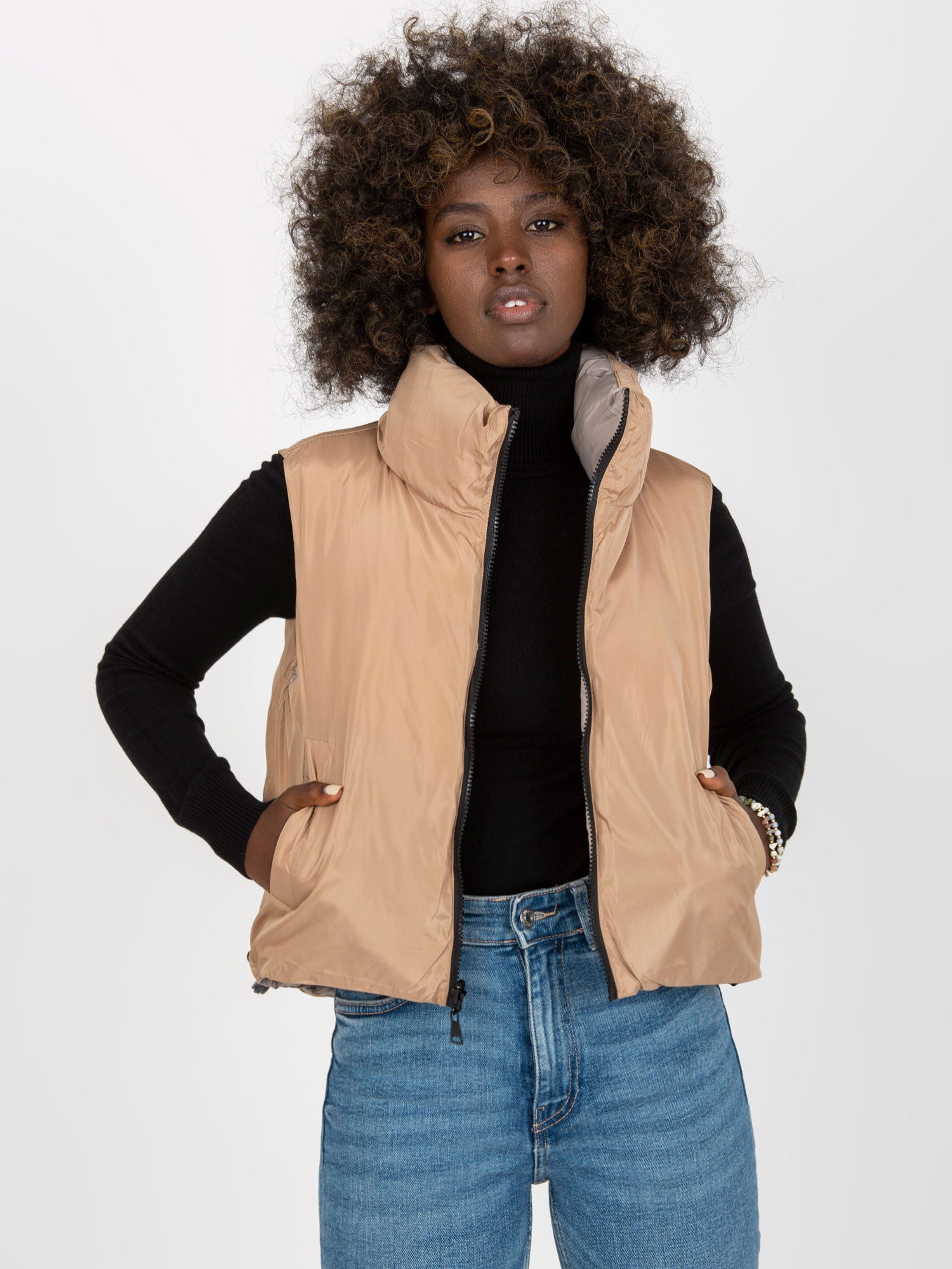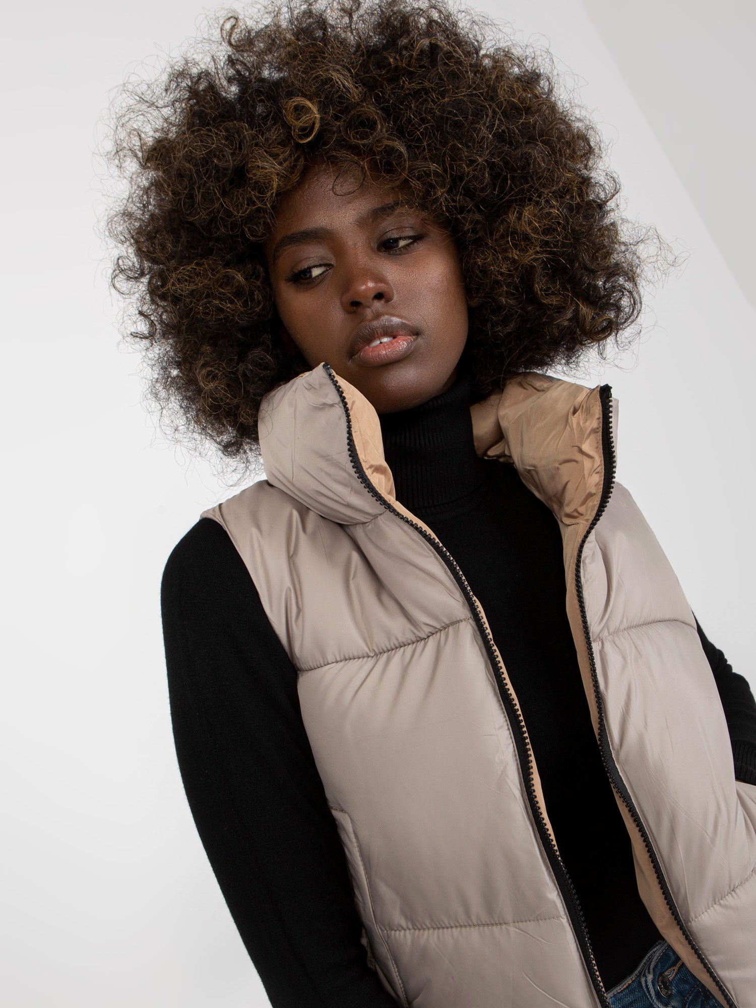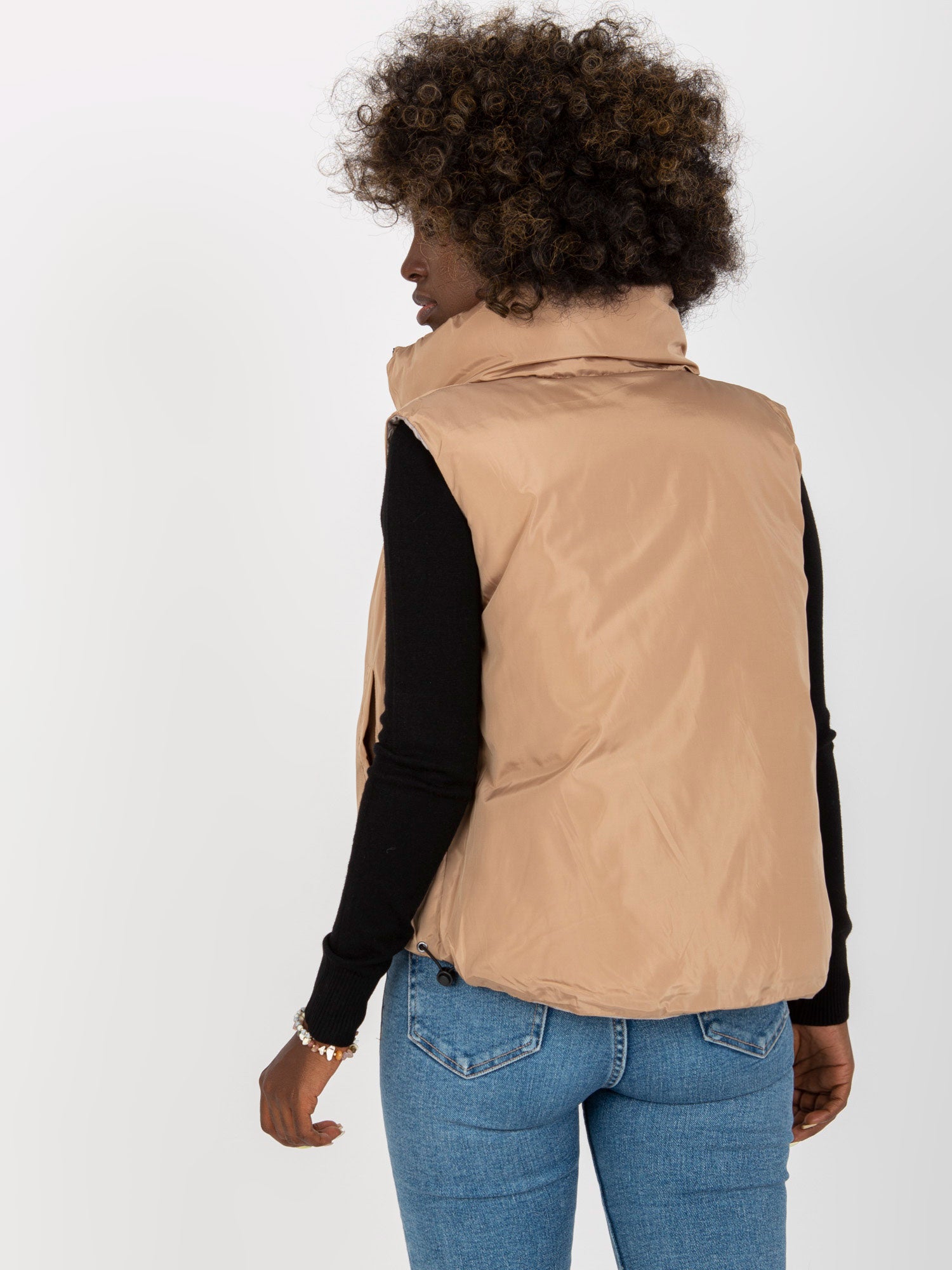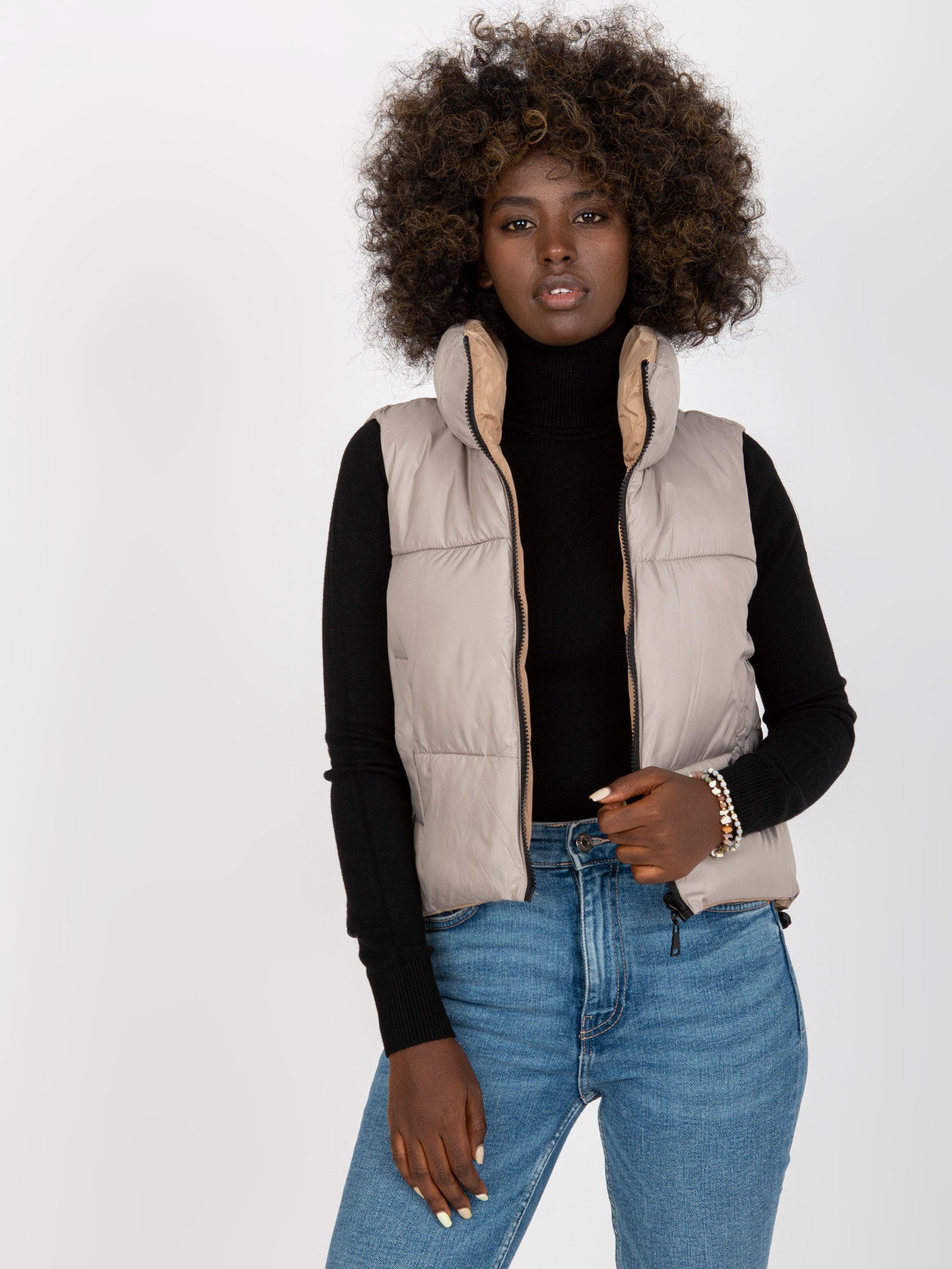 Jasnoszara dwustronna kamizelka puchowa z kieszeniami .