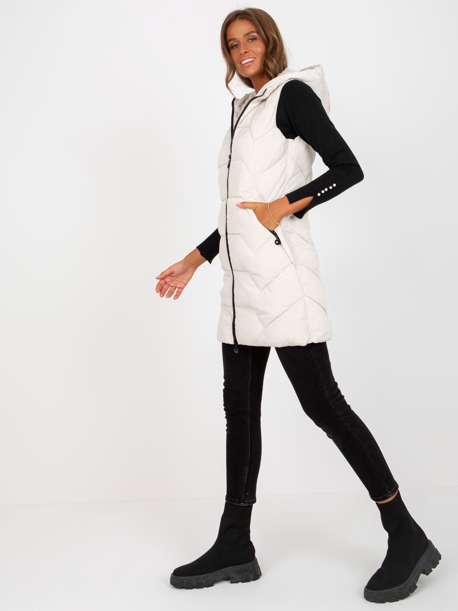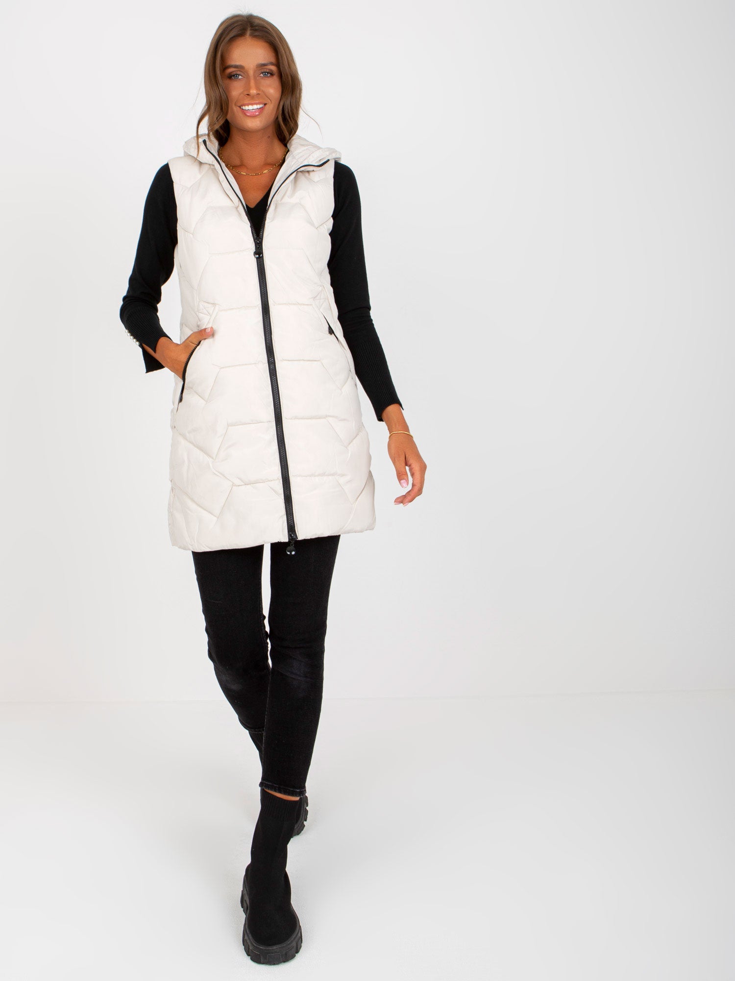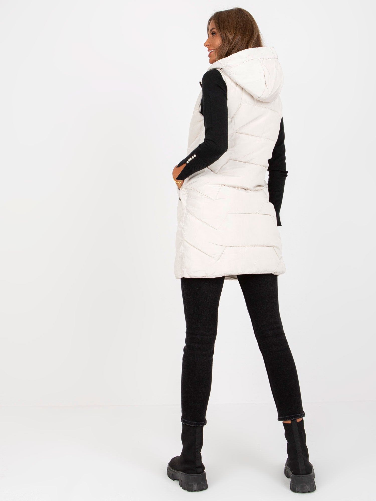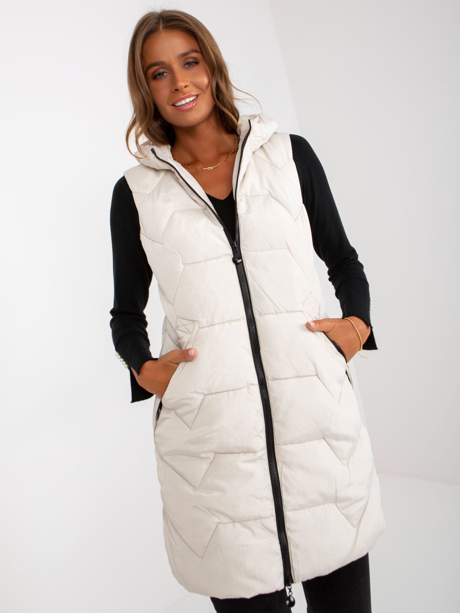 Jasnobeżowa długa kamizelka puchowa z kapturem .