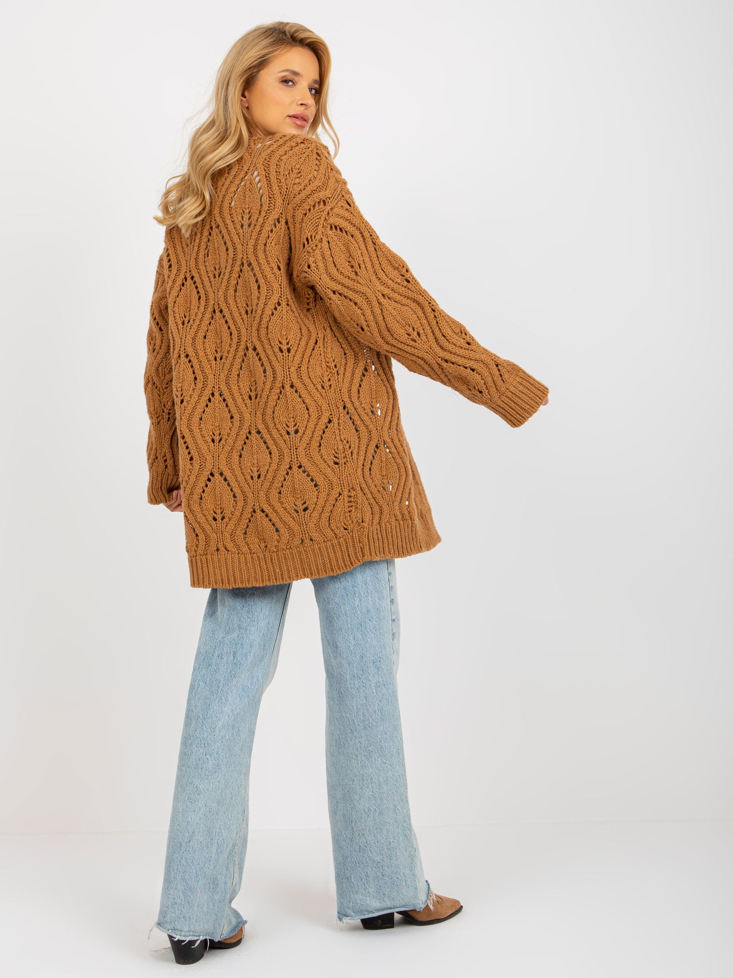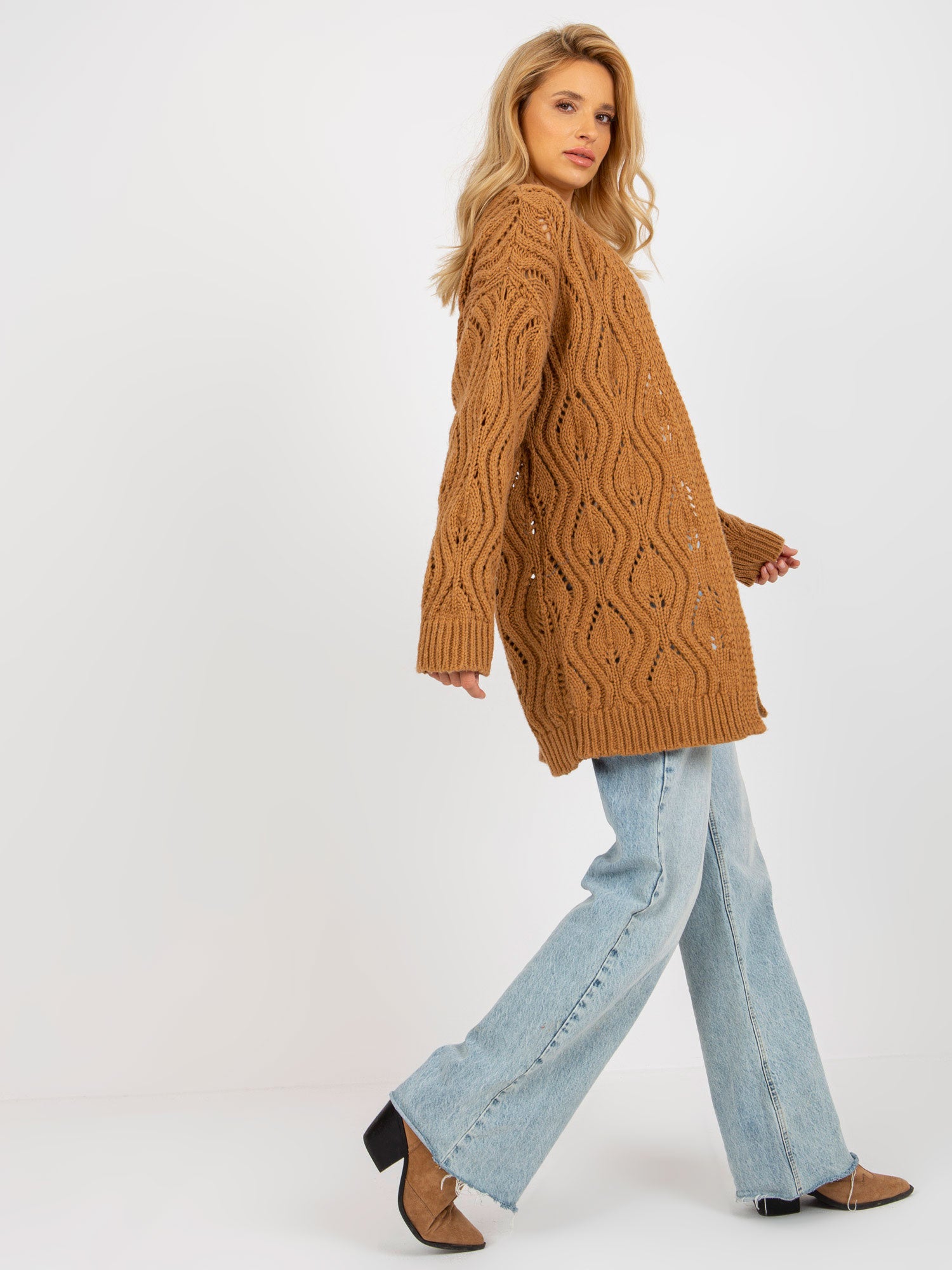 Camelowy damski ażurowy kardigan z wełną .
