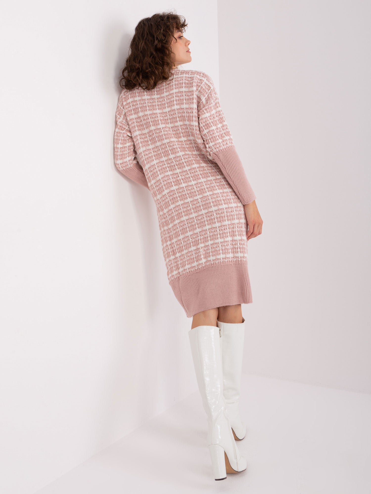 Modelka ma na sobie rozmiar one size. Wymiary modelki: wzrost 177 cm, biust 84 cm, talia 62 cm, biodra 89 cm.