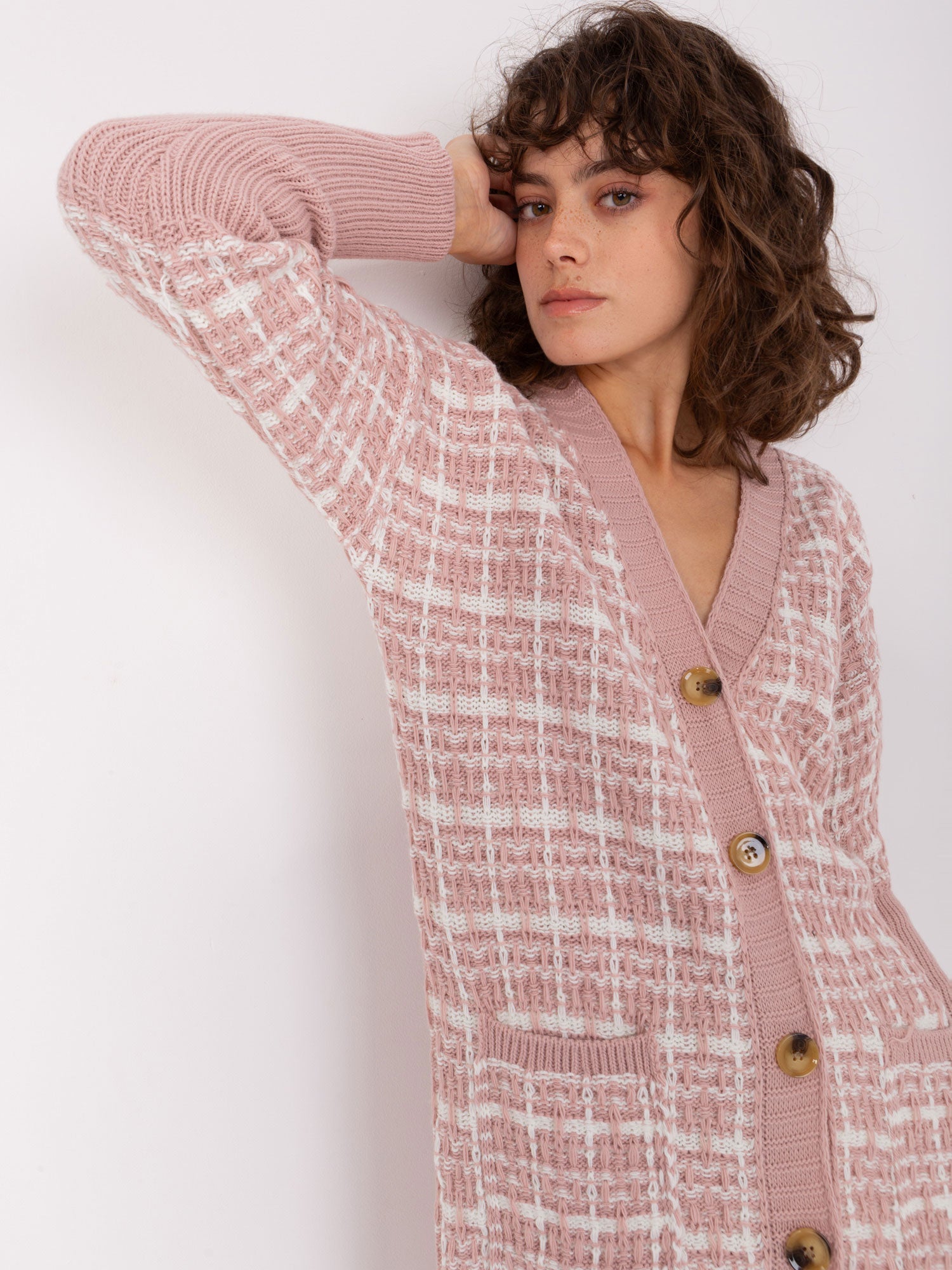 Jasnoróżowy kardigan z guzikami.