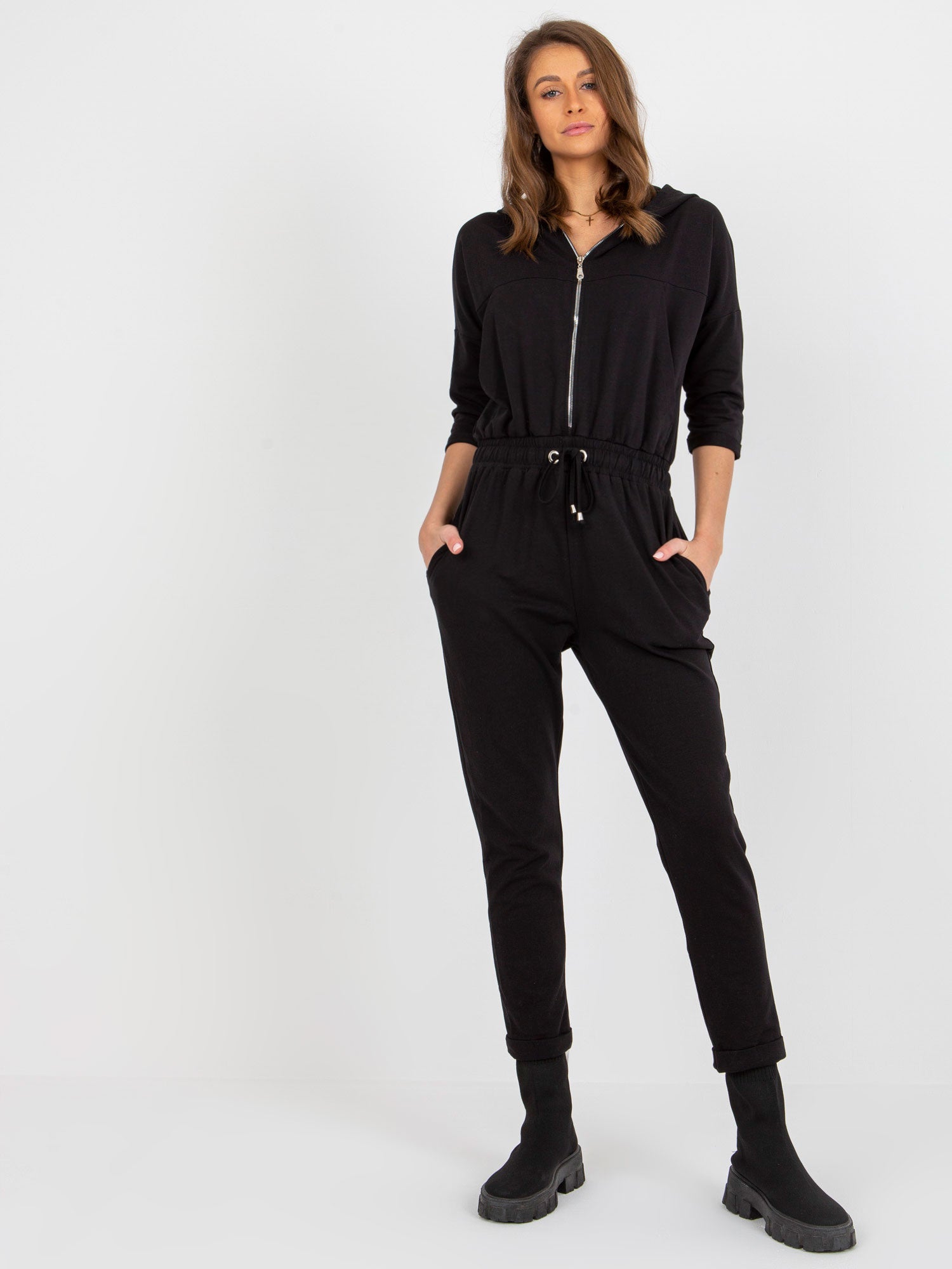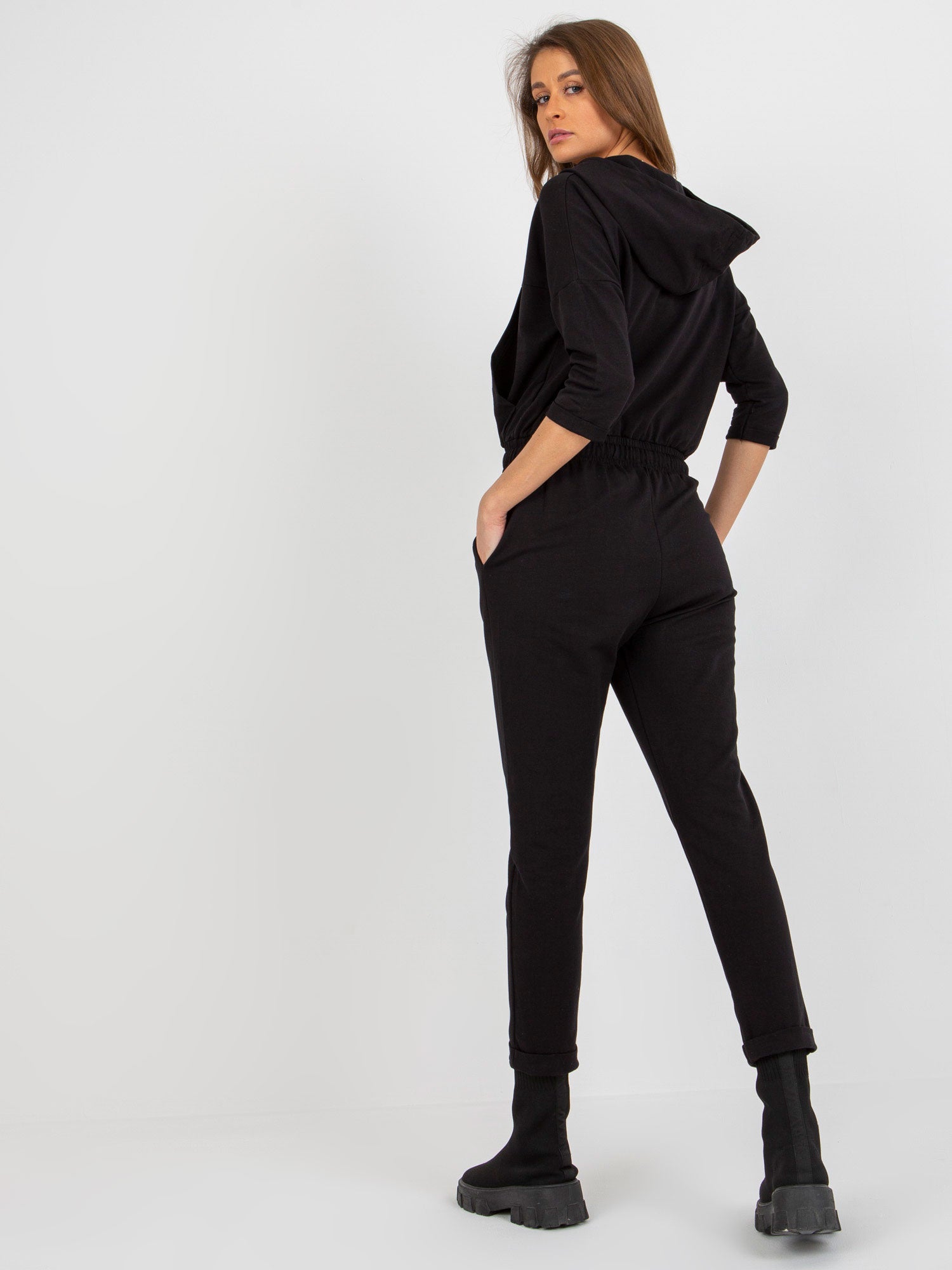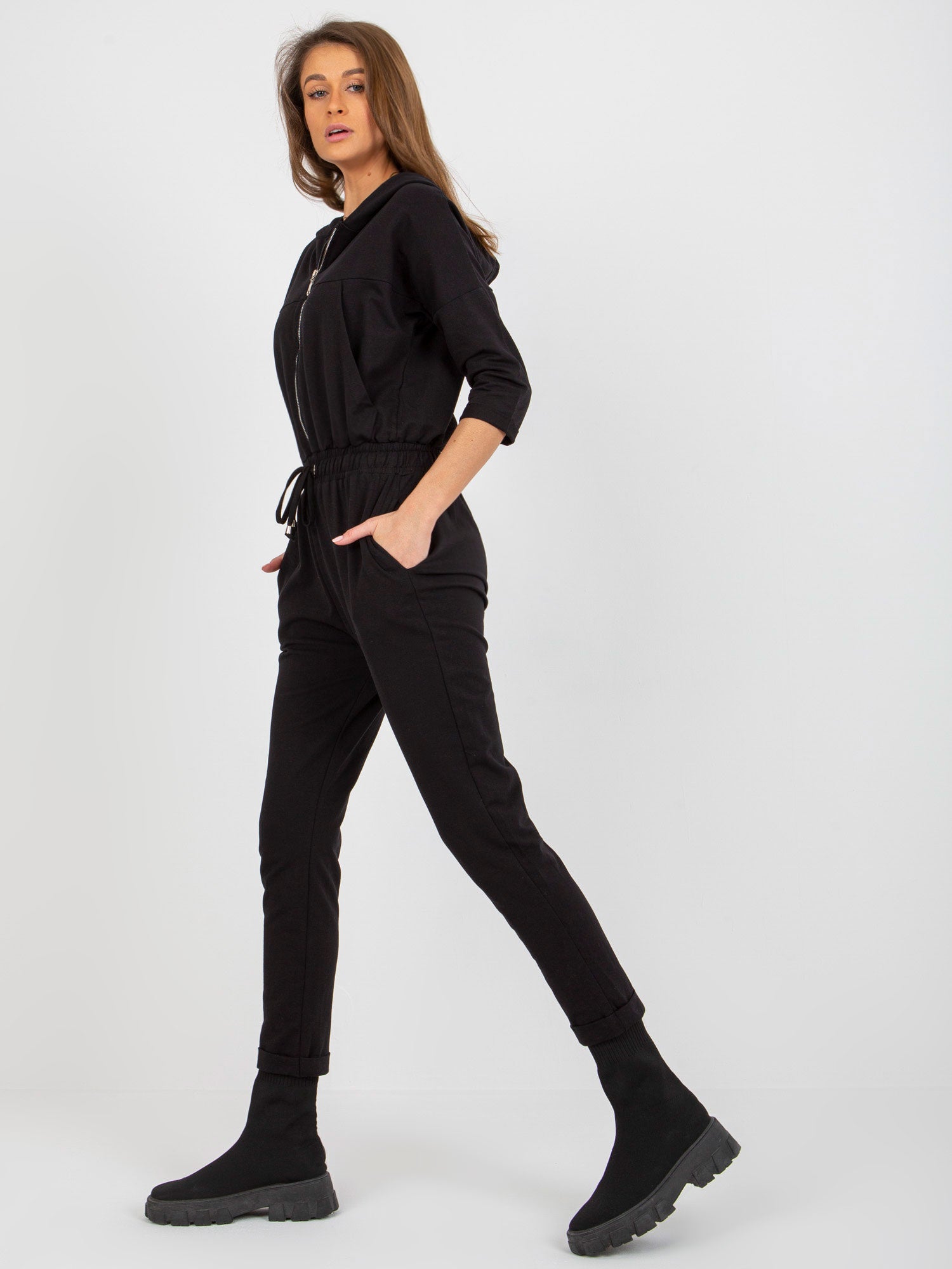 Czarny dresowy kombinezon ze spodniami i kieszeniami .
