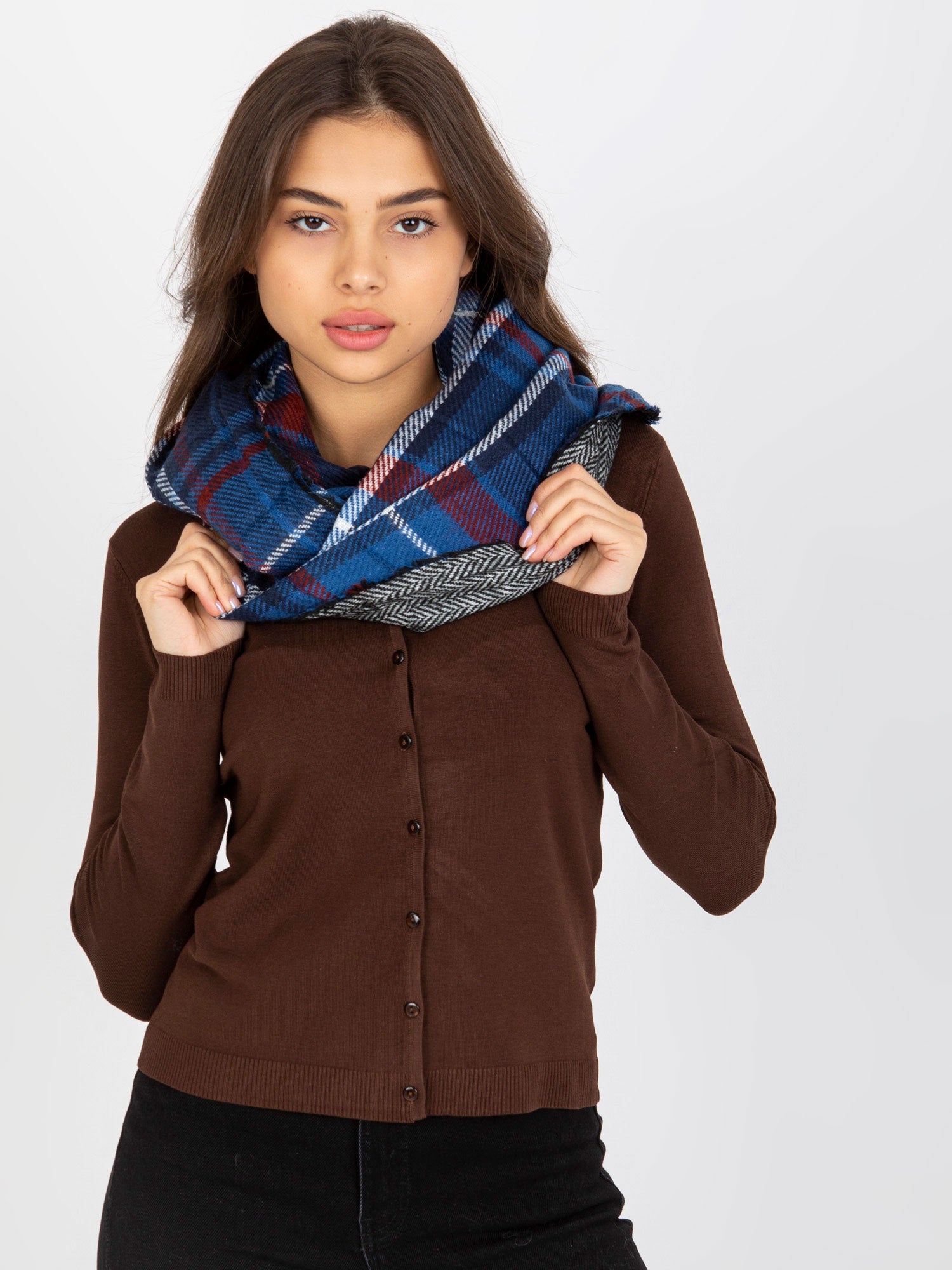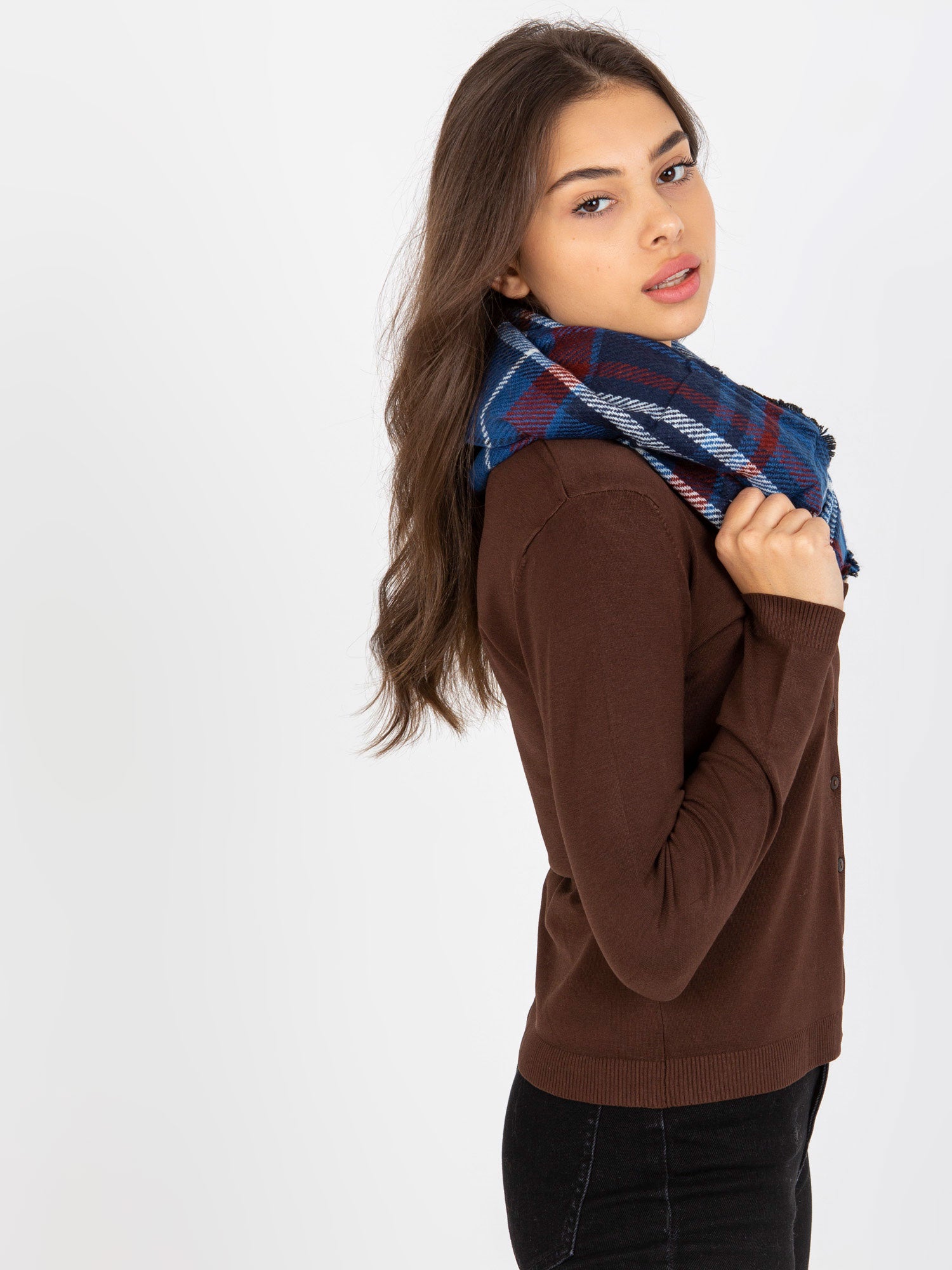 Granatowo-bordowy komin z nadrukiem w kratę.