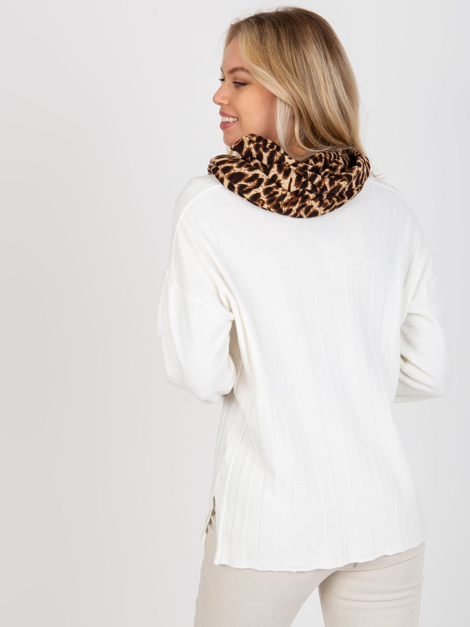 Ciemnobeżowy komin damski w zwierzęcy wzór .