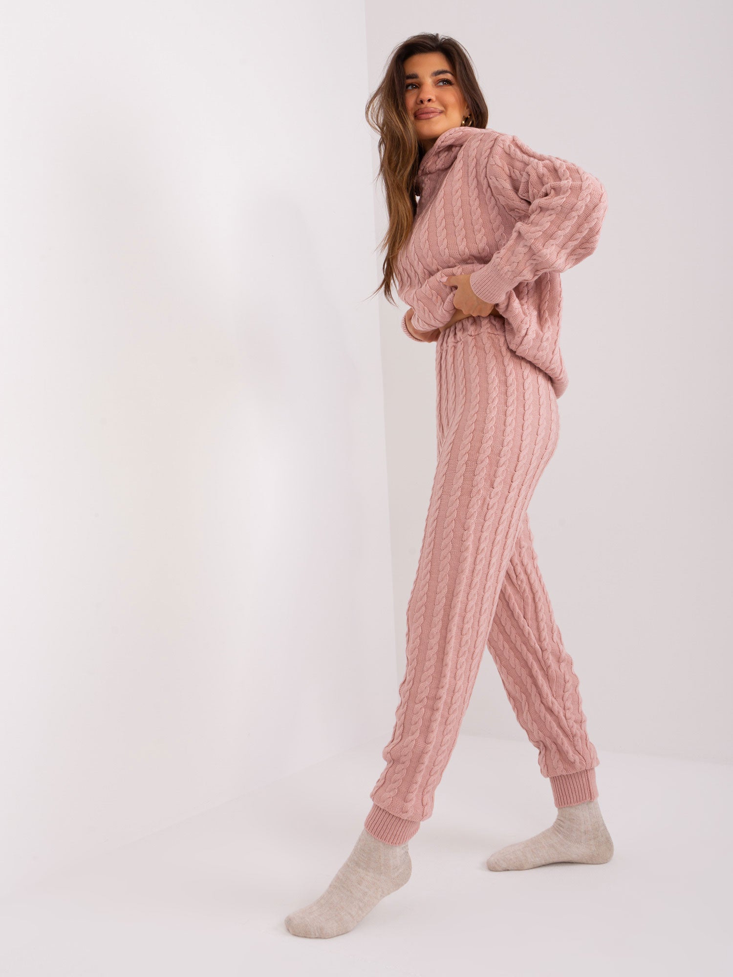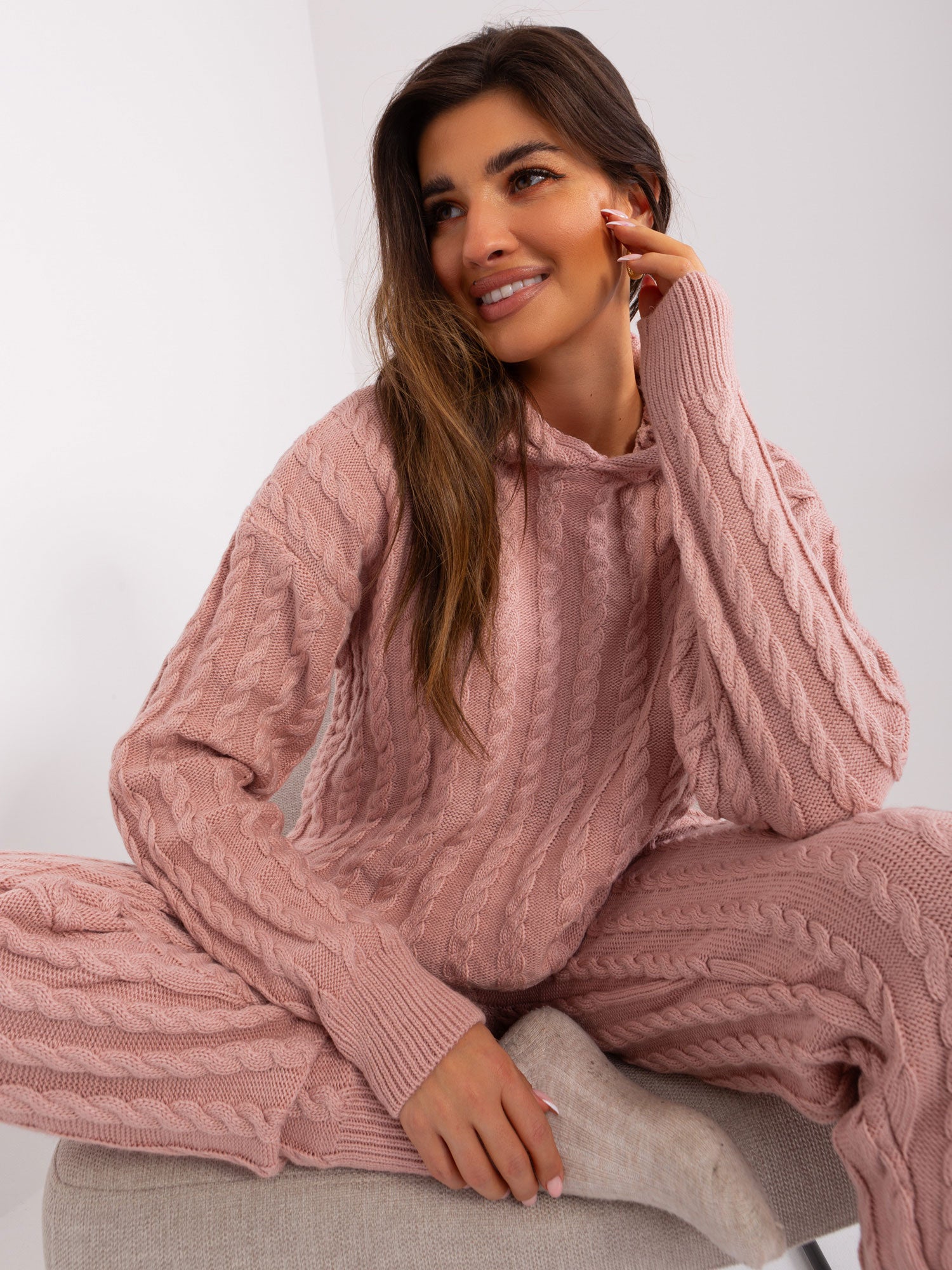 Jasnoróżowy komplet dzianinowy ze swetrem z kapturem.
