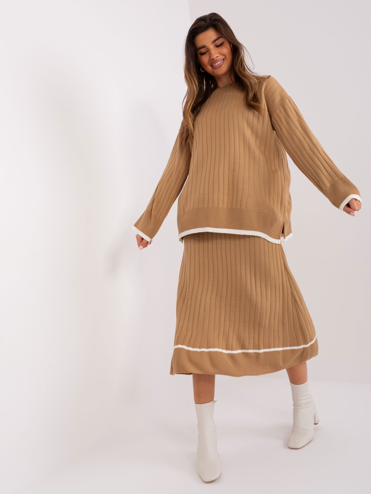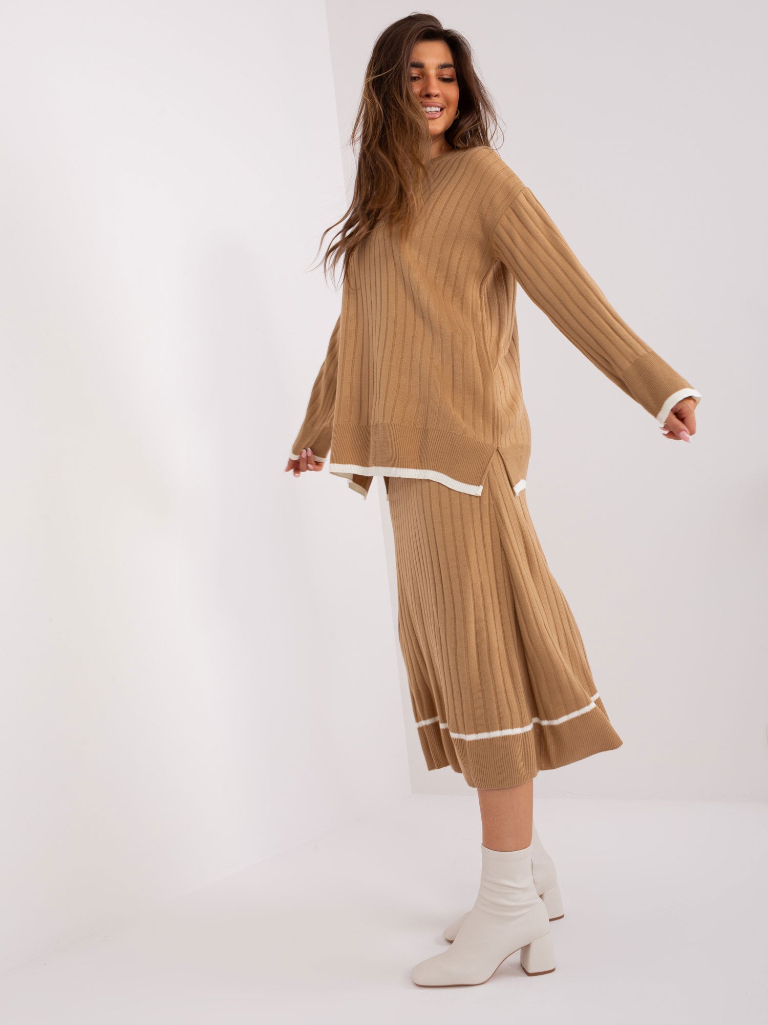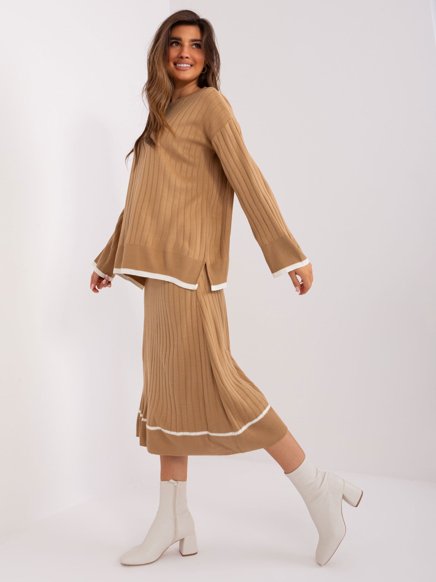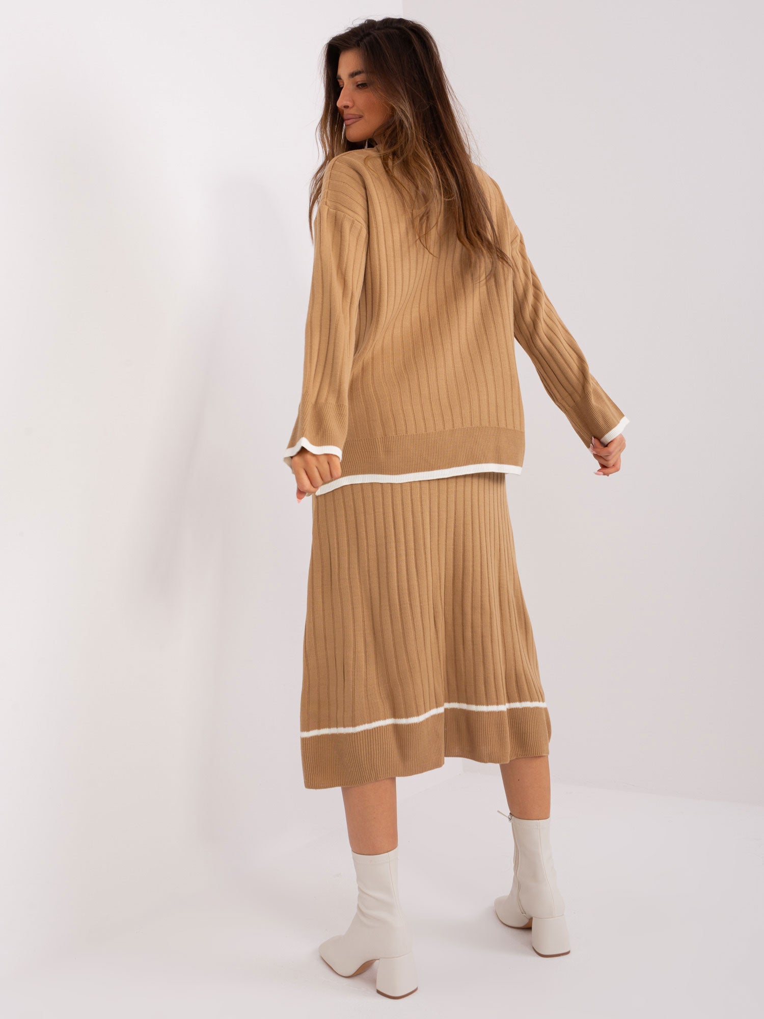 Camelowy komplet dzianinowy w prążek ze spódnicą.