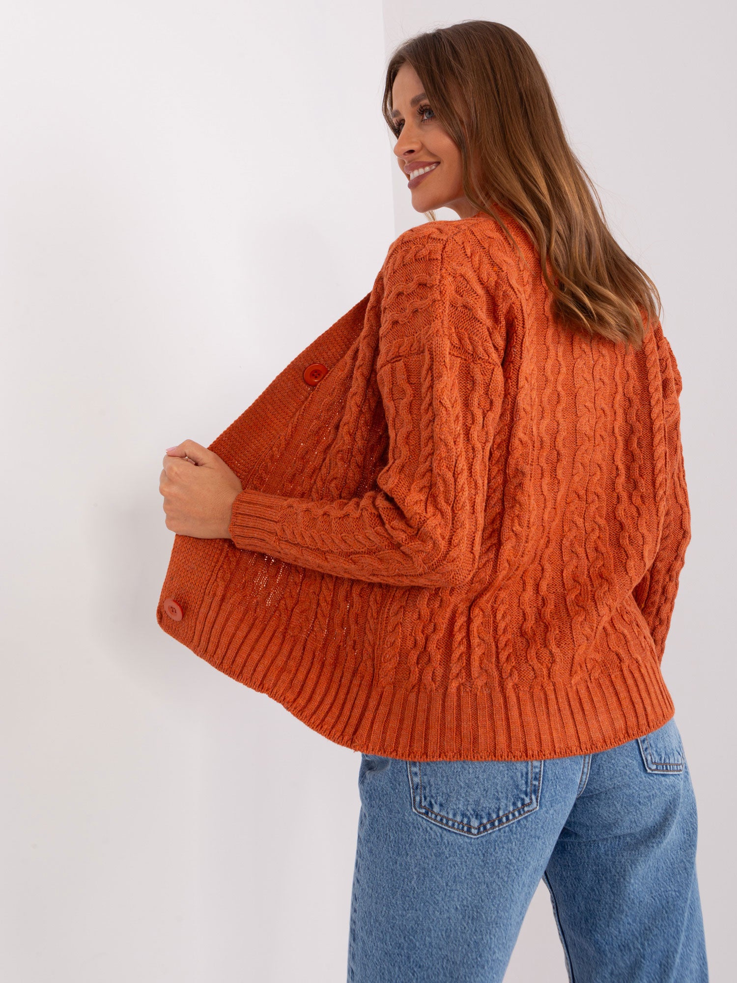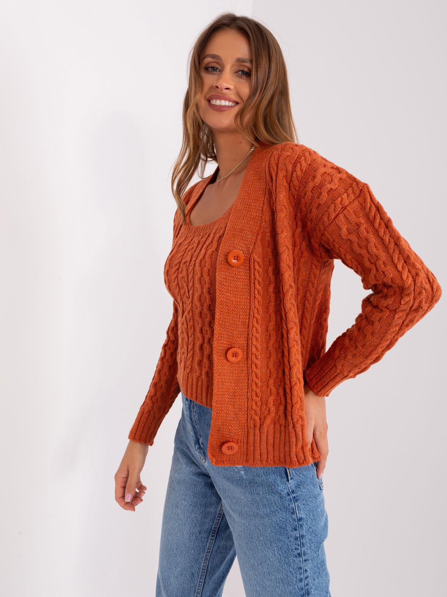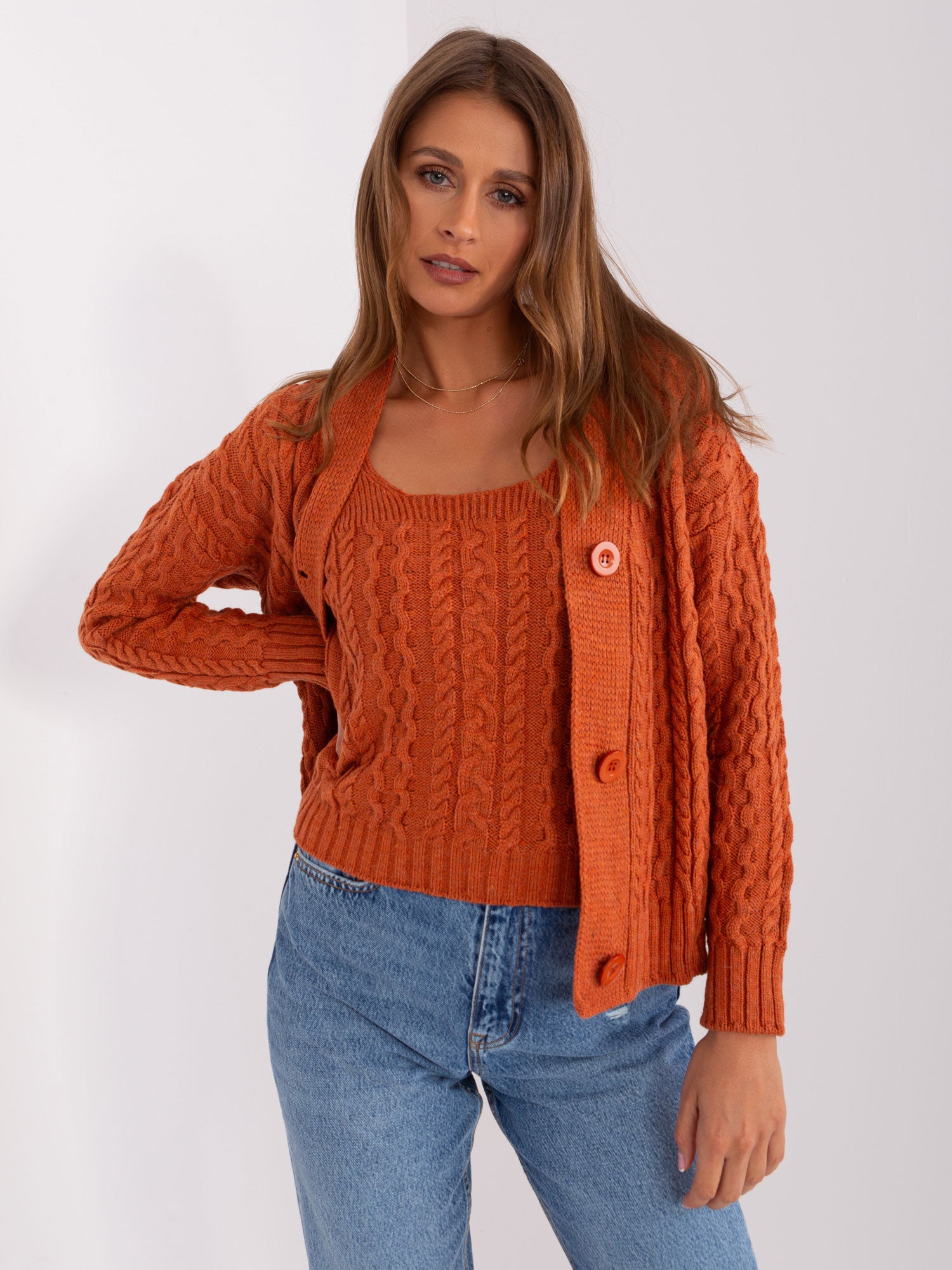 Ciemnopomarańczowy komplet ze swetrem rozpinanym .
