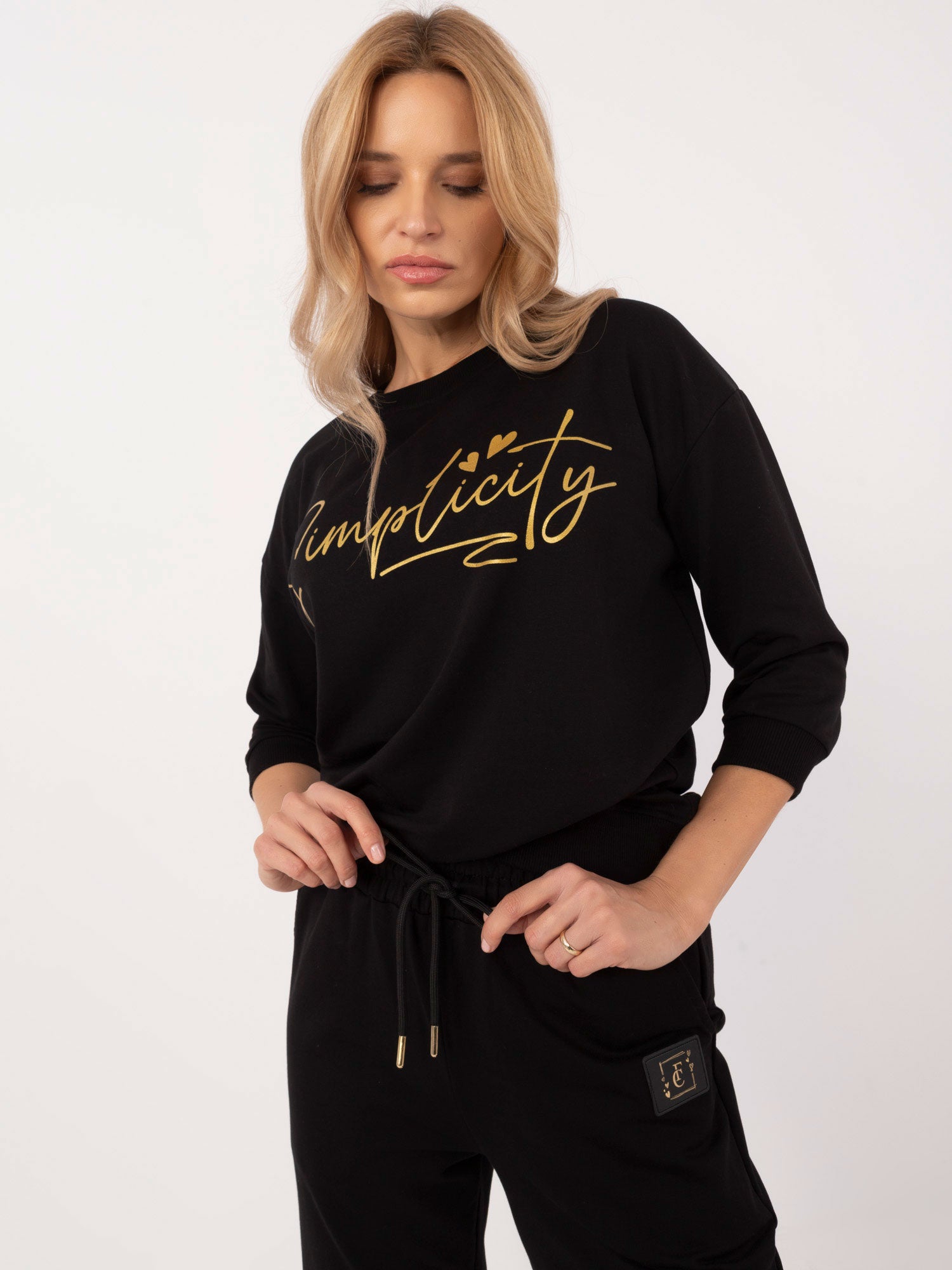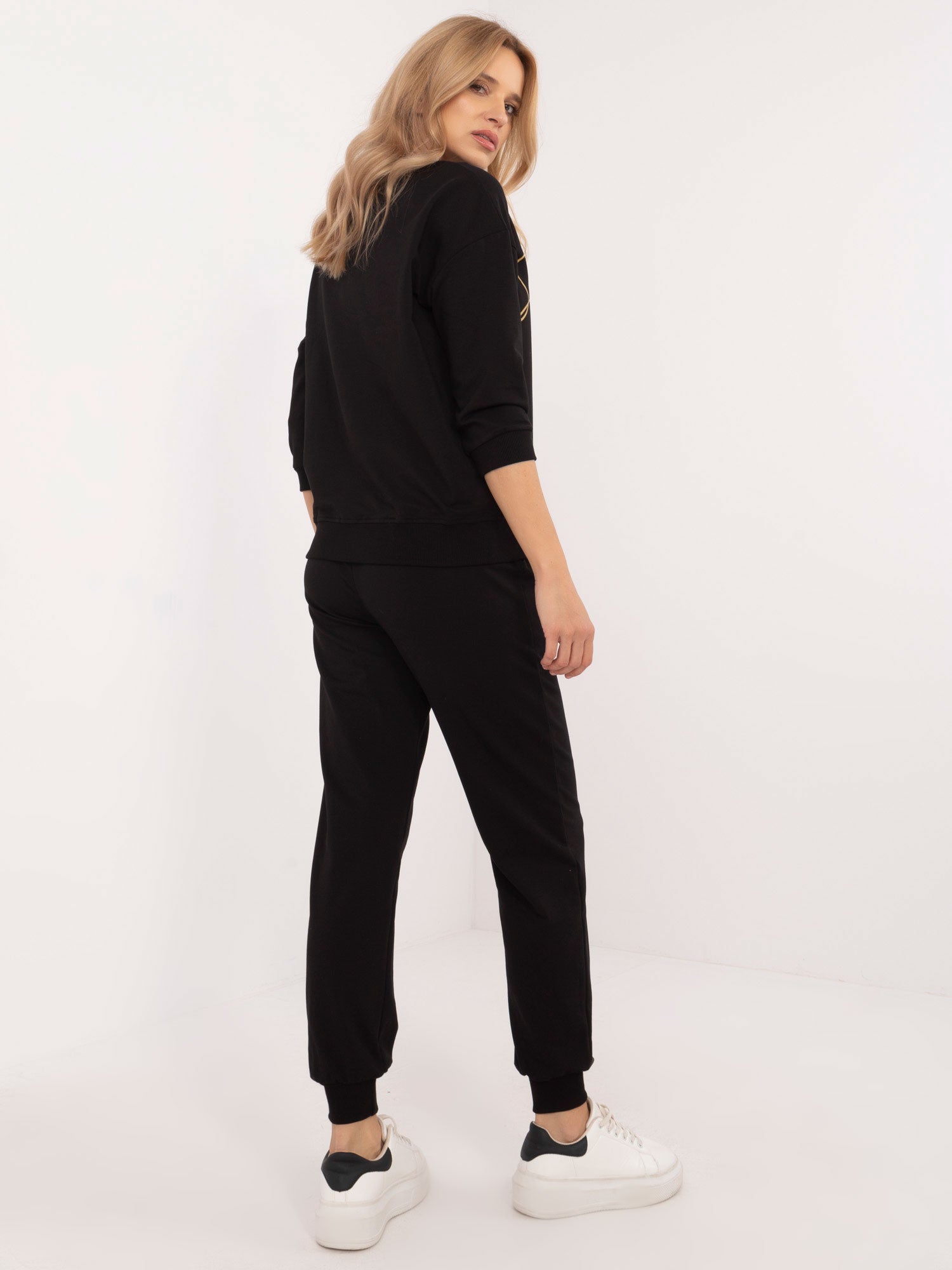 Wymiary kompletu w rozmiarze S mierzone na płasko: szerokość pod pachami - 57 cm, długość bluzy - 62 cm, długość rękawa - 35 cm (od szwu), szerokość spodni w pasie - 34 cm, długość spodni - 101 cm