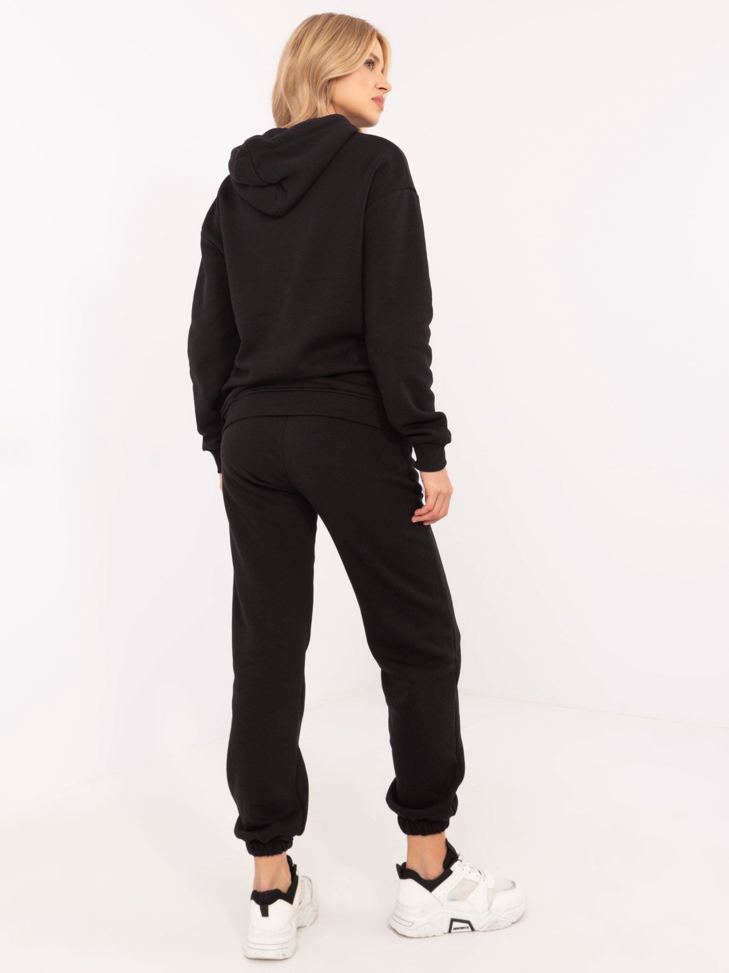 Wymiary kompletu w rozmiarze S: szerokość bluzy pod pachami - 61 cm, długość rękawa - 56 cm (od szwu), długość całkowita - 68 cm, szerokość spodni w pasie - 32 cm, szerokość spodni w biodrach - 46 cm, długość spodni - 100 cm.