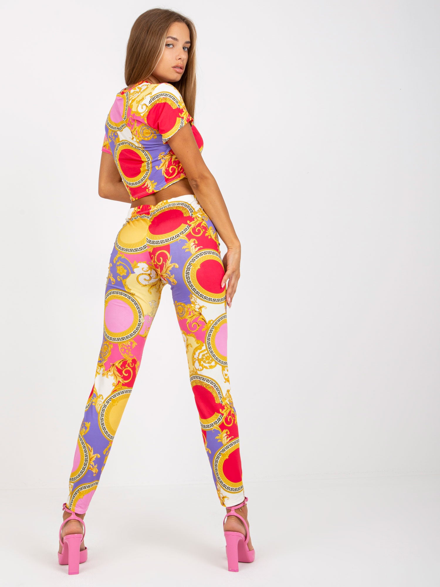 Różowy wzorzysty komplet casualowy z topem .