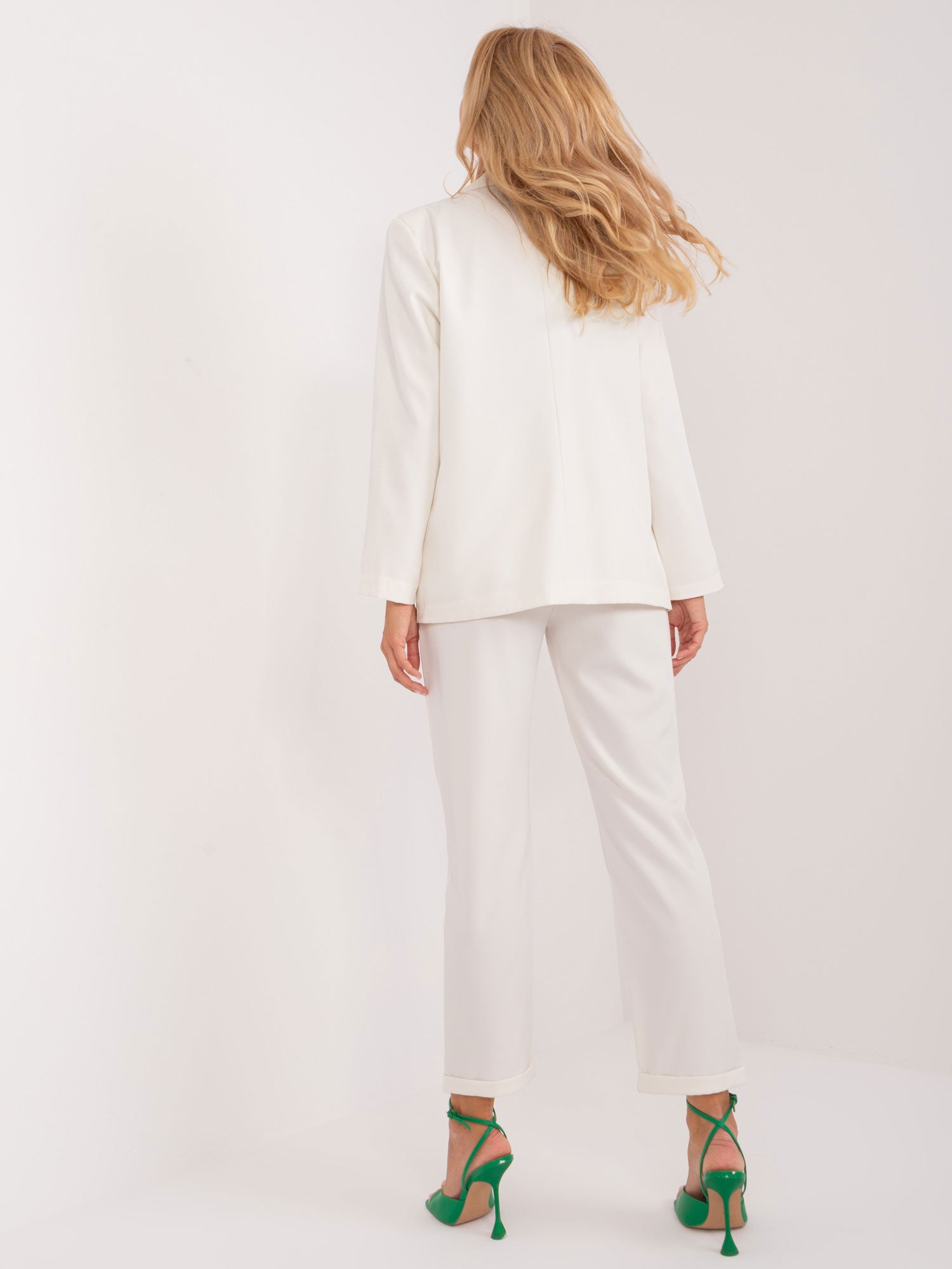 Wymiary kompletu w rozmiarze one size mierzone na płasko: szerokość marynarki pod pachami - 52 cm, długość rękawa - 58 cm, długość marynarki - 70 cm, szerokość spodni w pasie - 38 cm, wysokość stanu - 30 cm, długość spodni - 93 cm.