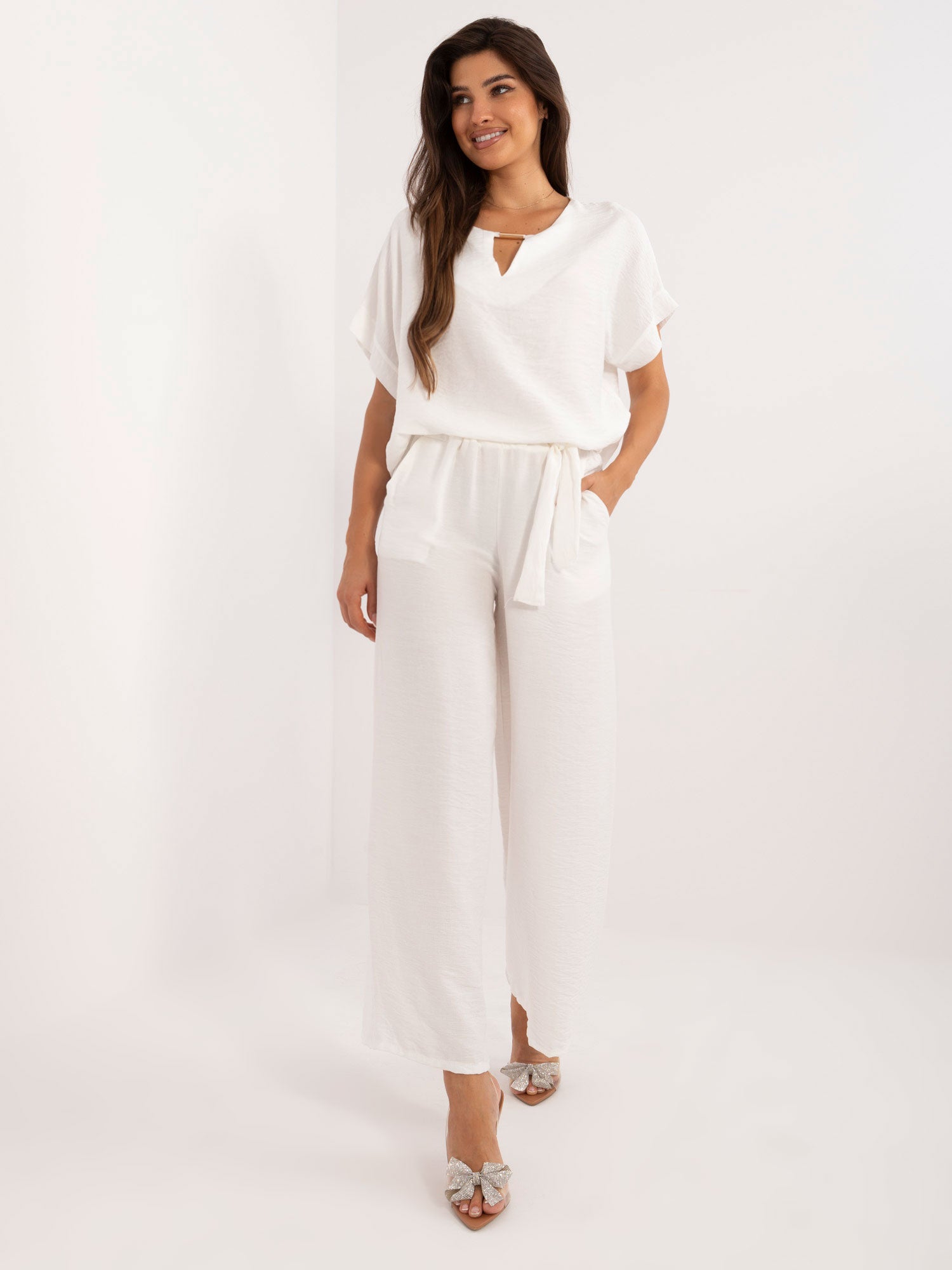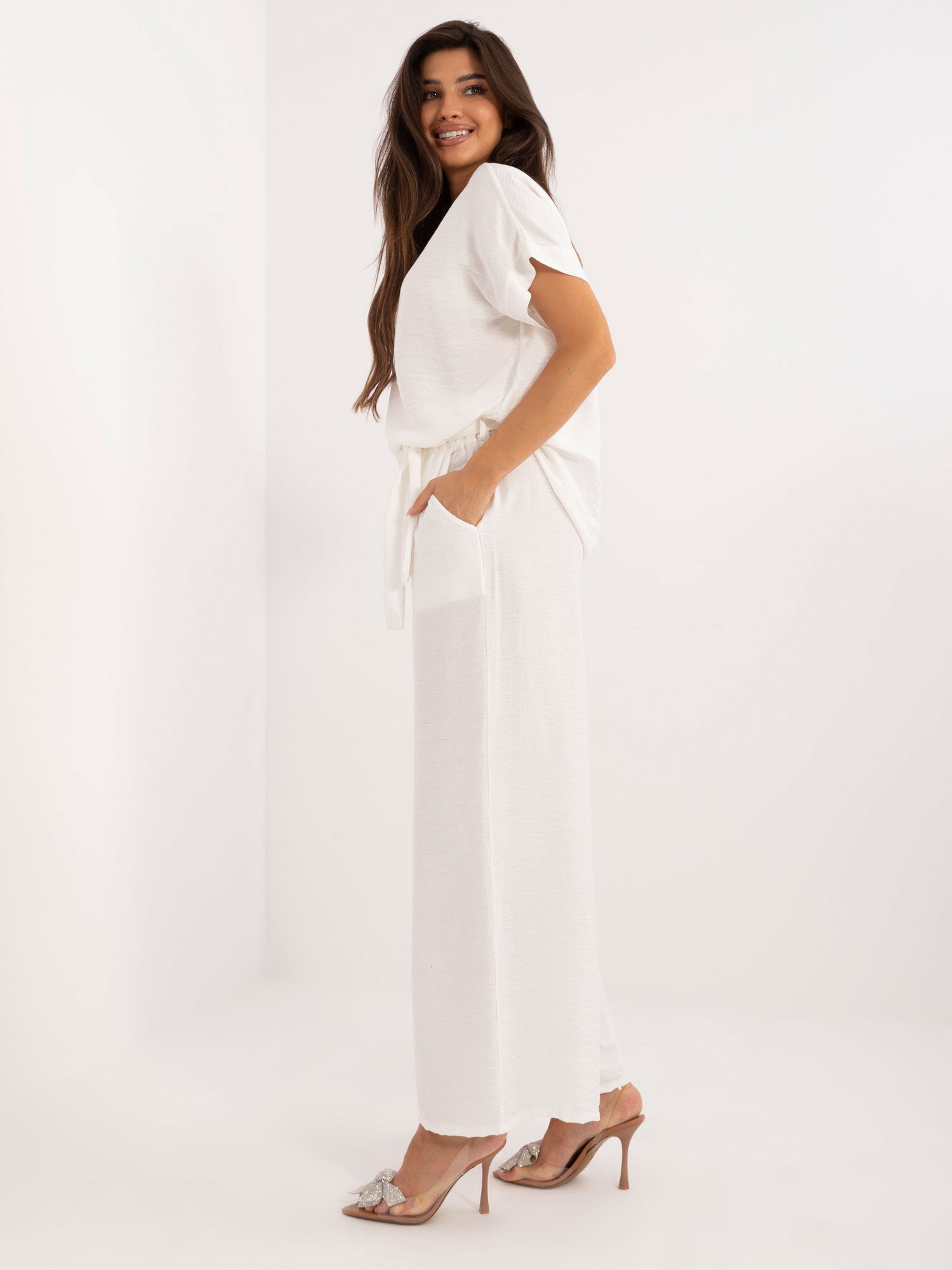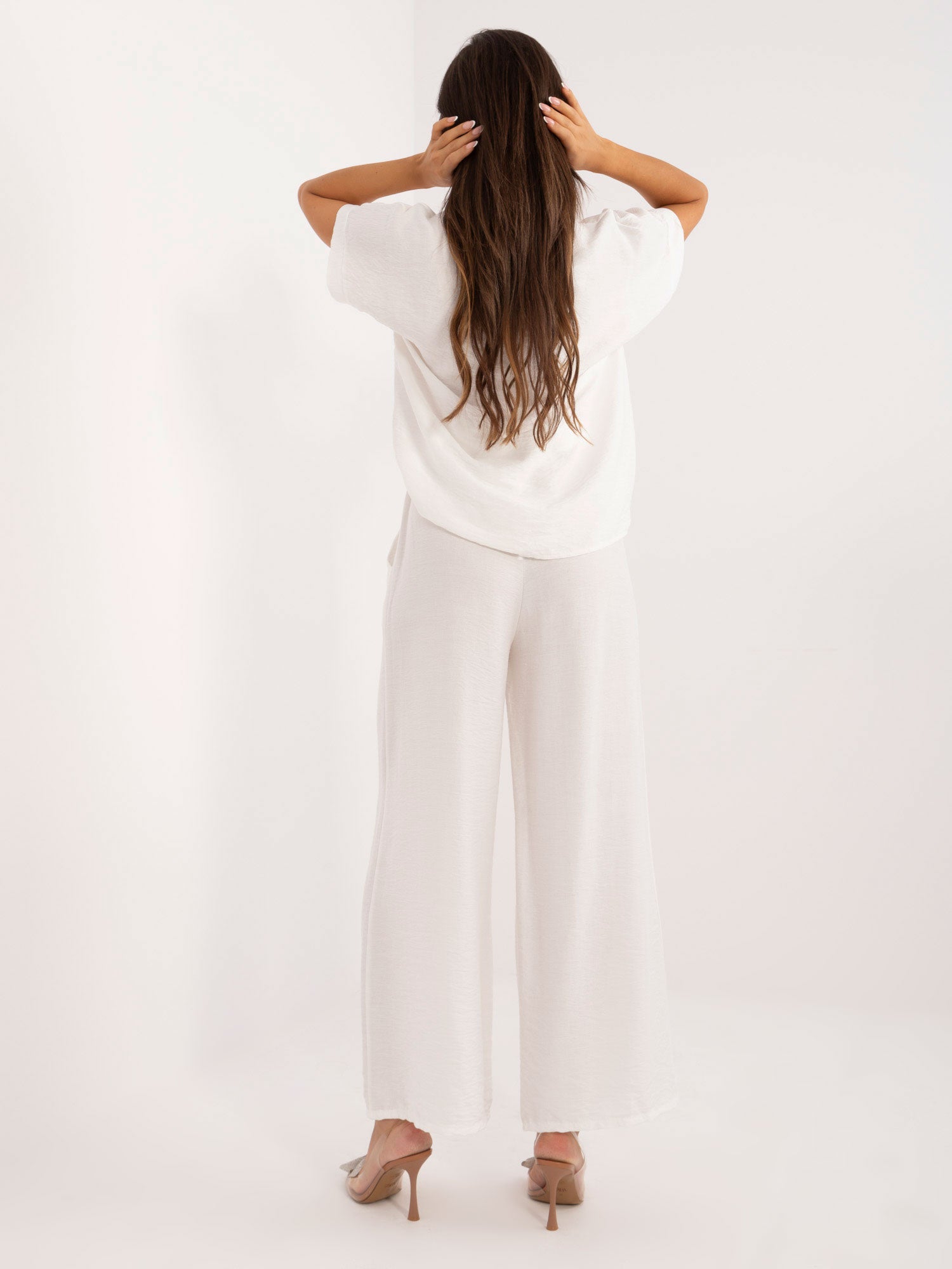 Wymiary kompletu w rozmiarze one size mierzone na płasko: szerokość bluzki pod pachami - 60 cm, długość bluzki - 64 cm, szerokość spodni w pasie - 35 cm, długość spodni - 104 cm.