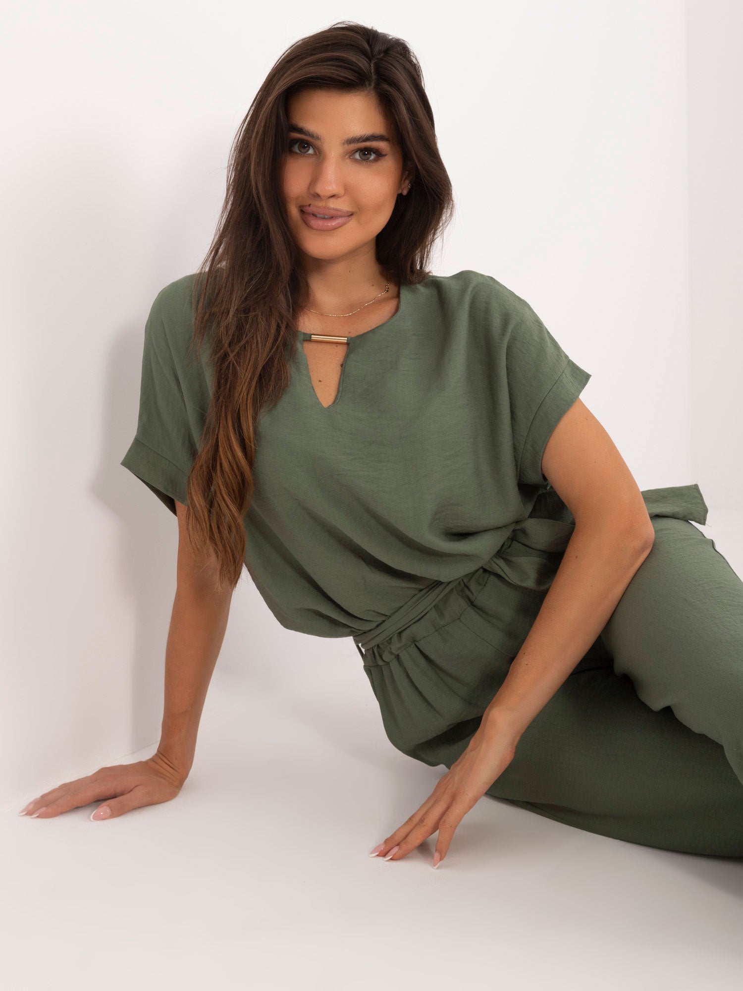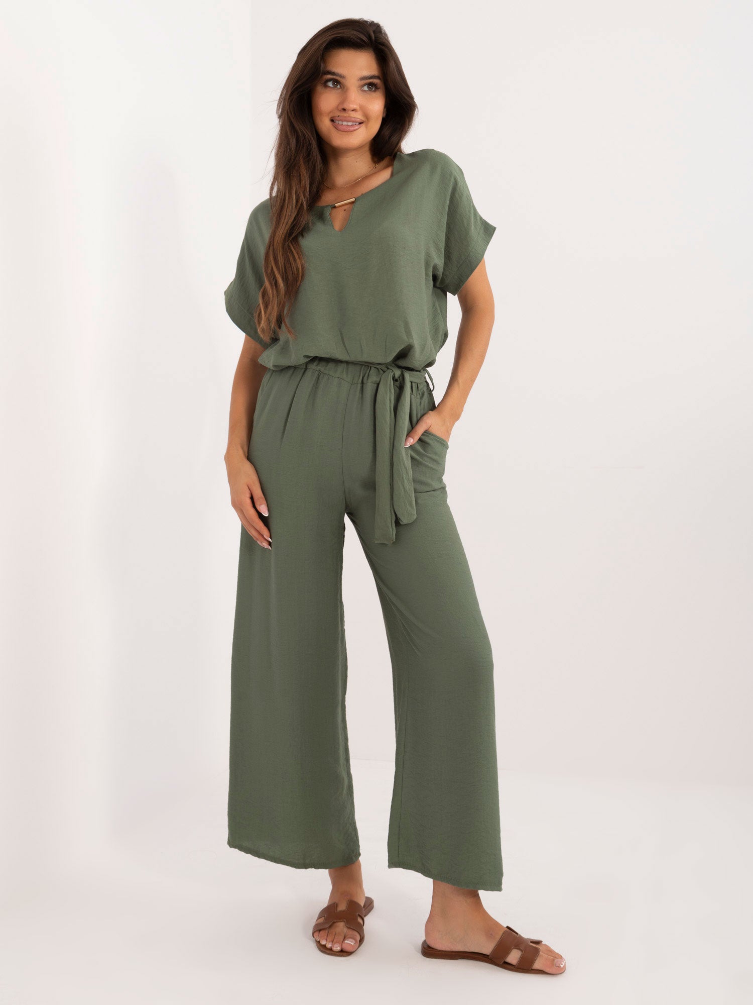 Wymiary kompletu w rozmiarze one size mierzone na płasko: szerokość bluzki pod pachami - 60 cm, długość bluzki - 64 cm, szerokość spodni w pasie - 35 cm, długość spodni - 104 cm.