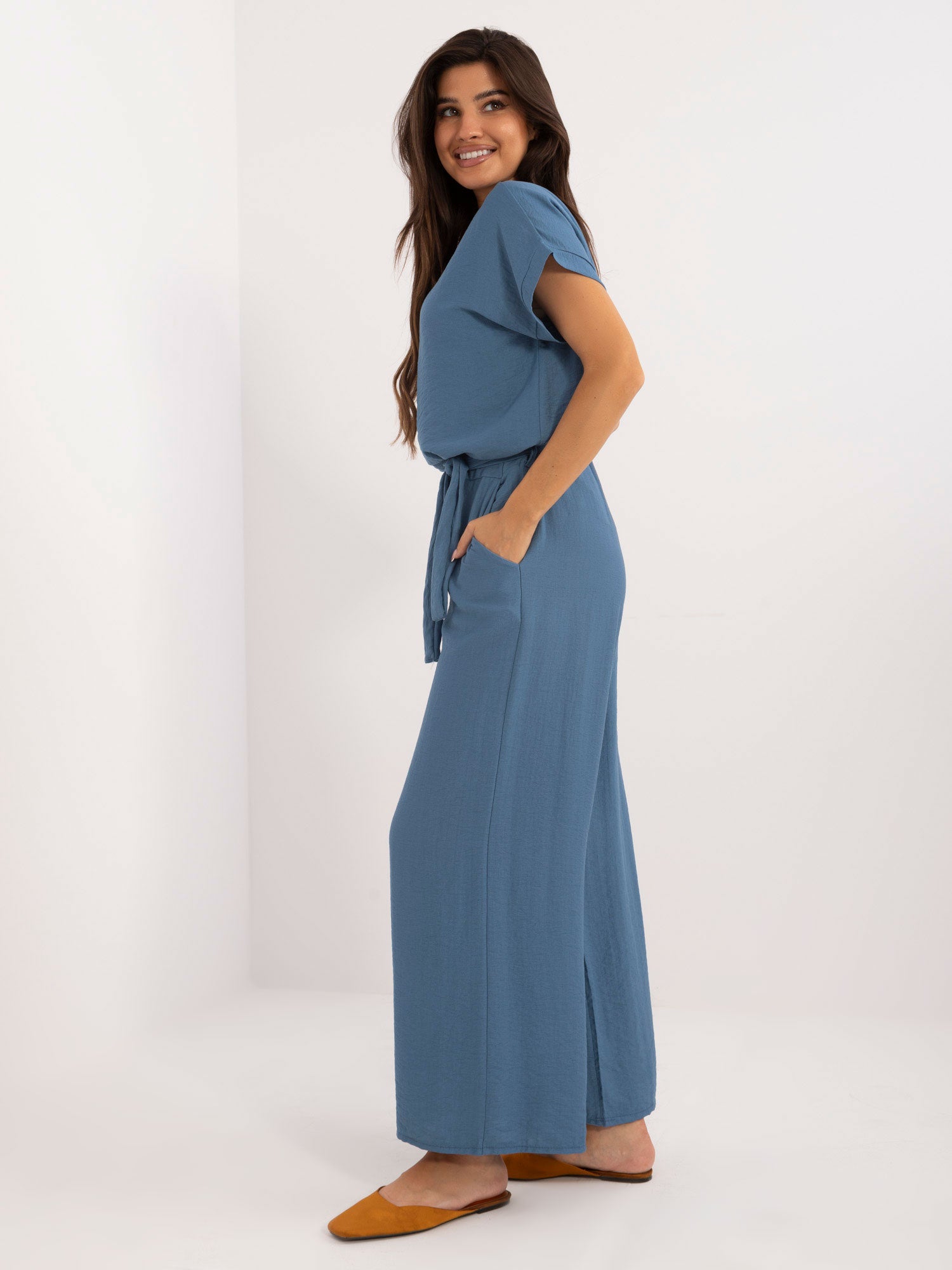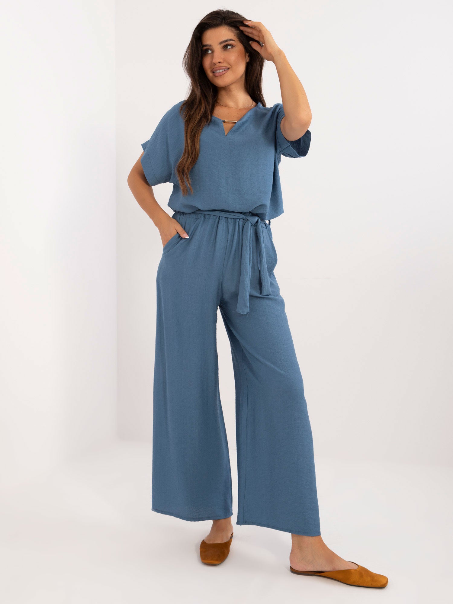Wymiary kompletu w rozmiarze one size mierzone na płasko: szerokość bluzki pod pachami - 60 cm, długość bluzki - 64 cm, szerokość spodni w pasie - 35 cm, długość spodni - 104 cm.