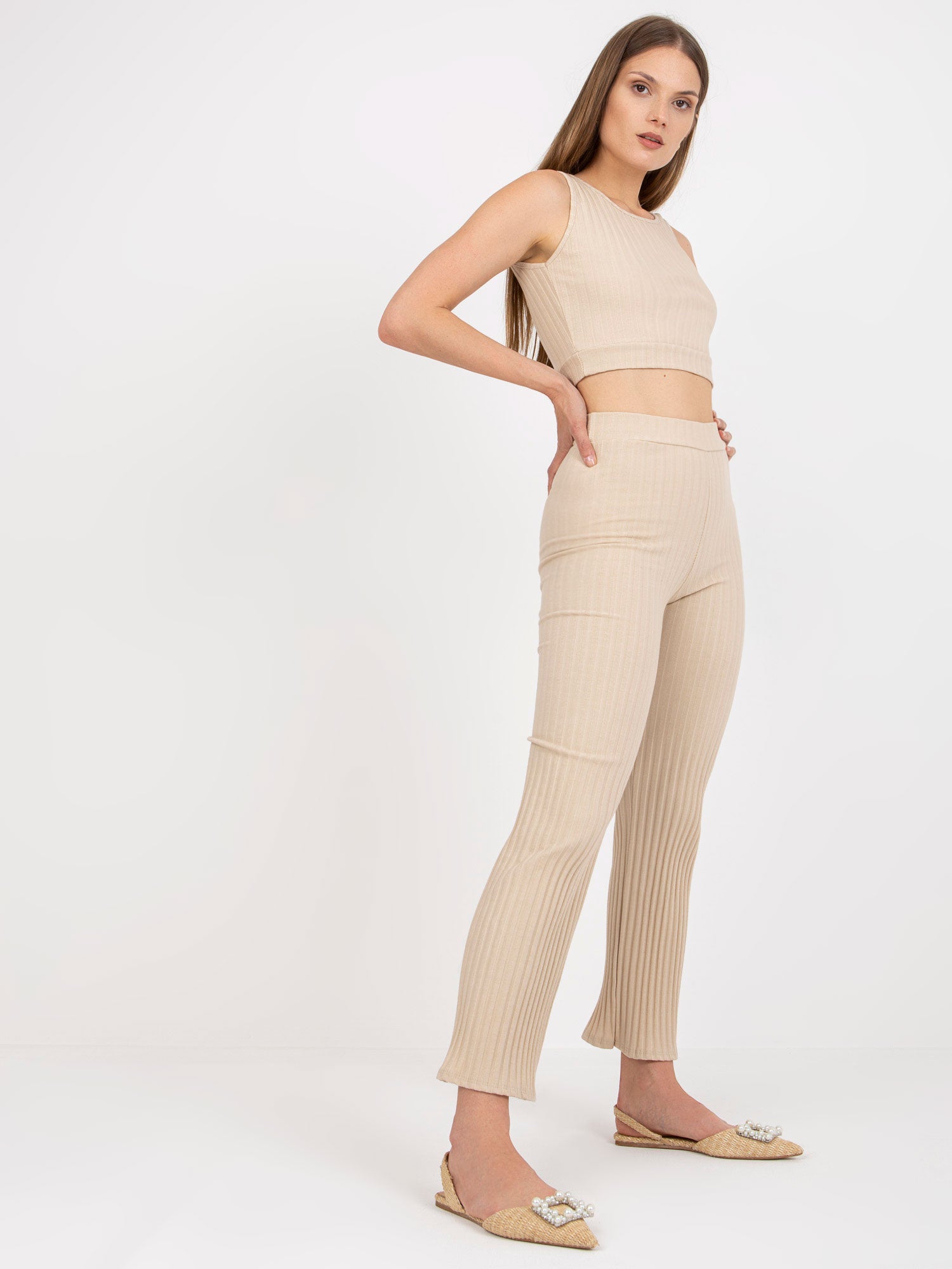 Wymiary kompletu w rozmiarze one size mierzone na płasko: szerokość topu pod pachami - 39 cm, długość topu- 41 cm, szerokość spodni w pasie - 35 cm, wysokość stanu - 29 cm, długość spodni - 97 cm.