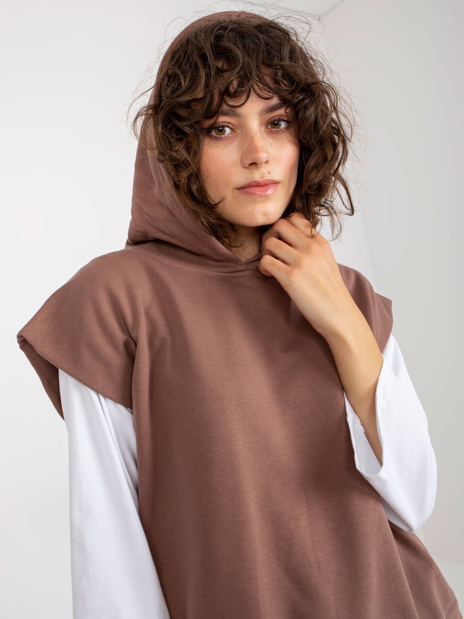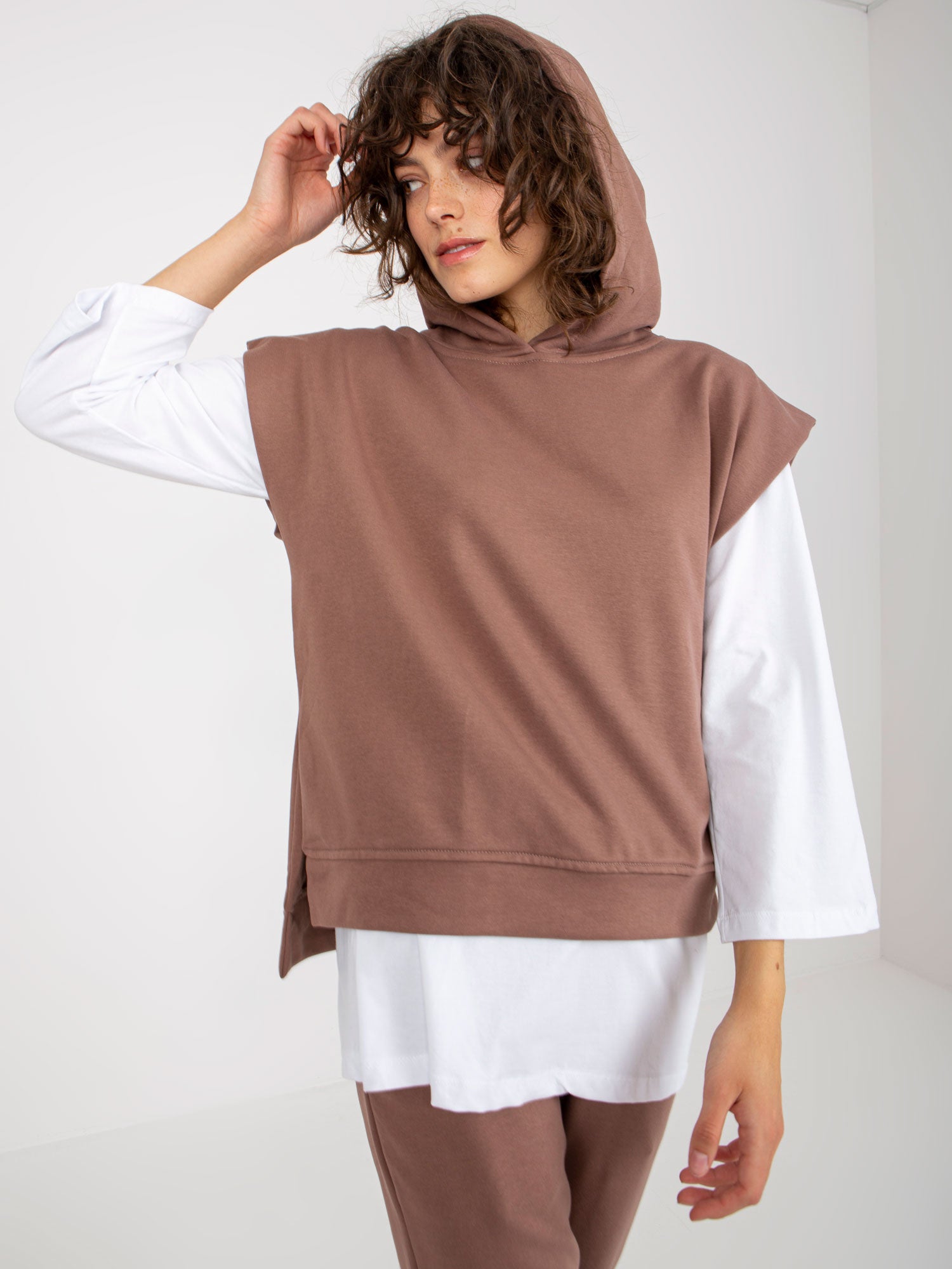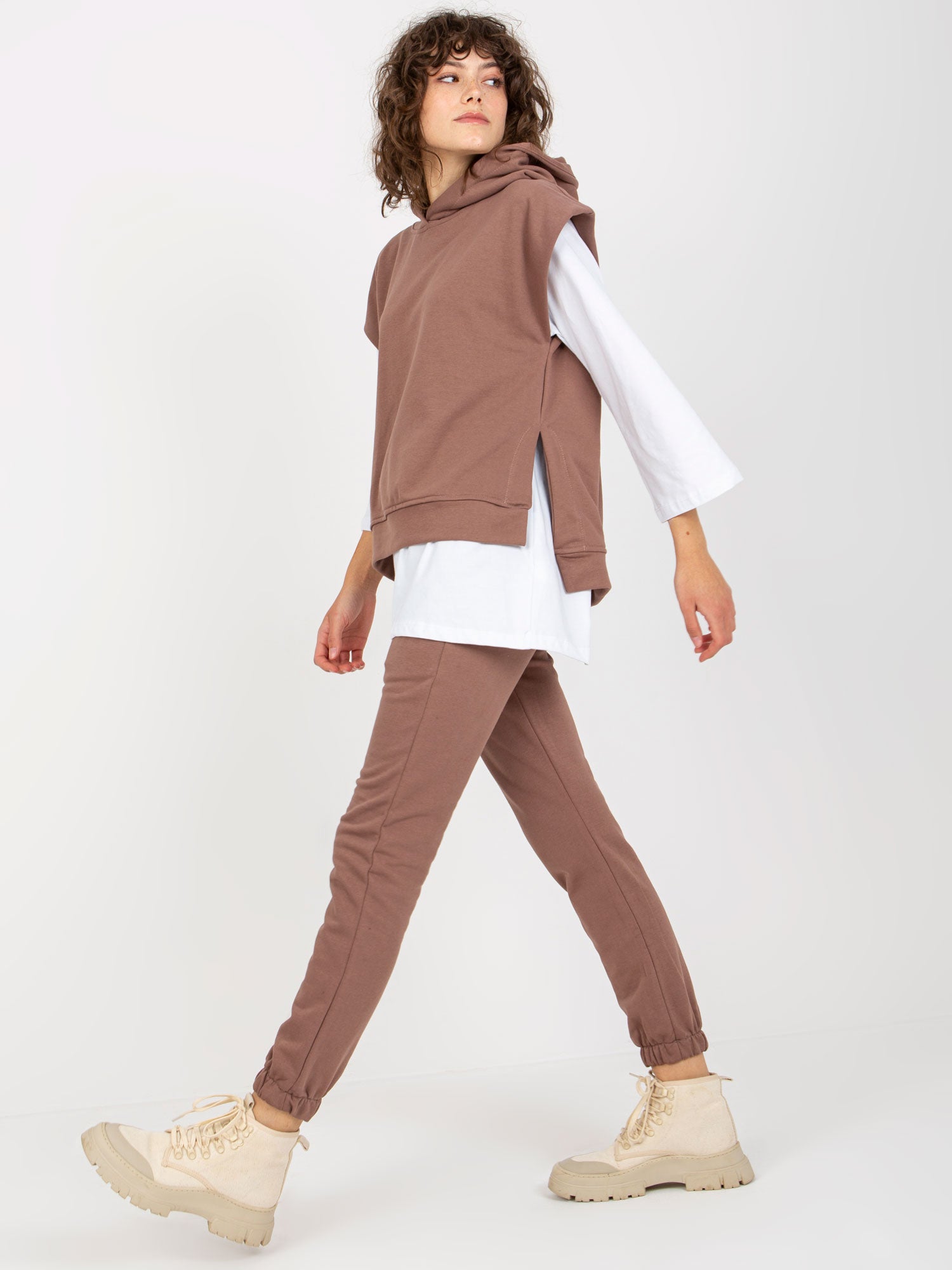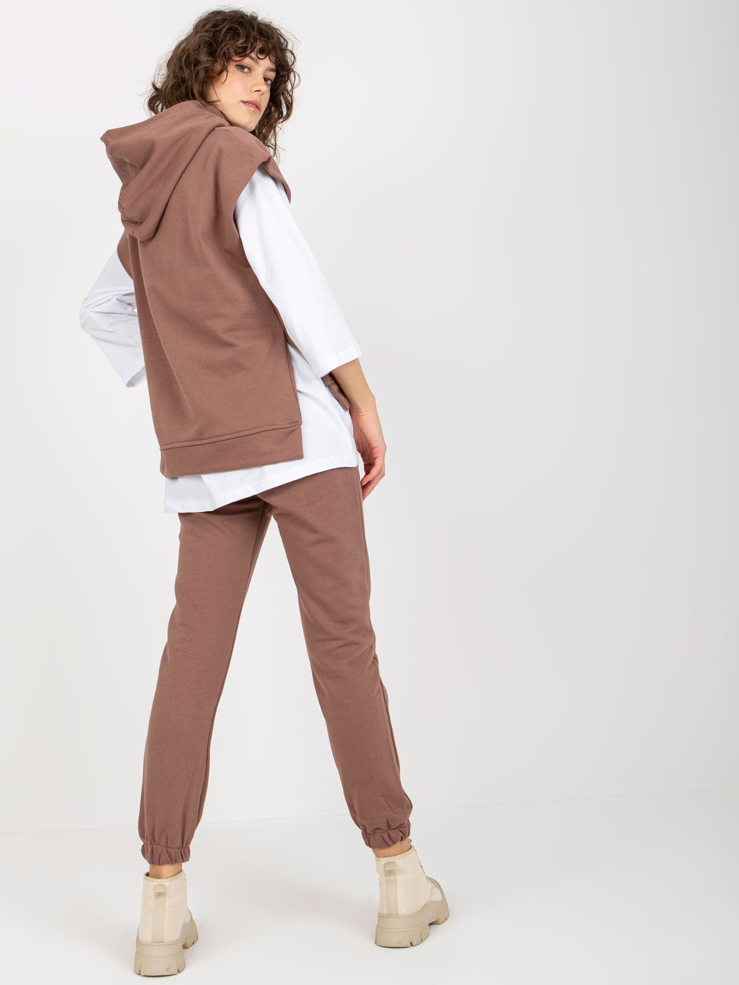 Brązowy trzyczęściowy komplet casualowy ze spodniami .