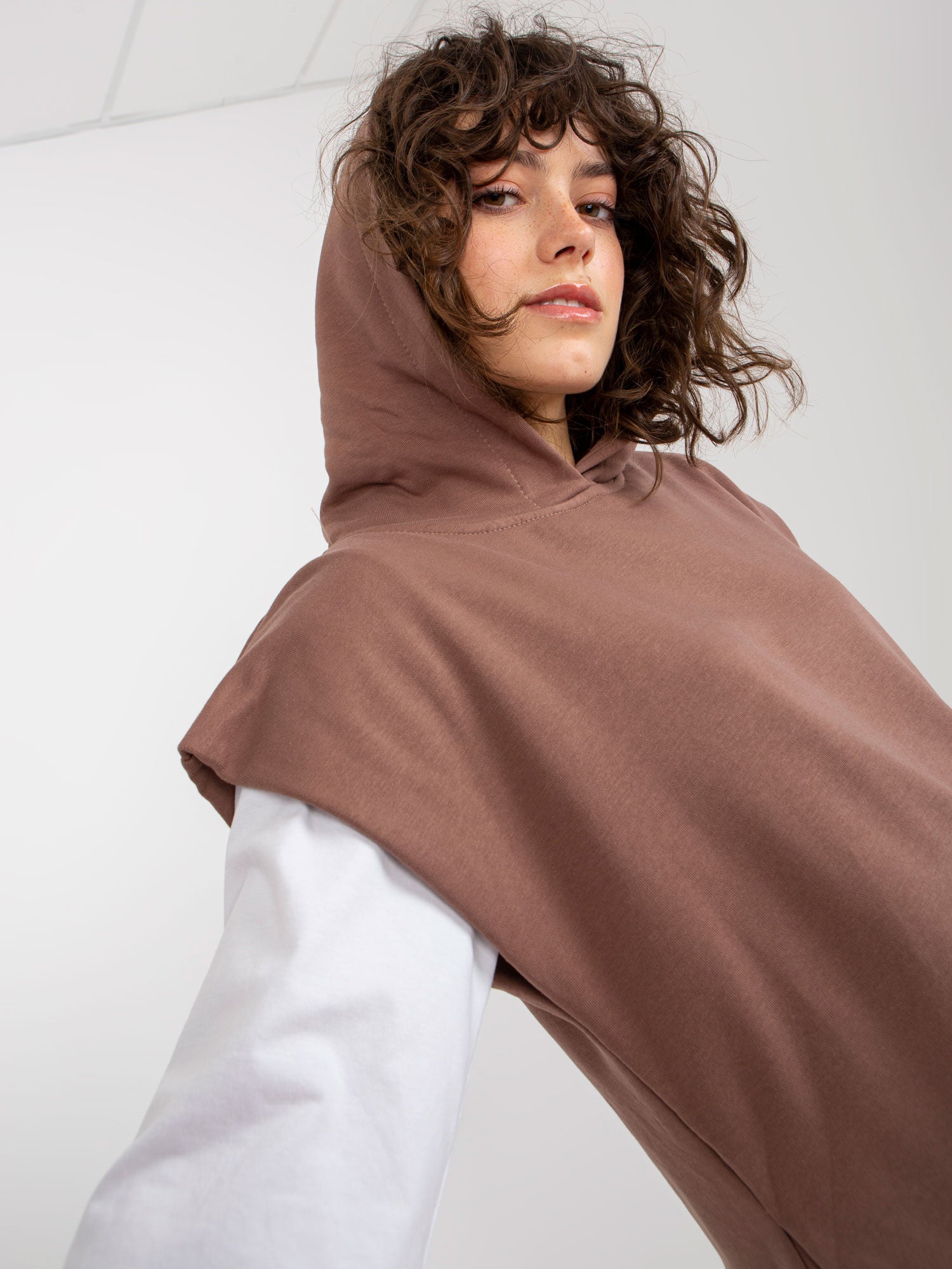 Modelka ma na sobie rozmiar one size. Wymiary modelki: wzrost 177 cm, biust 84 cm, talia 62 cm, biodra 89 cm.