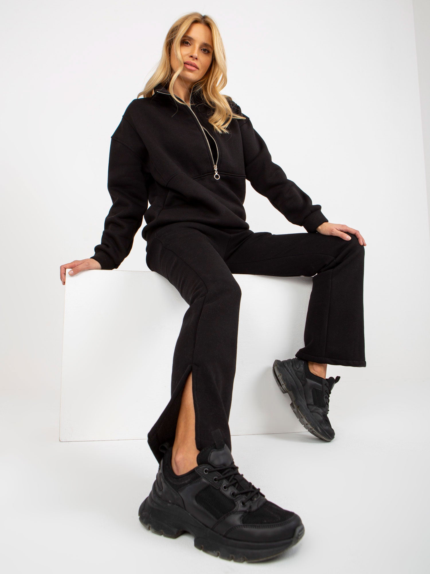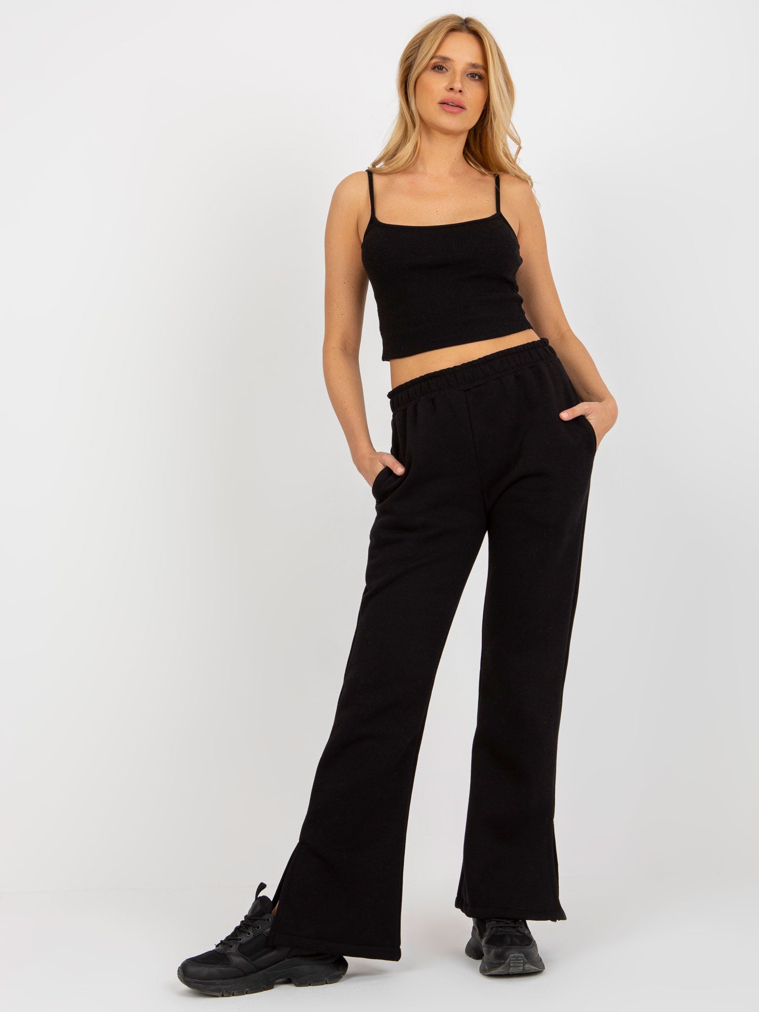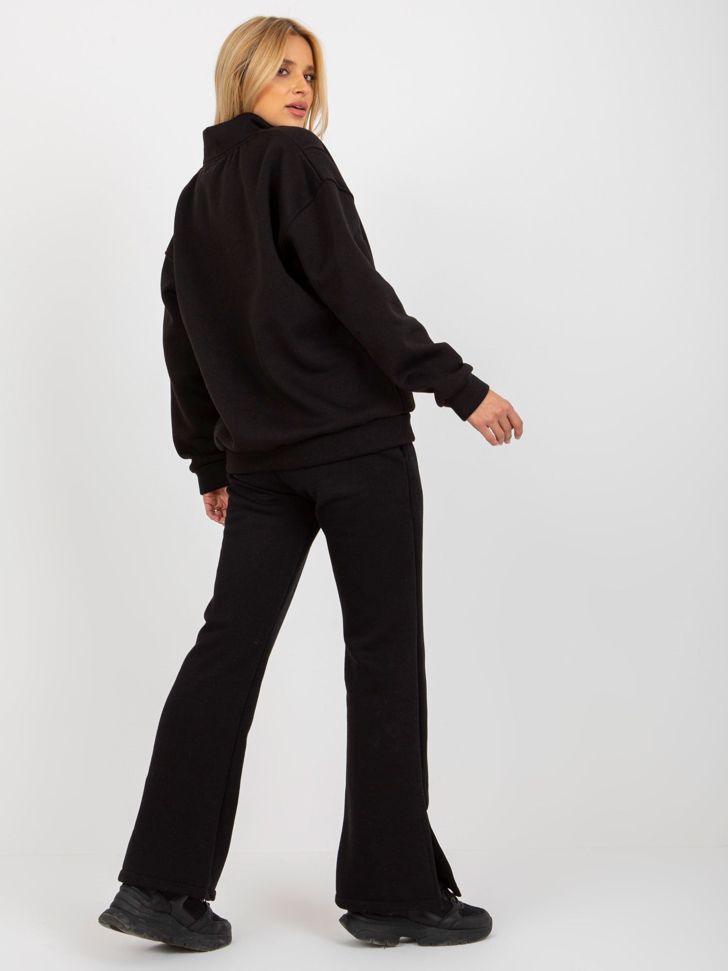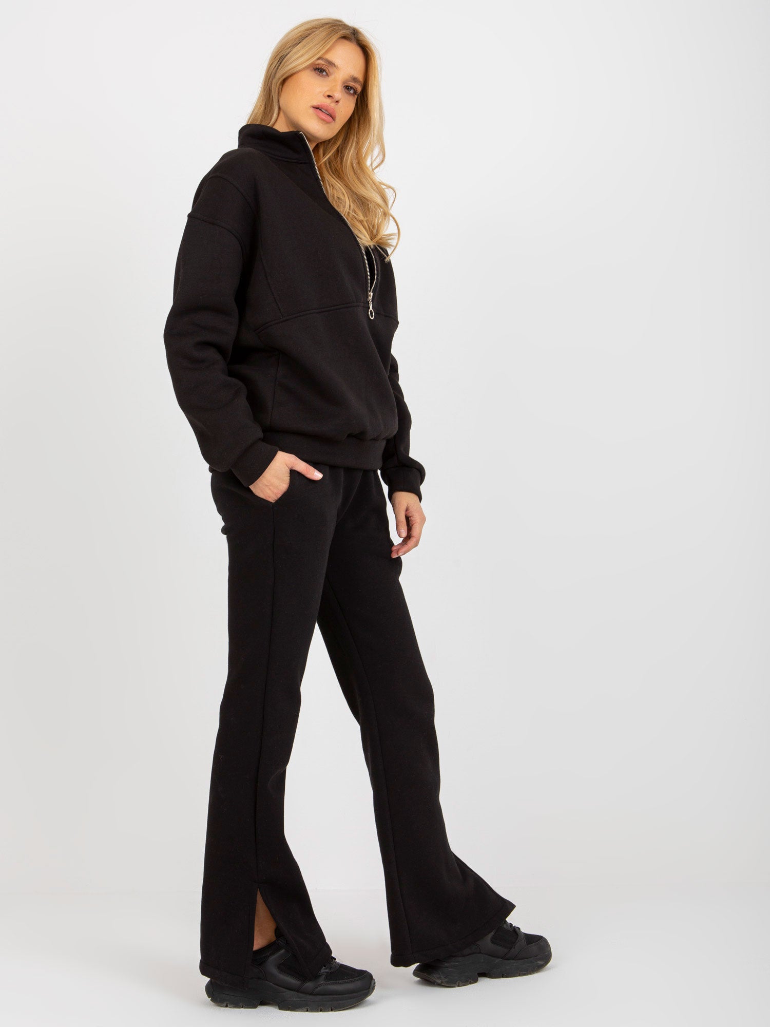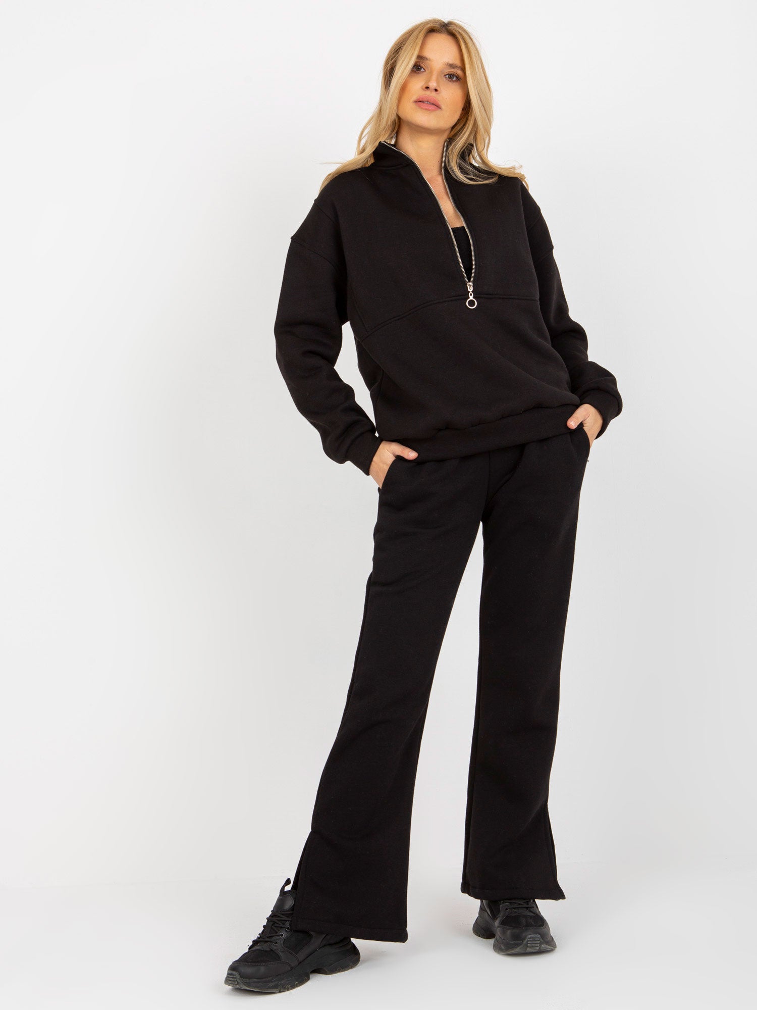 Czarny trzyczęściowy komplet dresowy ze spodniami .