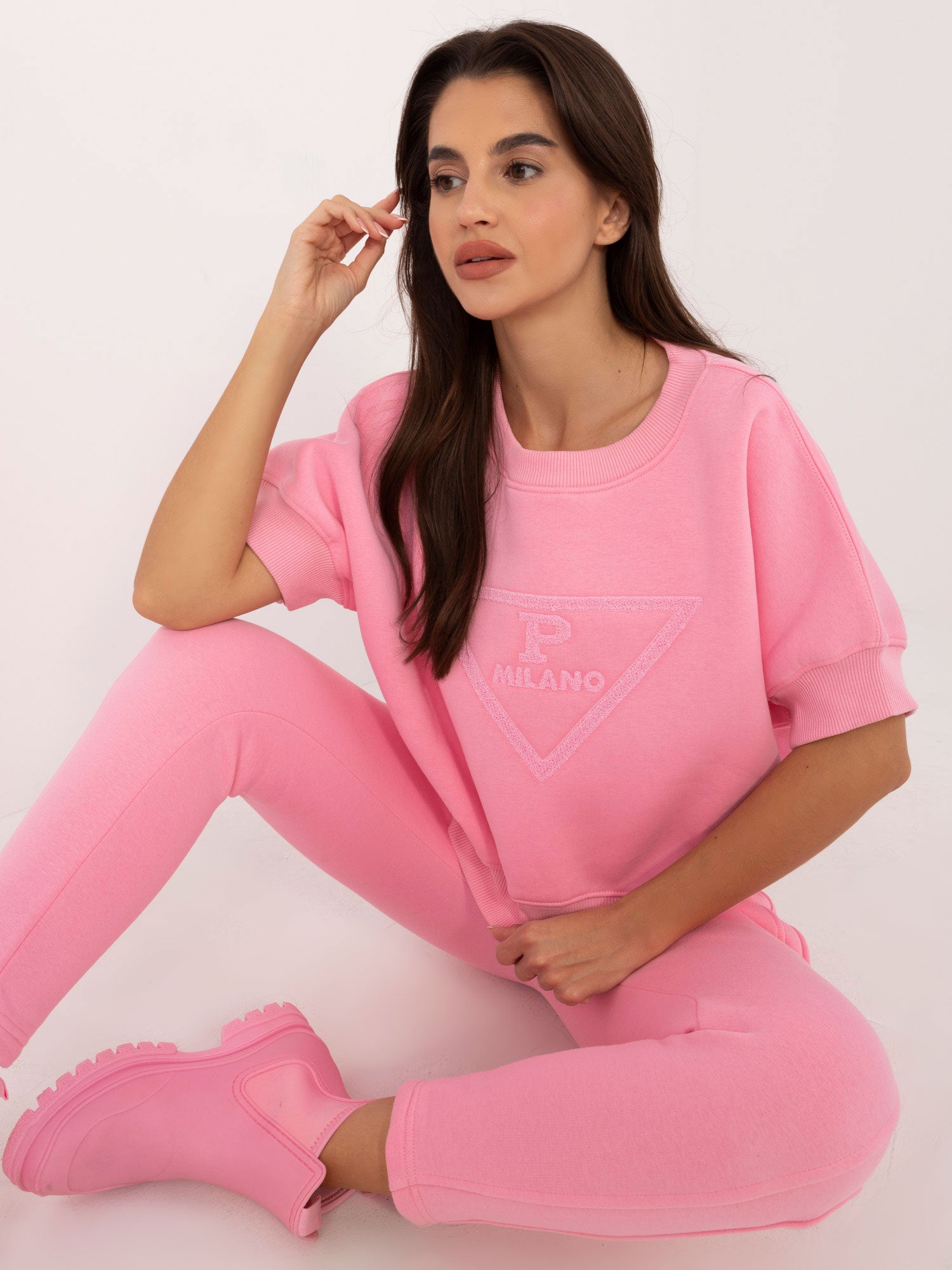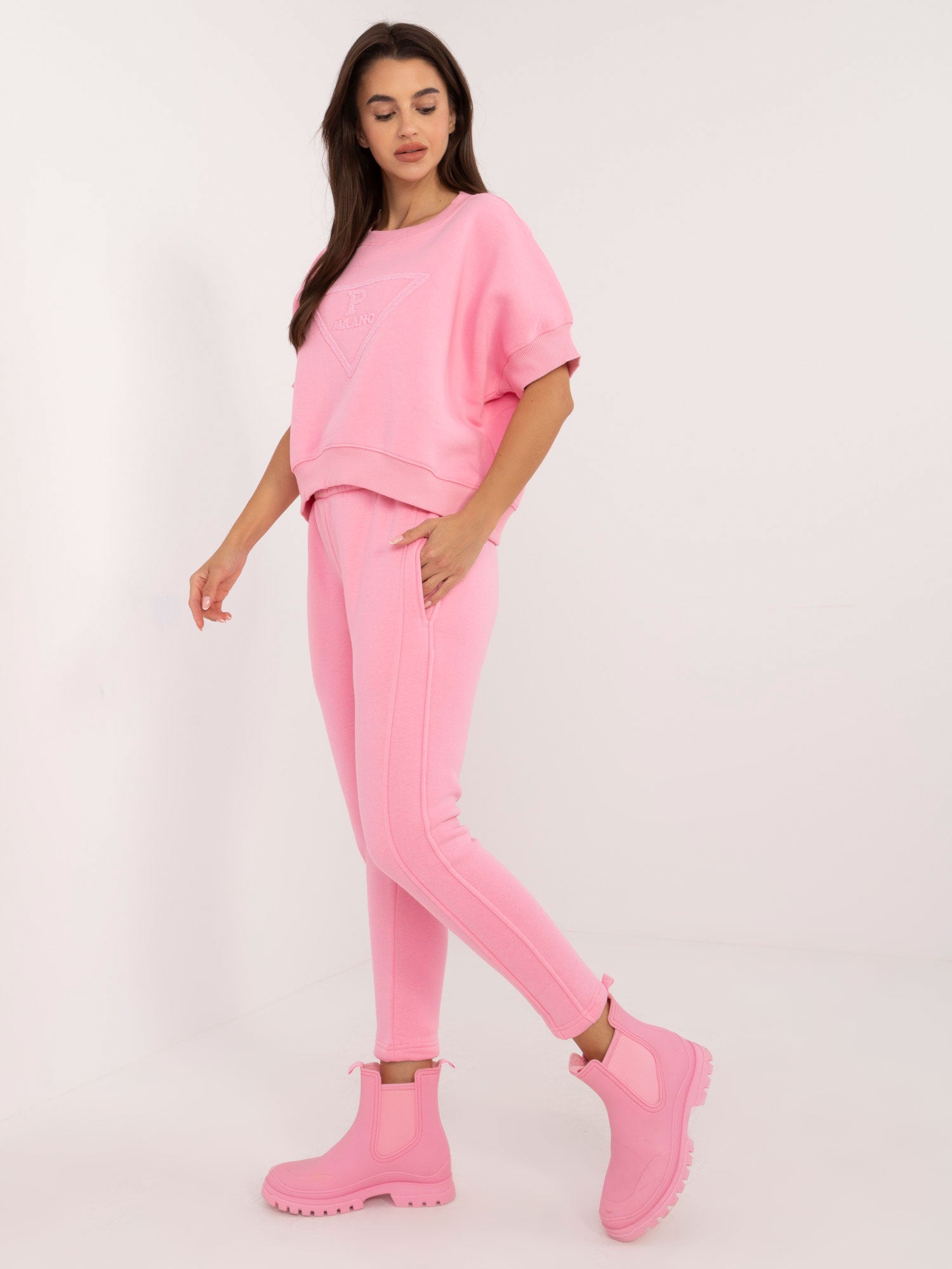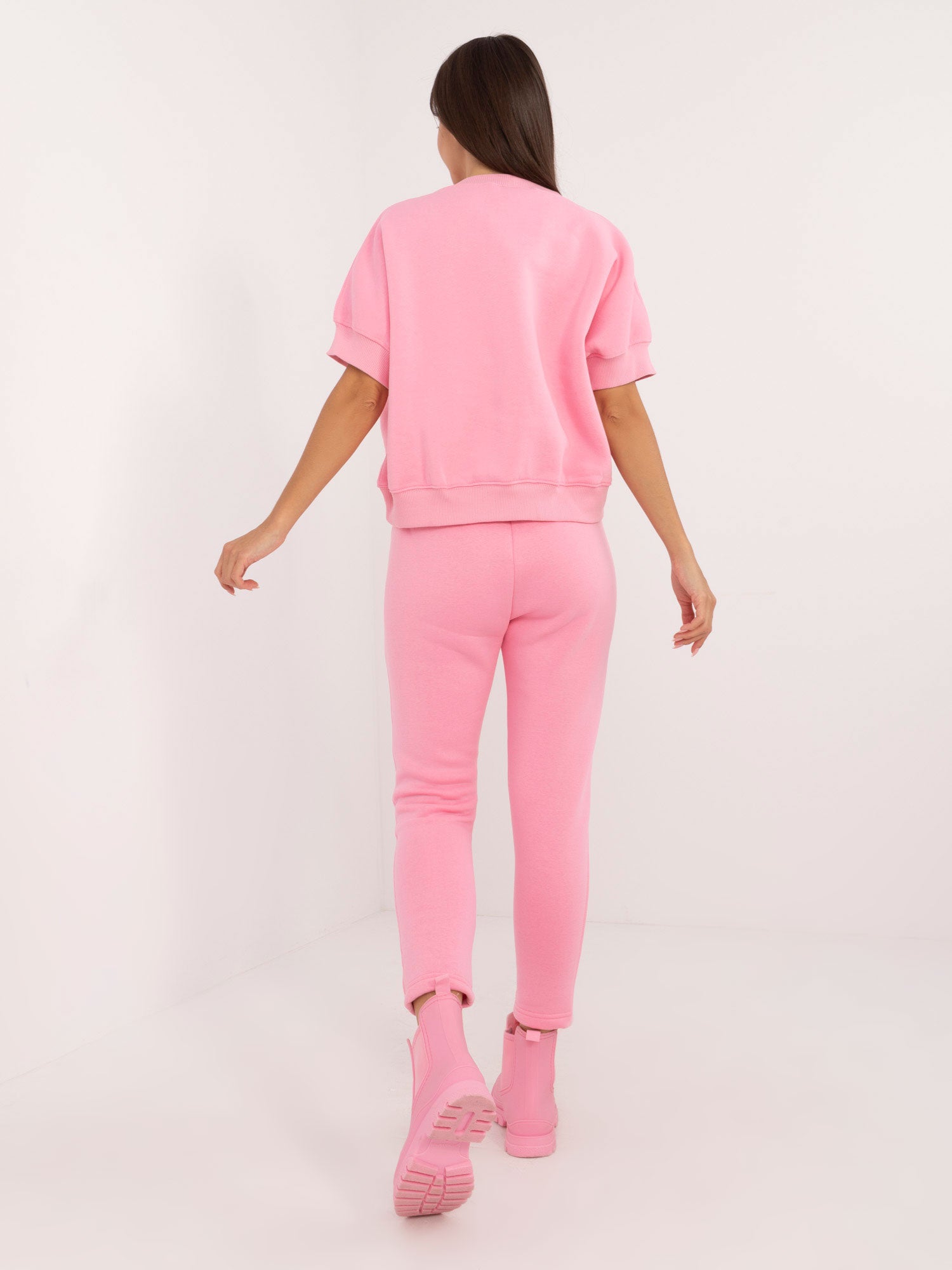Wymiary kompletu w rozmiarze one size mierzone na płasko: szerokość bluzy pod pachami - 72 cm, długość bluzy - 56 cm, szerokość spodni w pasie - 38 cm, wysokość stanu - 34 cm, długość spodni - 97 cm.