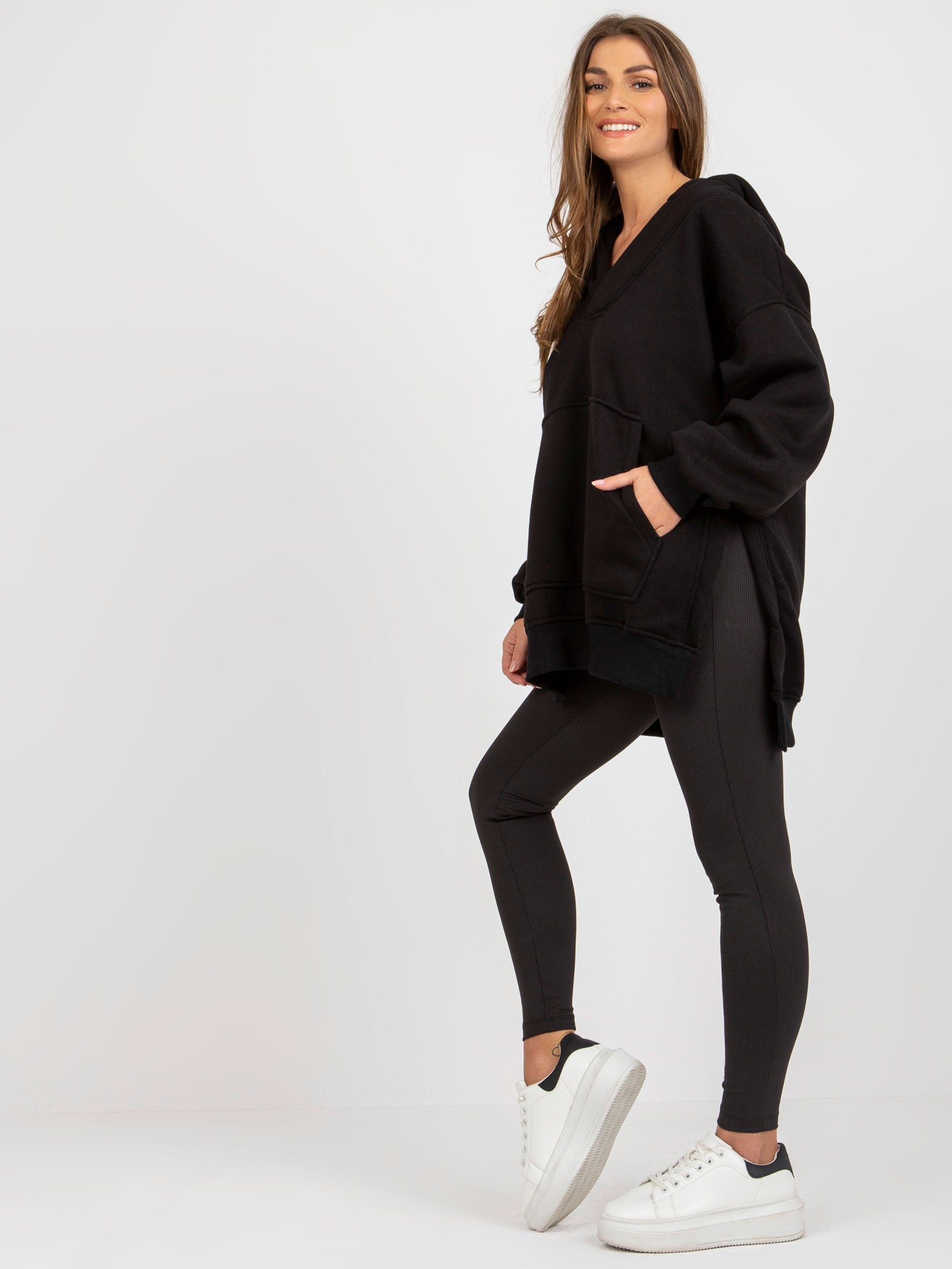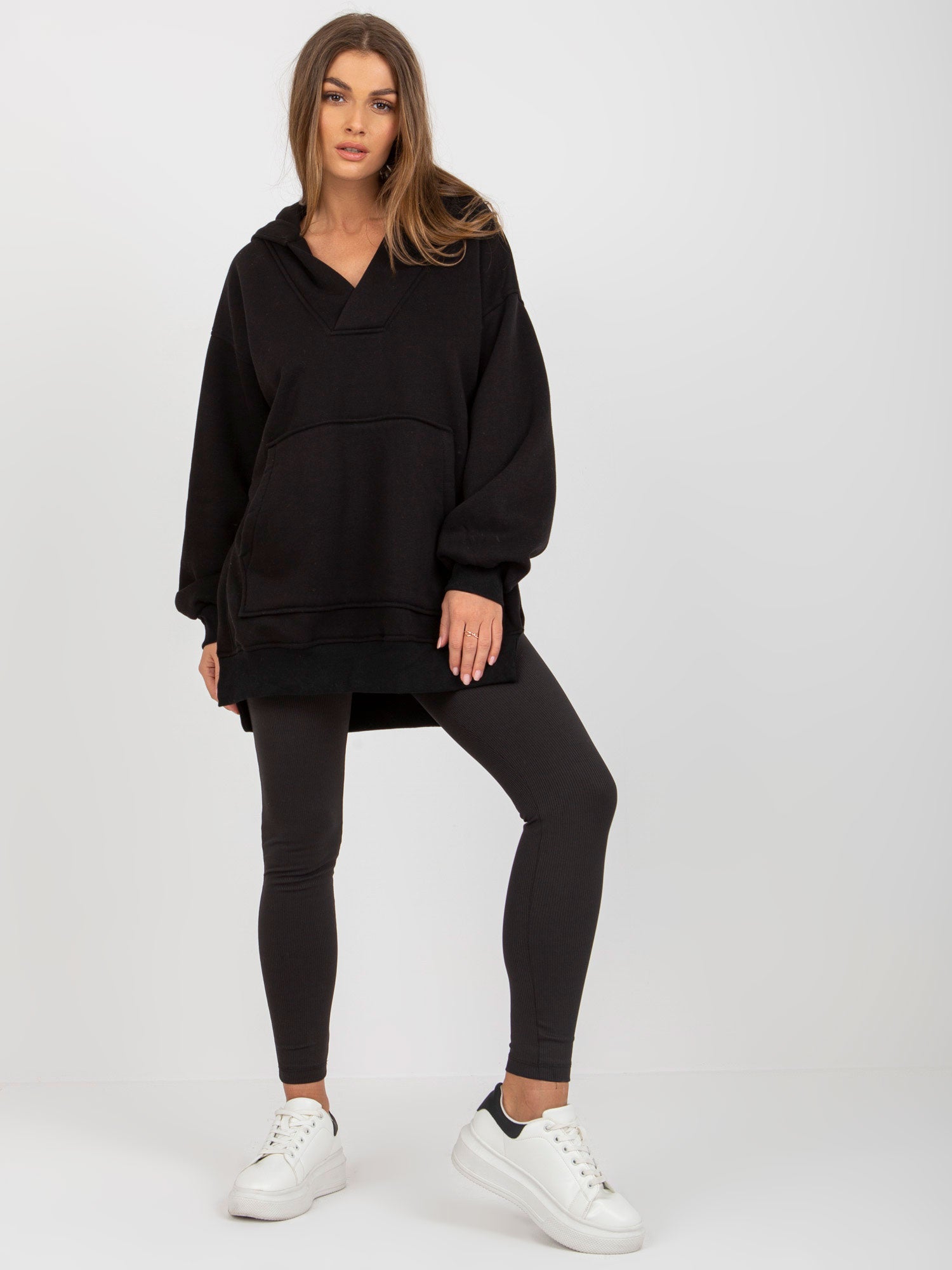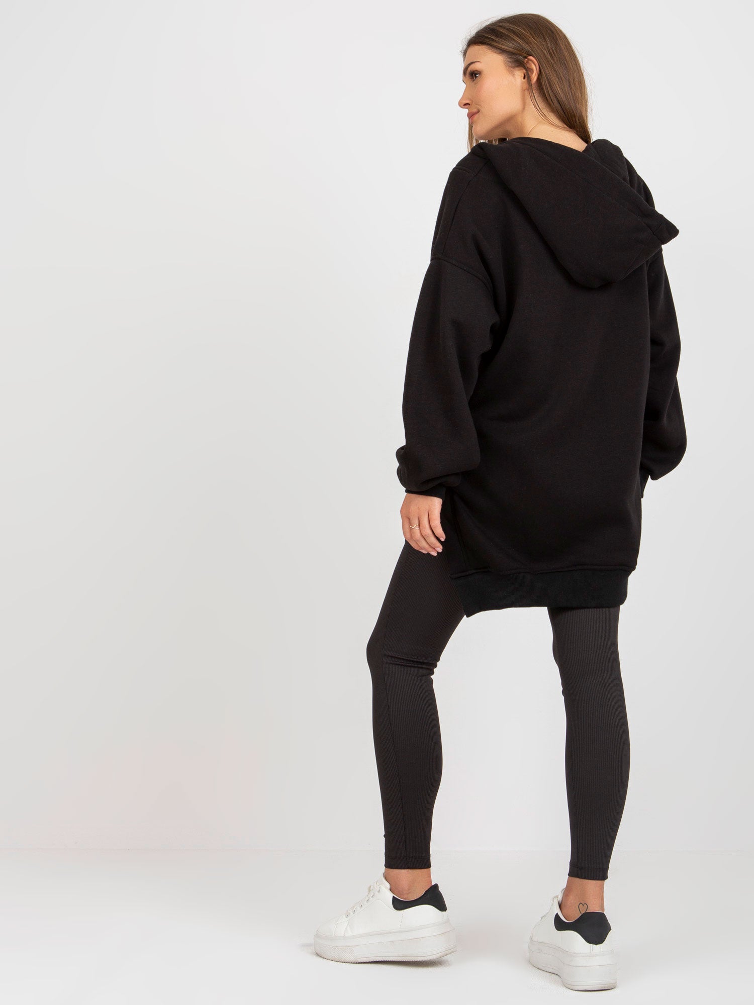 Wymiary kompletu w rozmiarze one size mierzone na płasko: szerokość bluzy pod pachami - 62 cm, długość rękawa - 64 cm, długość bluzy (przód) - 70 cm, długość bluzy (tył) - 79 cm, szerokość legginsów w pasie - 33 cm, wysokość stanu - 32 cm, długość legginsów - 91 cm.