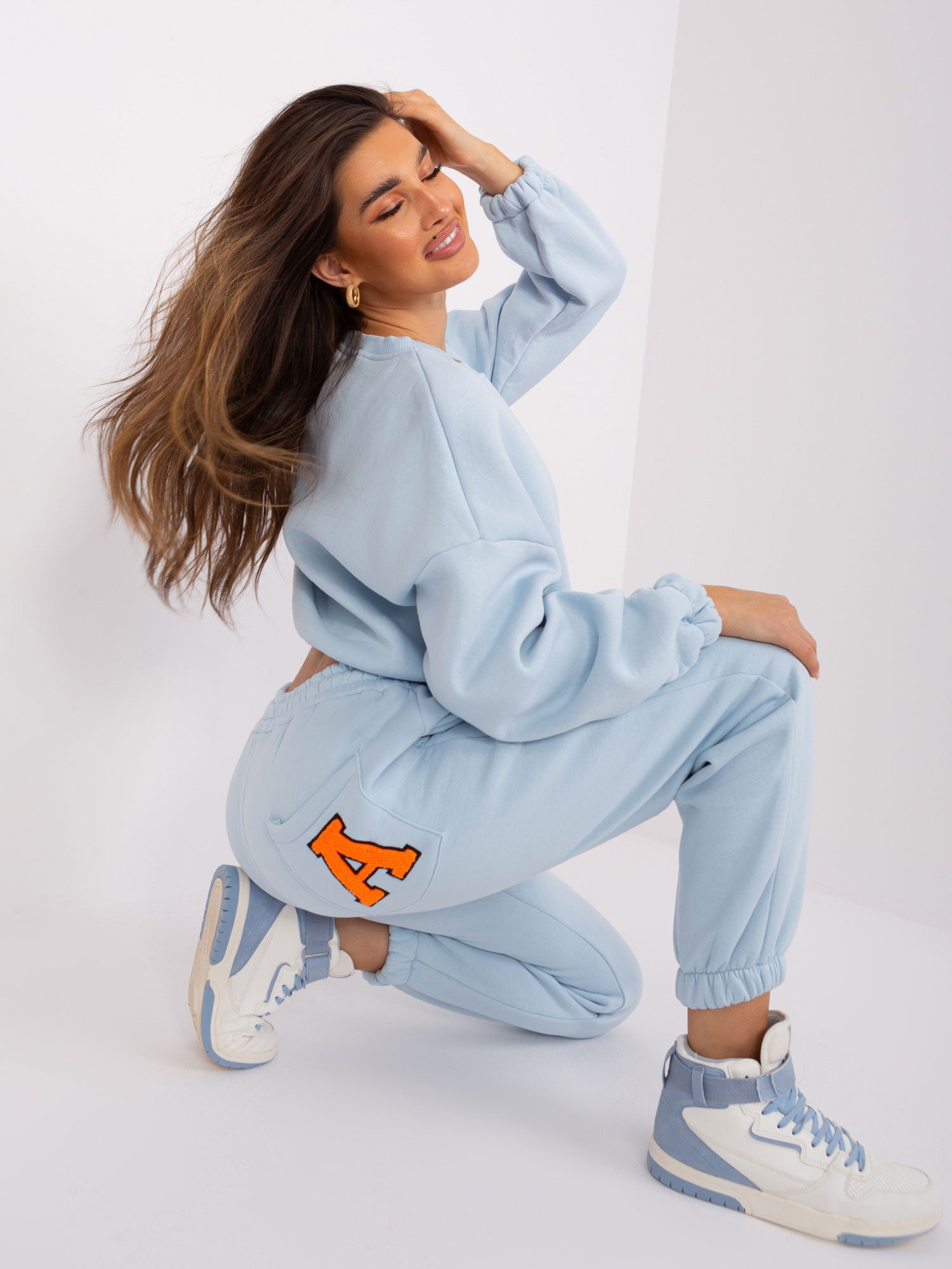 Jasnoniebiesko-fluo pomarańczowy damski komplet dresowy .