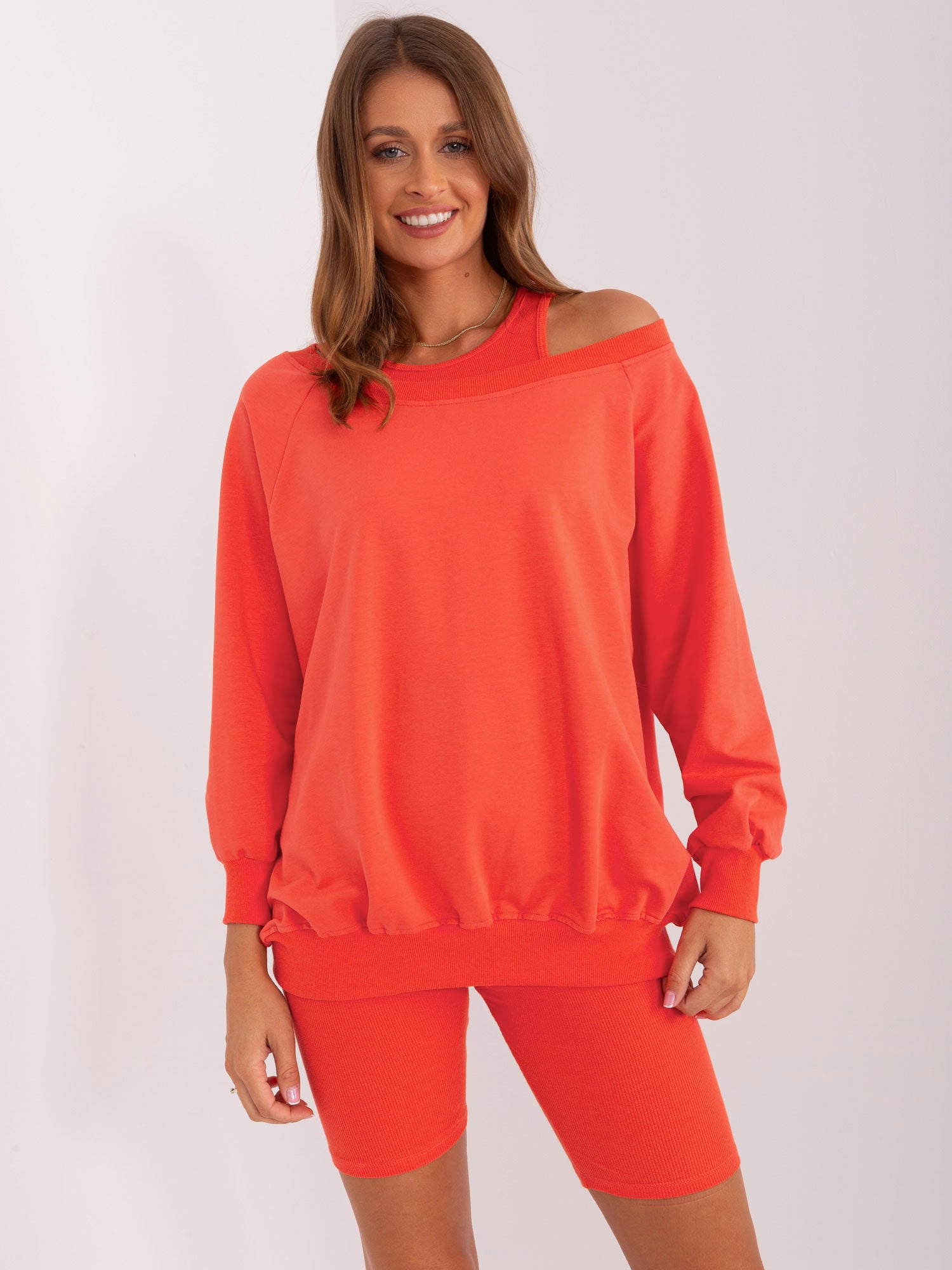 Pomarańczowy komplet casualowy trzyczęściowy z bluzą.