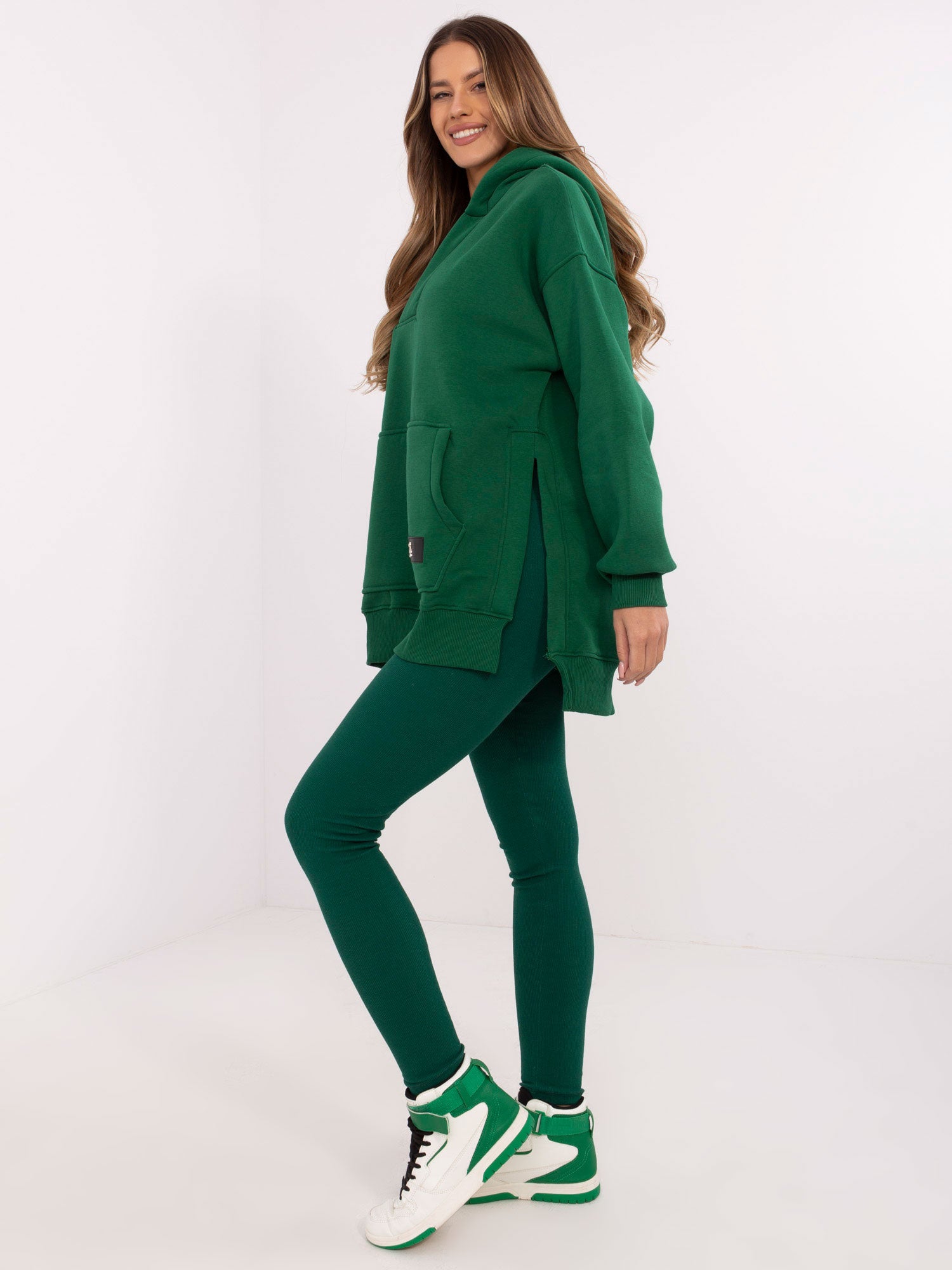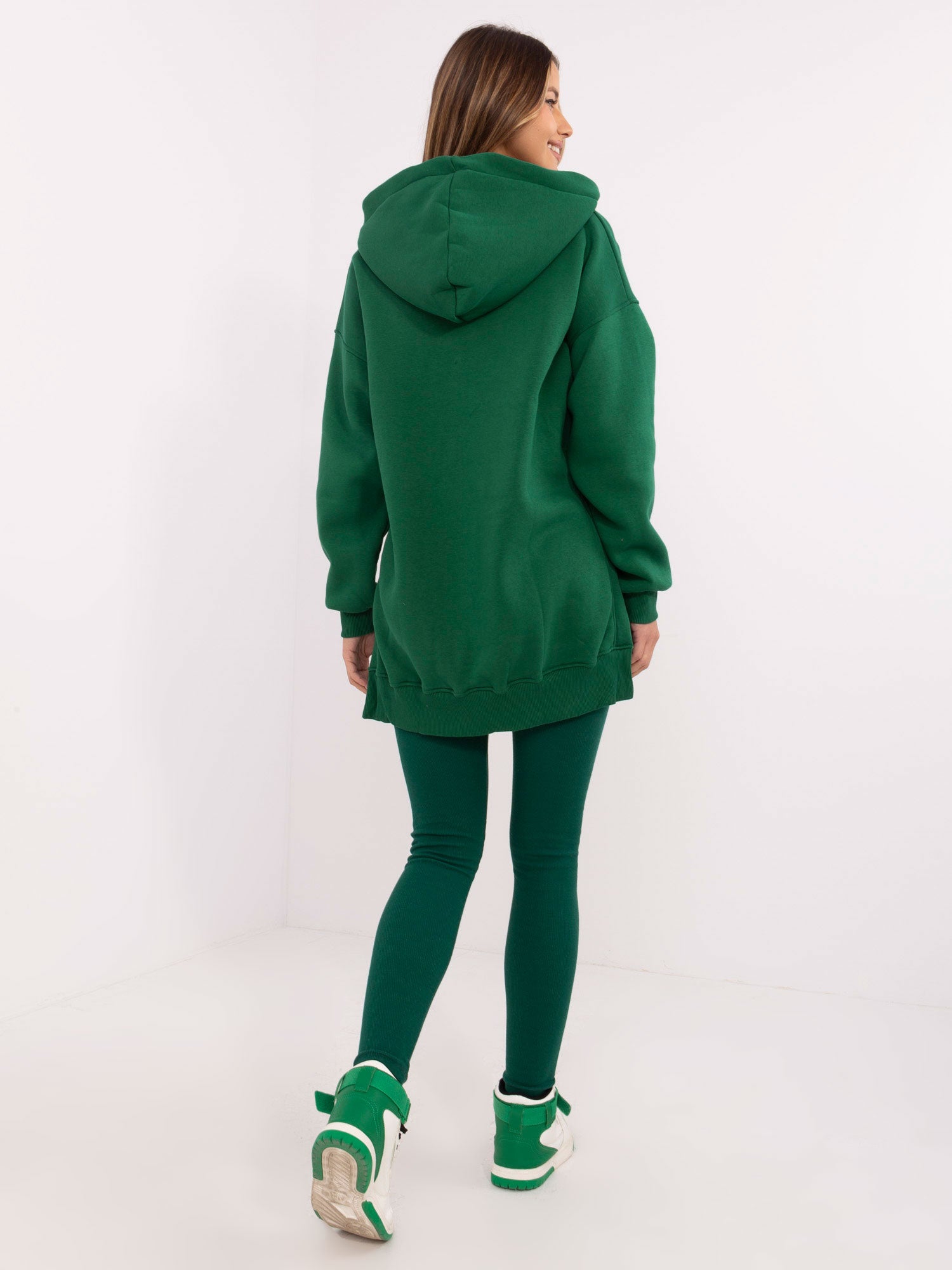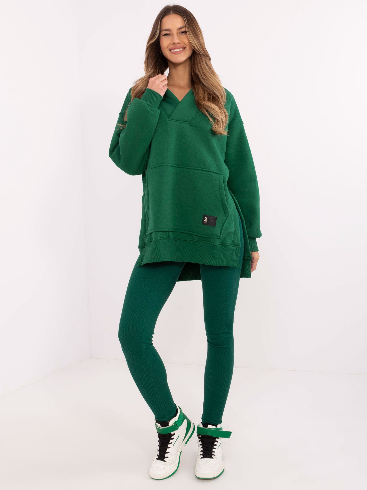 Wymiary bluzy w rozmiarze one size mierzone na płasko: szerokość bluzy pod pachami - 65 cm, długość bluzy - 74 cm (przód), długość bluzy - 83 cm (tył), długość rękawa - 52 cm, obwód w biodrach - 112 cm.