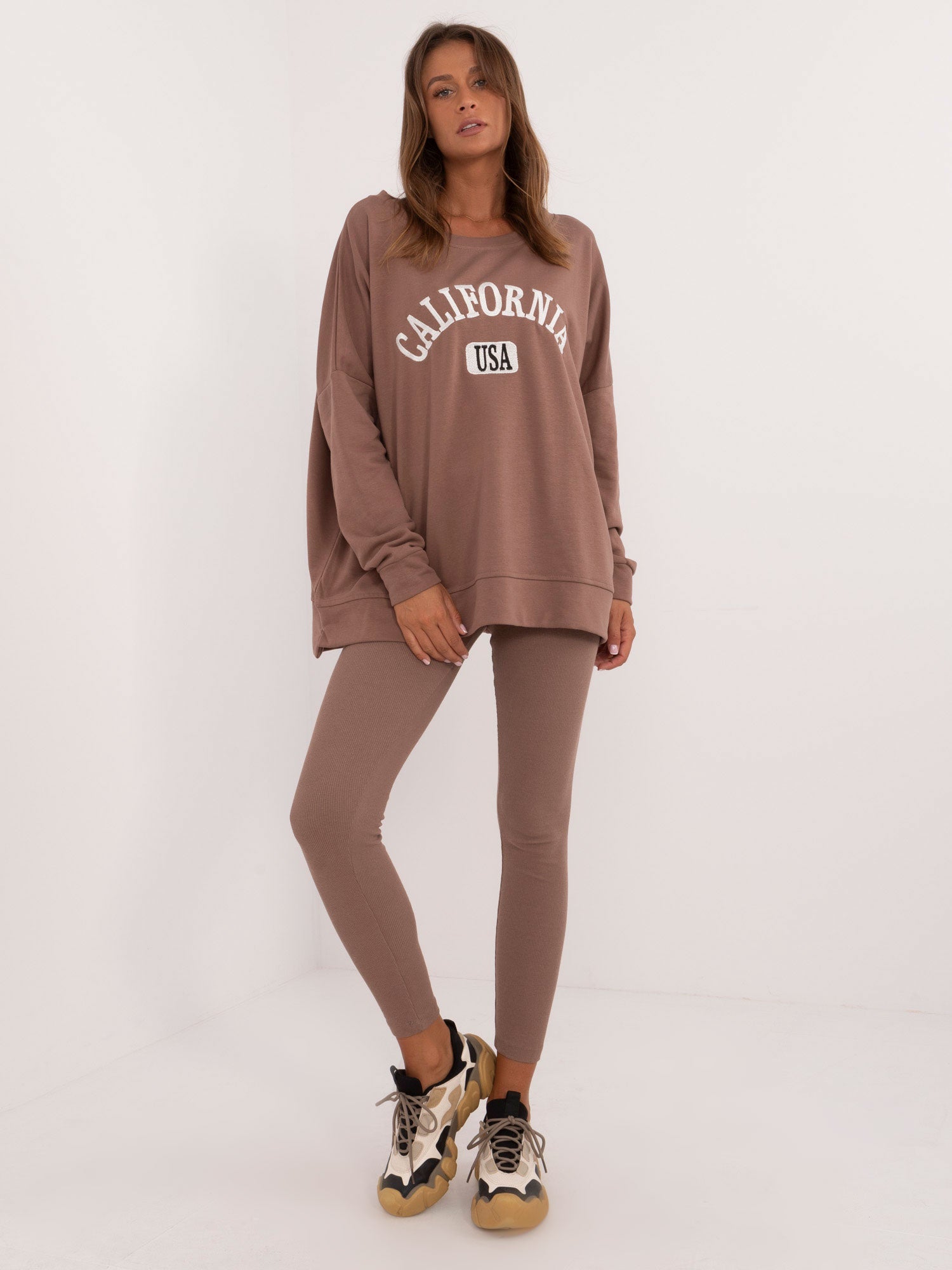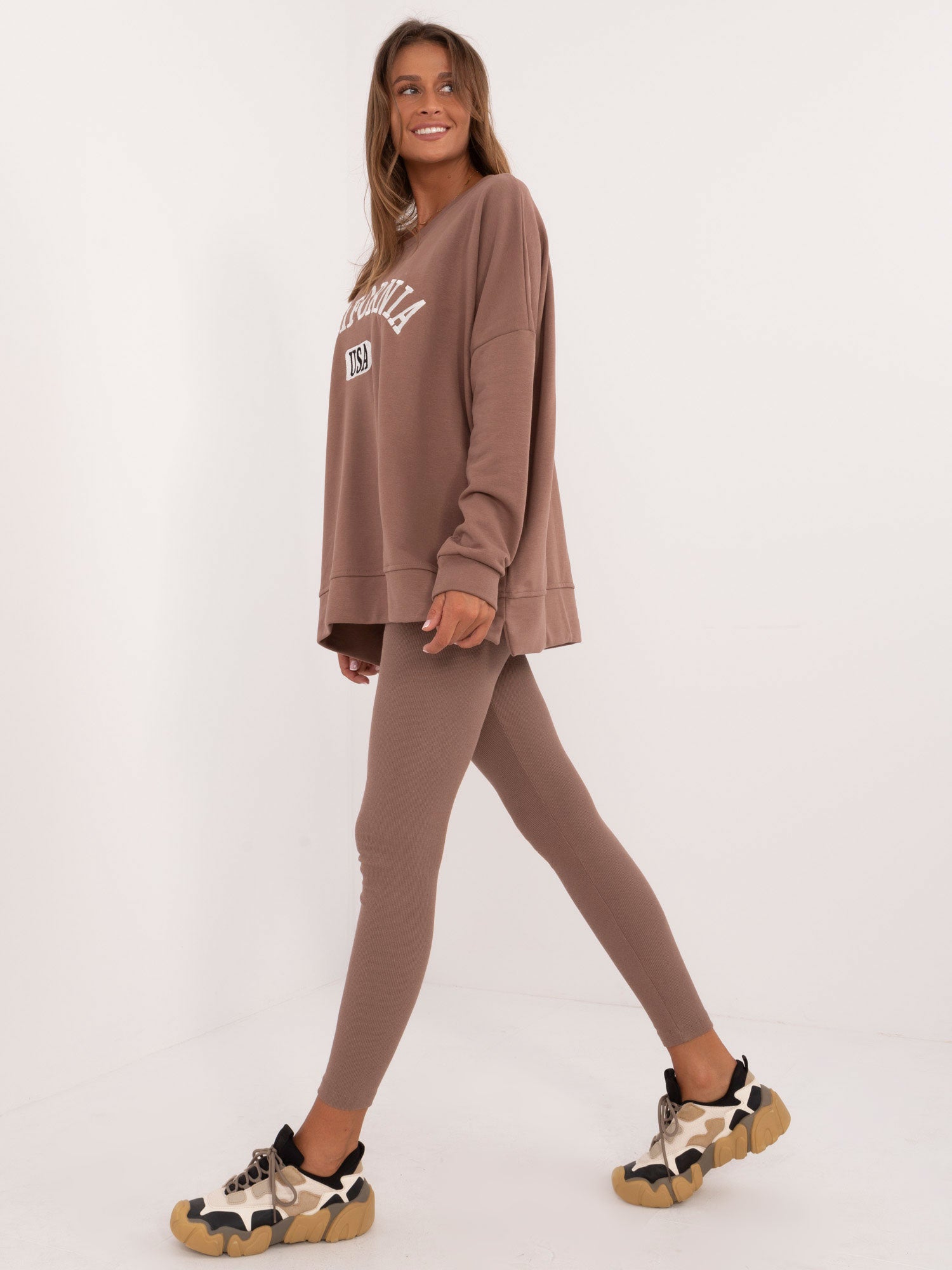 Wymiary kompletu w rozmiarze one size mierzone na płasko: szerokość bluzy pod pachami - 78 cm, długość rękawa - 61 cm, długość bluzy - 70 cm, szerokość legginsów w pasie - 30 cm, wysokość stanu - 31 cm, długość legginsów - 99 cm.