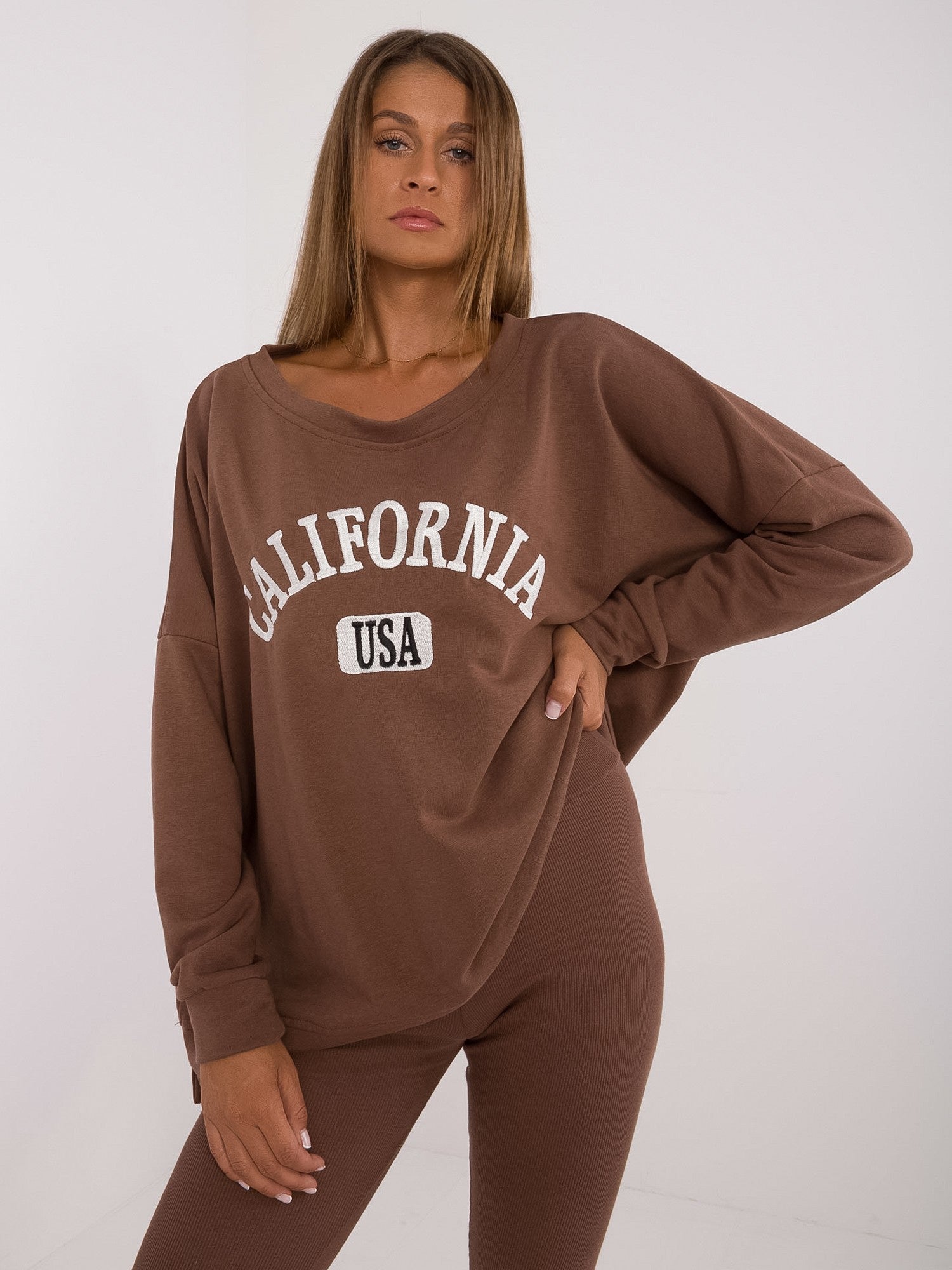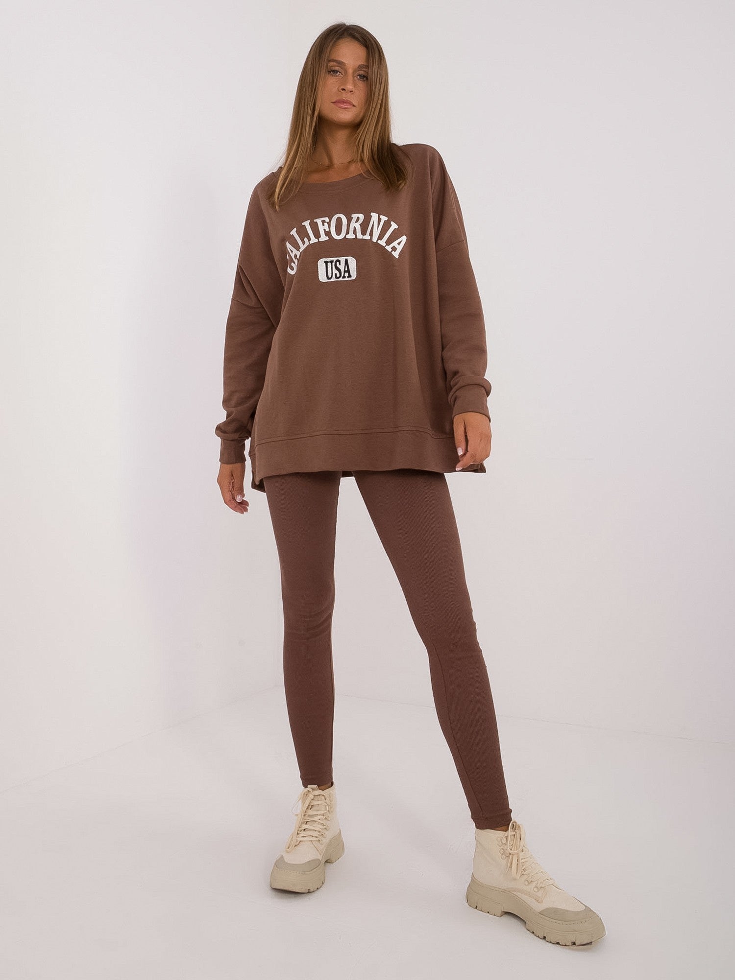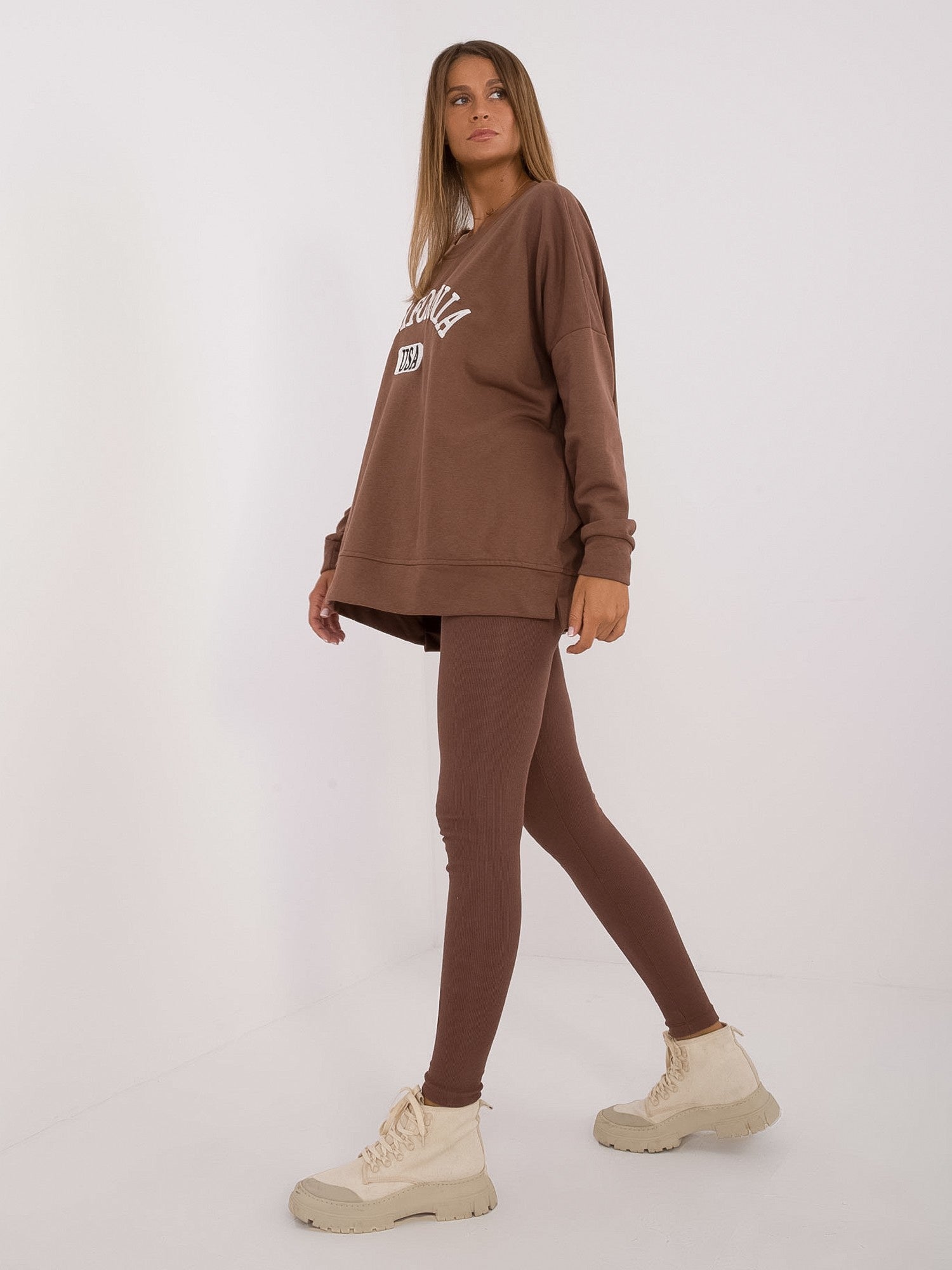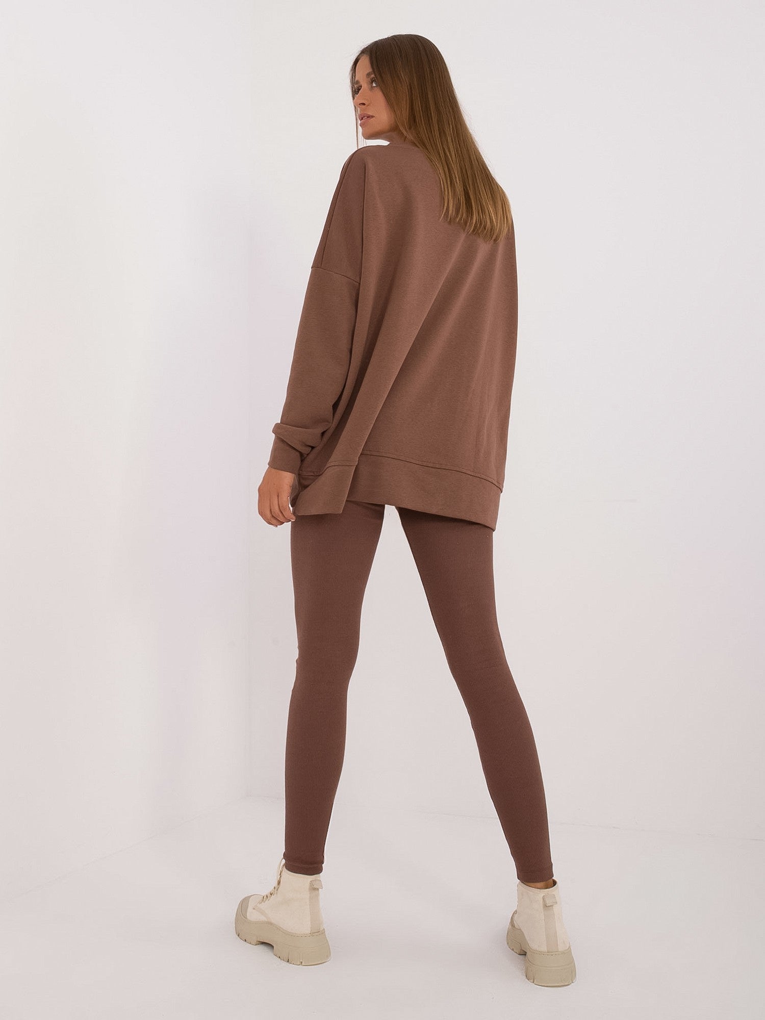 Wymiary kompletu w rozmiarze one size mierzone na płasko: szerokość bluzy pod pachami - 78 cm, długość rękawa - 61 cm, długość bluzy - 70 cm, szerokość legginsów w pasie - 30 cm, wysokość stanu - 31 cm, długość legginsów - 99 cm.