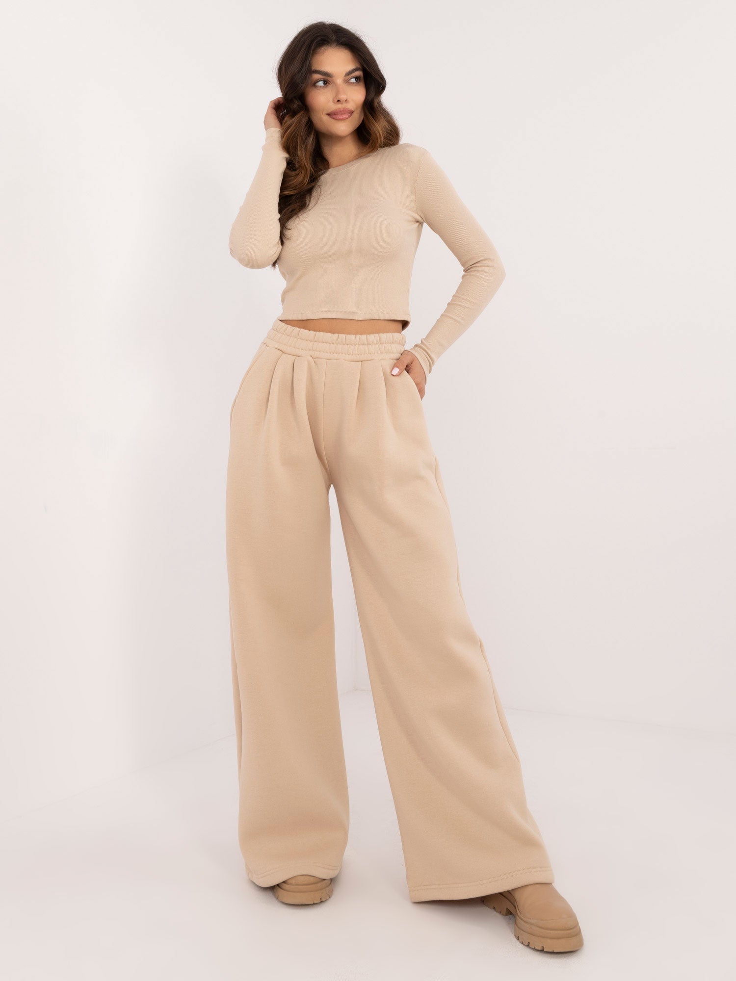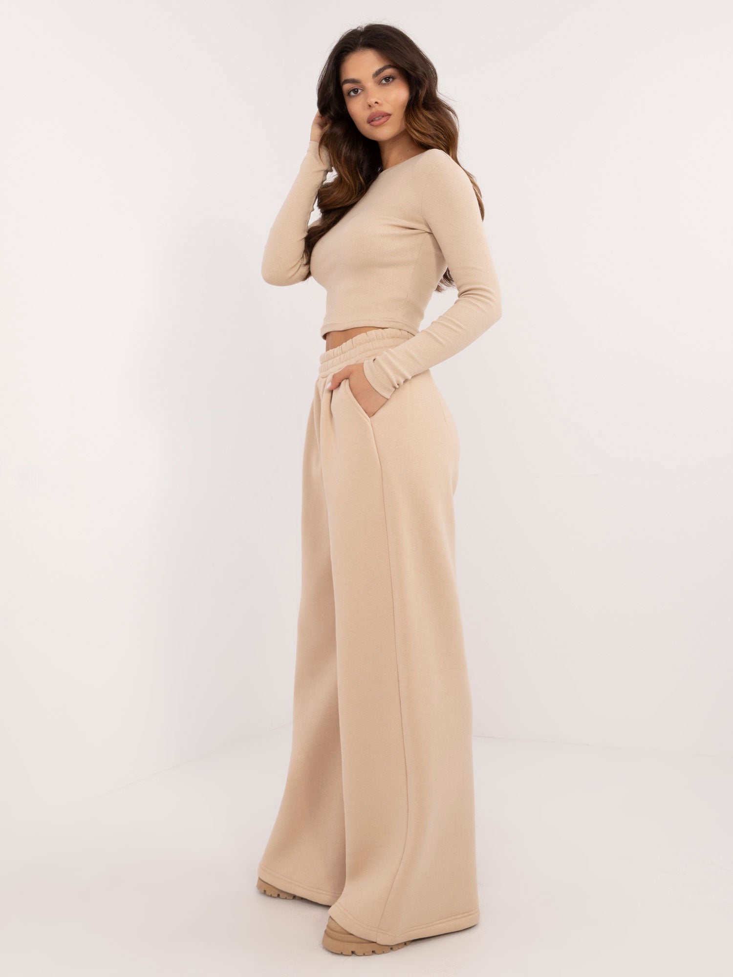 Wymiary kompletu w rozmiarze one size mierzone na płasko: szerokość bluzki pod pachami - 40 cm, długość bluzki - 45 cm, długość rękawa - 55 cm, szerokość spodni w pasie - 34 cm, długość spodni - 115 cm.