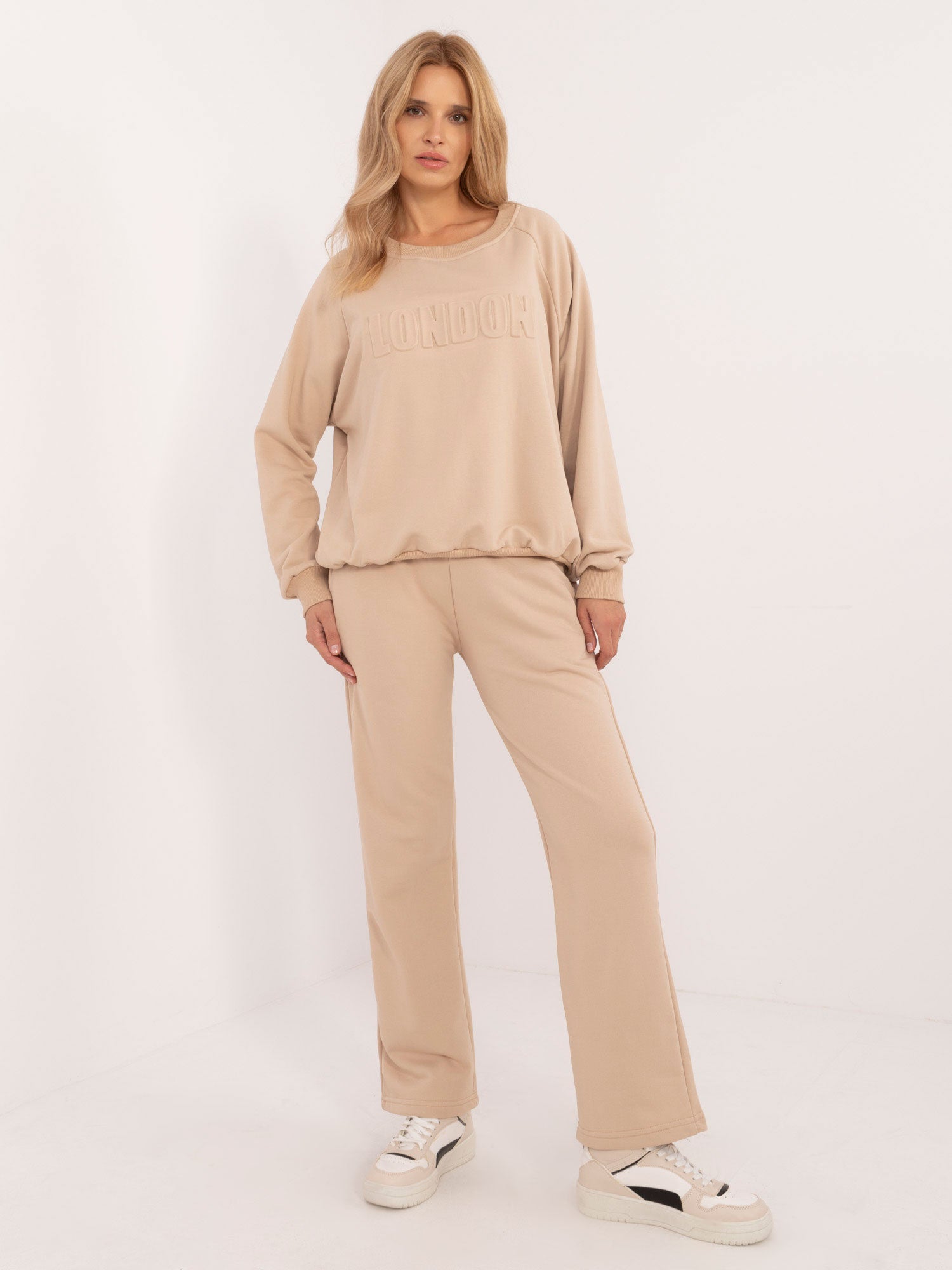 Wymiary kompletu w rozmiarze one size mierzone na płasko: szerokość bluzy pod pachami - 68 cm, długość bluzy - 67 cm, długość rękawa - 64 cm, szerokość spodni w pasie - 33 cm, wysokość stanu - 34 cm, długość spodni - 105 cm.