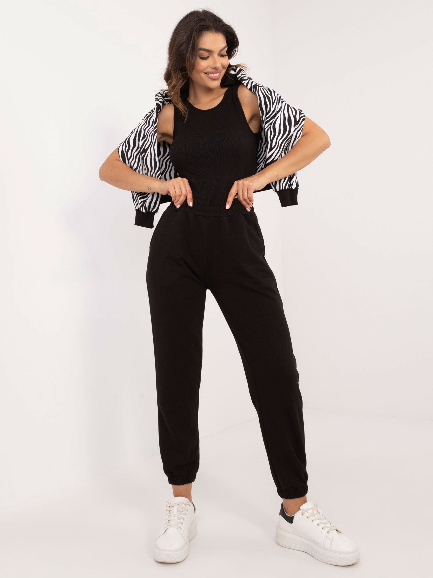 Wymiary kompletu w rozmiarze one size mierzone na płasko: szerokość bluzki pod pachami - 58 cm, długość bluzki - 52 cm, długość rękawa - 55 cm, szerokość topu pod pachami - 40 cm, długość topu - 49 cm, szerokość spodni w pasie - 34 cm, długość spodni - 96 cm.