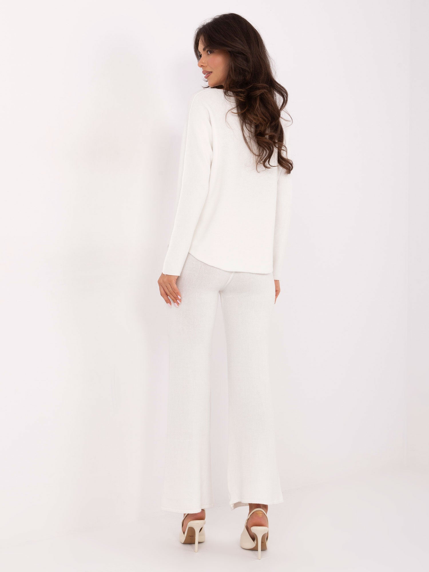 Wymiary kompletu w rozmiarze one size mierzone na płasko: szerokość swetra pod pachami - 52 cm, długość swetra - 65 cm, długość rękawa - 57 cm, szerokość spodni w pasie - 35 cm (na płasko), szerokość spodni w pasie - 52 cm (po rozciągnięciu), długość spodni - 107 cm.