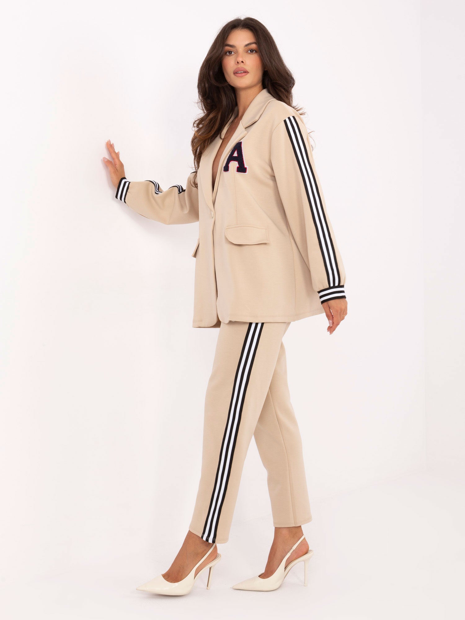 Wymiary kompletu w rozmiarze one size : szerokość pod pachami - 60 cm, długość marynarki - 75 cm, długość rękawa - 58 cm (od szwu), szerokość w biodrach - 54 cm, szerokość spodni w pasie - 37 cm (na płasko), szerokość spodni w pasie - 65 cm (po rozciągnięciu), szerokość w biodrach - 52 cm, długość spodni - 97 cm.