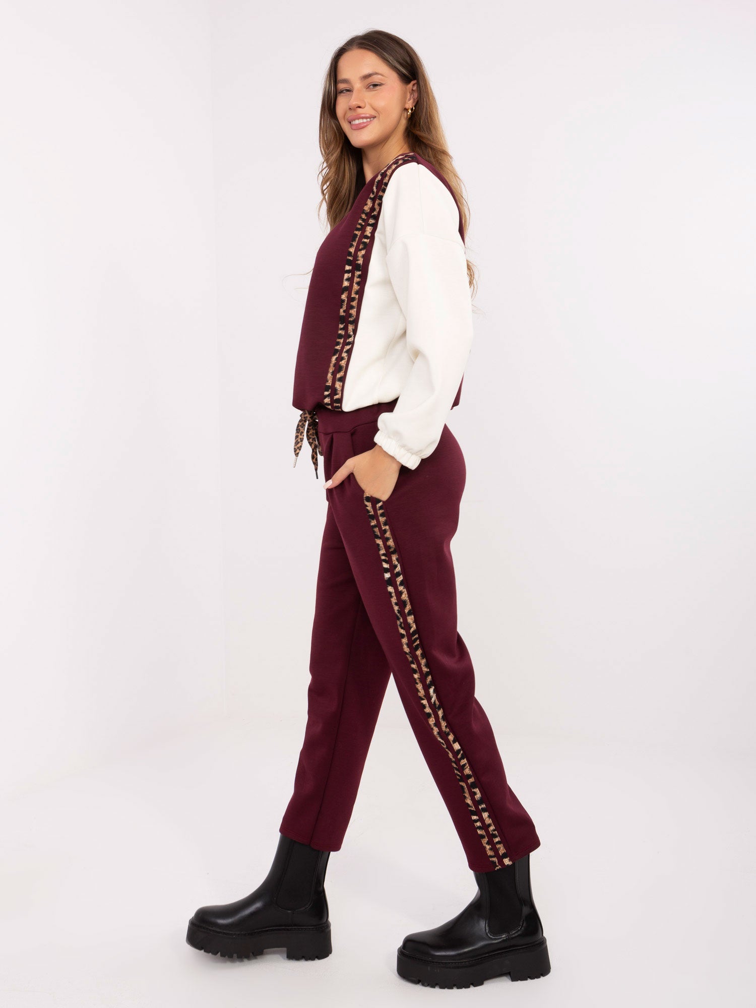Wymiary kompletu w rozmiarze one size: szerokość pod pachami - 61 cm, długość bluzy - 61 cm, długość rękawa - 43 cm (od szwu), szerokość na dole - 36 cm, szerokość spodni w pasie - 33 cm (na płasko), szerokość spodni w pasie - 57 cm (po rozciągnięciu), szerokość w biodrach - 52 cm, długość spodni - 89 cm.