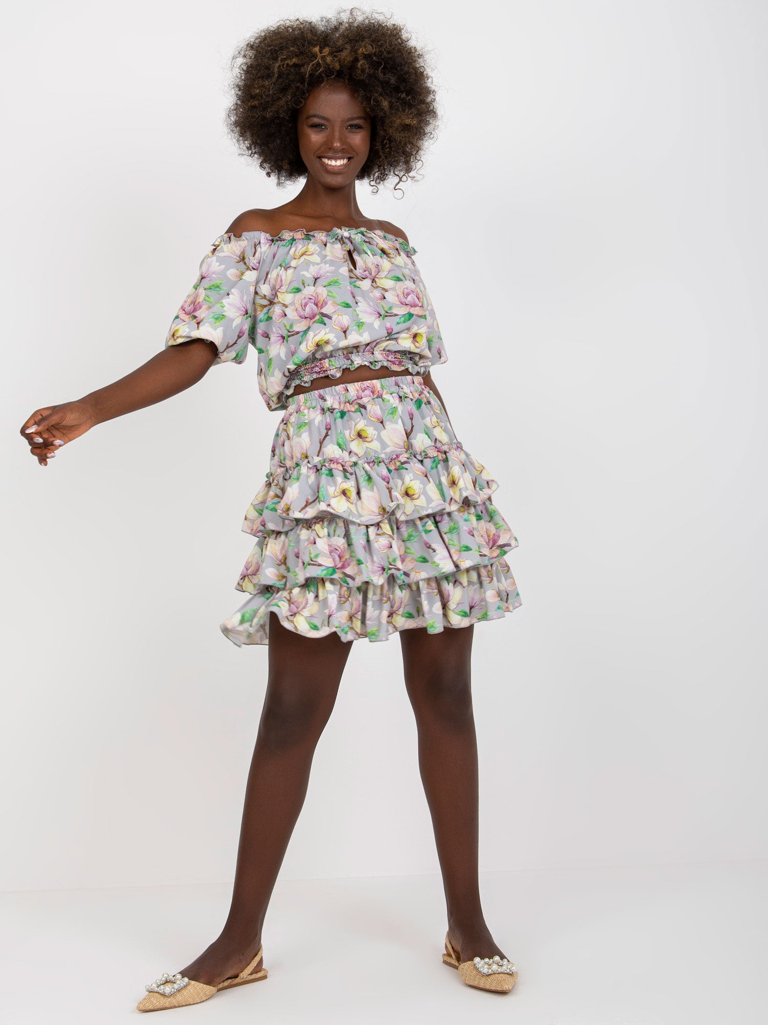 Wymiary kompletu w rozmiarze S/M mierzone na płasko: szerokość bluzki pod pachami - 45 cm, długość bluzki - 47 cm, szerokość spódnicy w pasie - 33 cm, długość spódnicy - 44 cm.